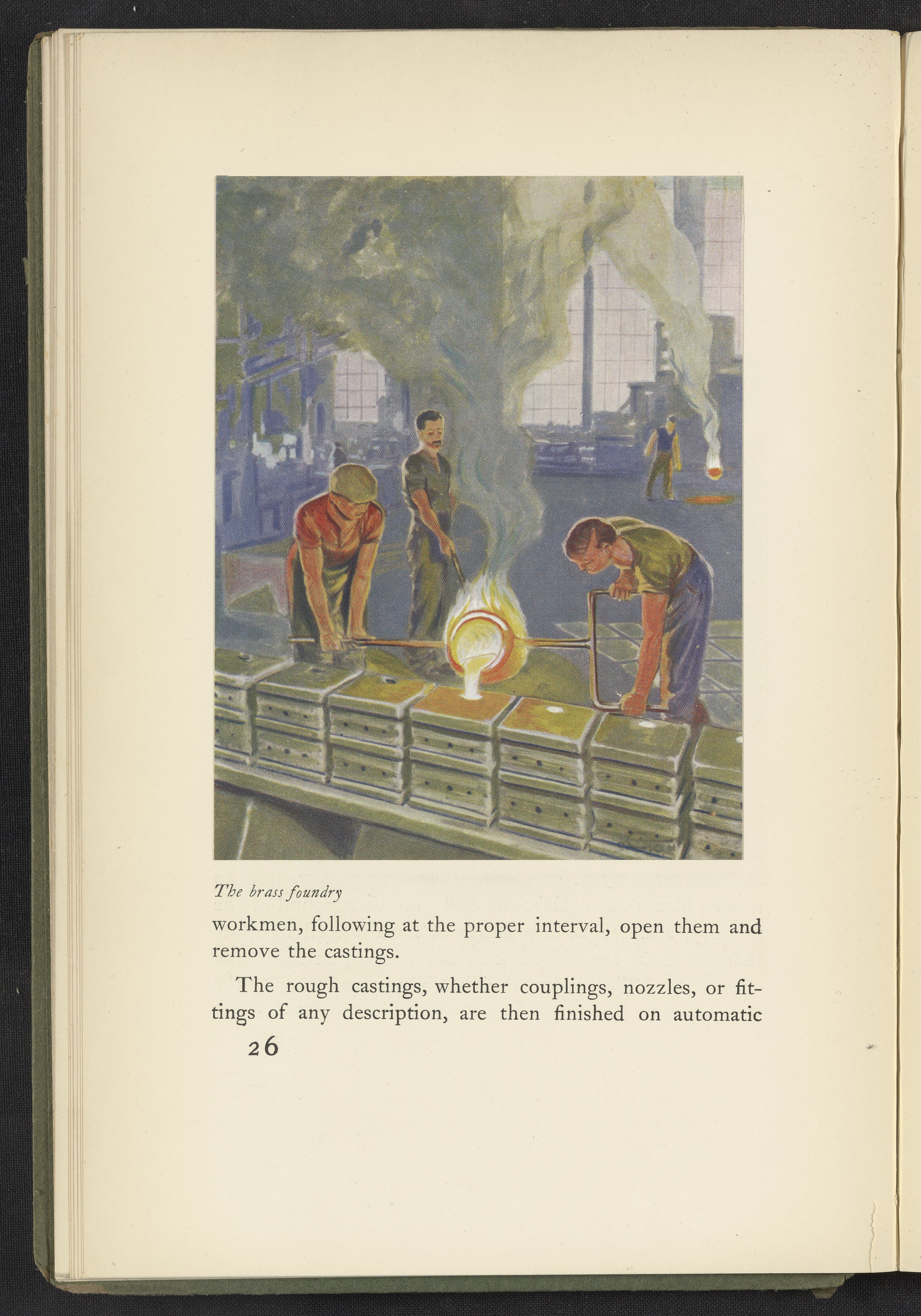 A color illustration of men in a factory creating brass couplings or nozzles. They are pouring molten metal into a mould.
