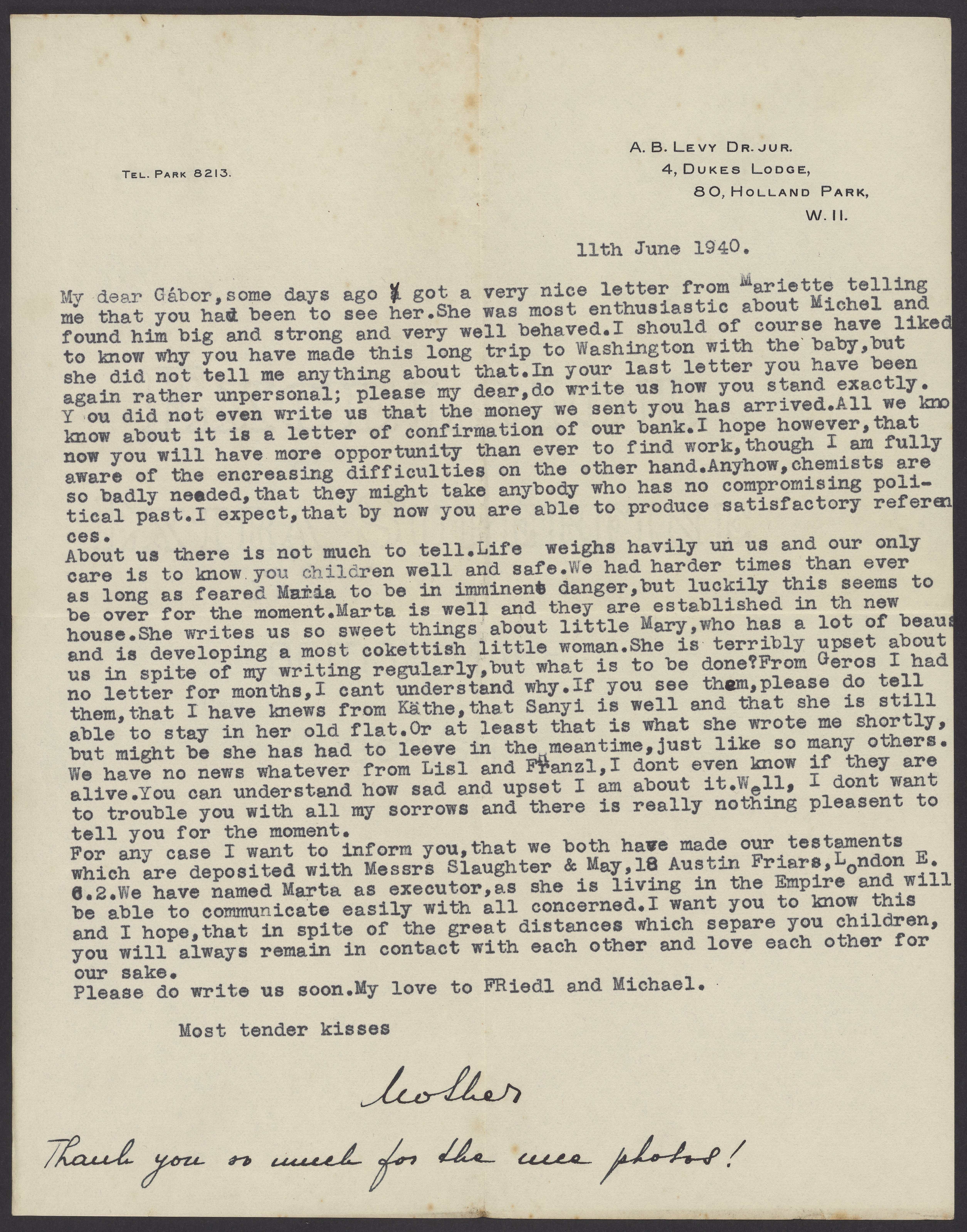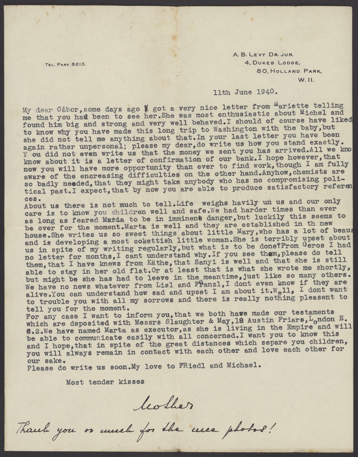 Letter to Gabor B. Levy from Margaret Levy, June 11, 1940