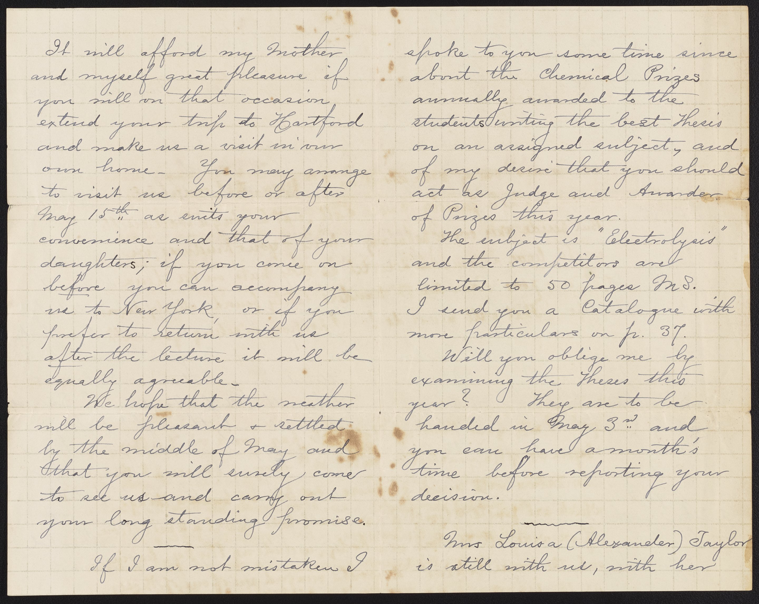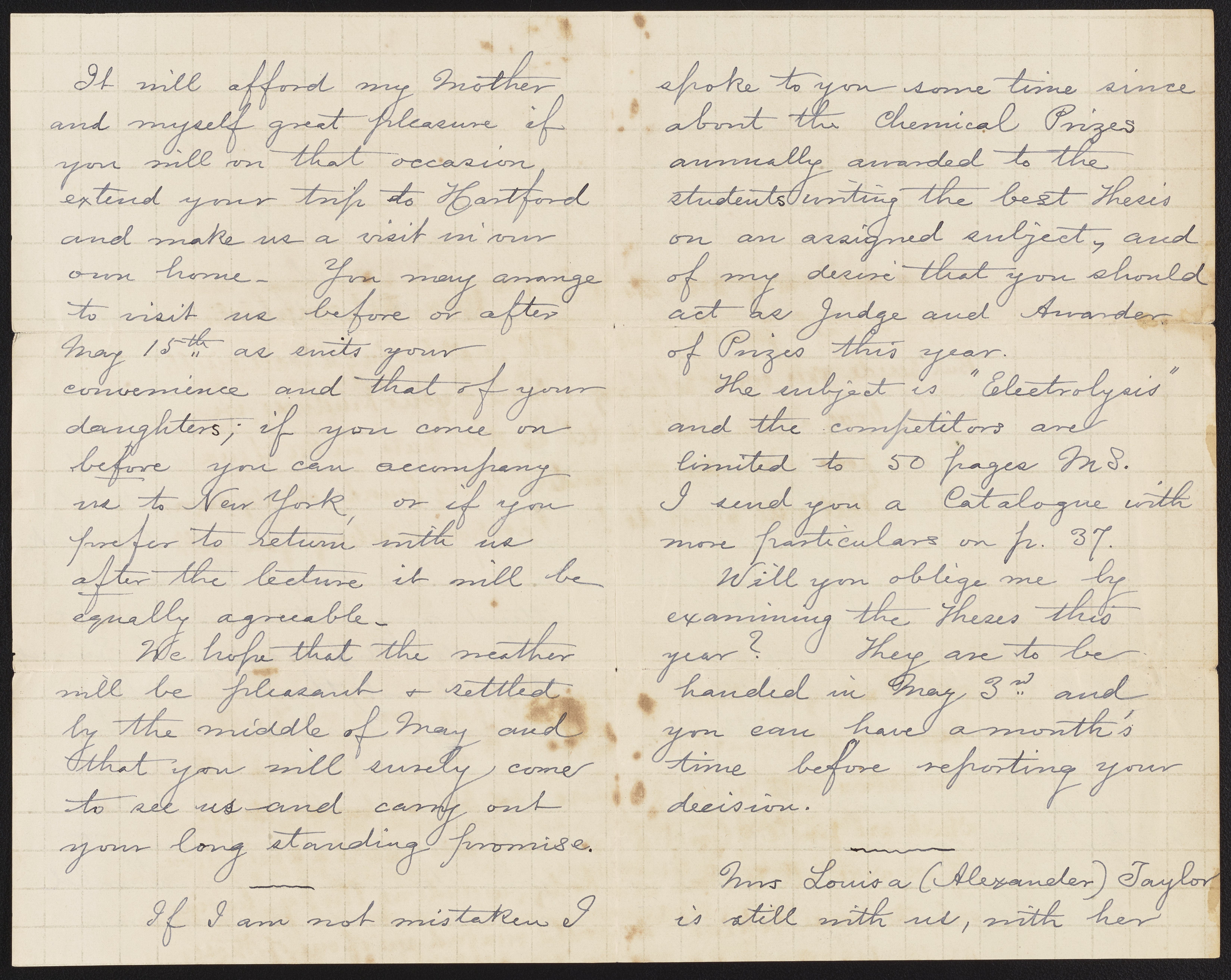 Small JPG1200 x 1886px — 349 KBLarge JPG2880 x 4526px — 1.8 MBFull-sized JPG3324 x 5224px — 2.3 MBOriginal fileTIFF — 3324 x 5224px — 49.7 MBHenry Carrington Bolton (1843-1903), an American chemist, professor of science at Trinity College, and relative of James Curtis Booth (1810-1888), invites Booth to attend a lecture by Bolton on glaciers and asks if Booth will act as judge in a student paper contest.