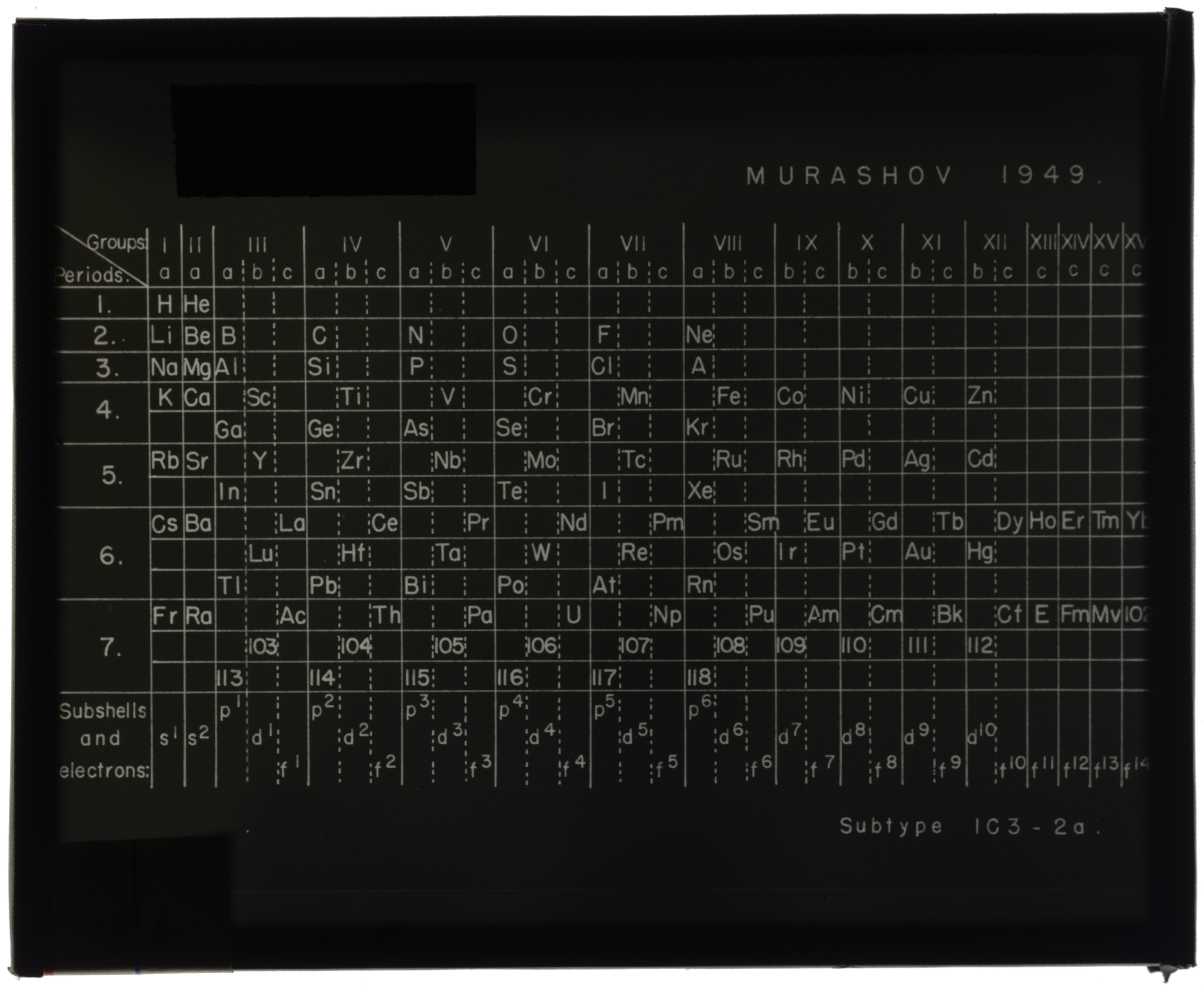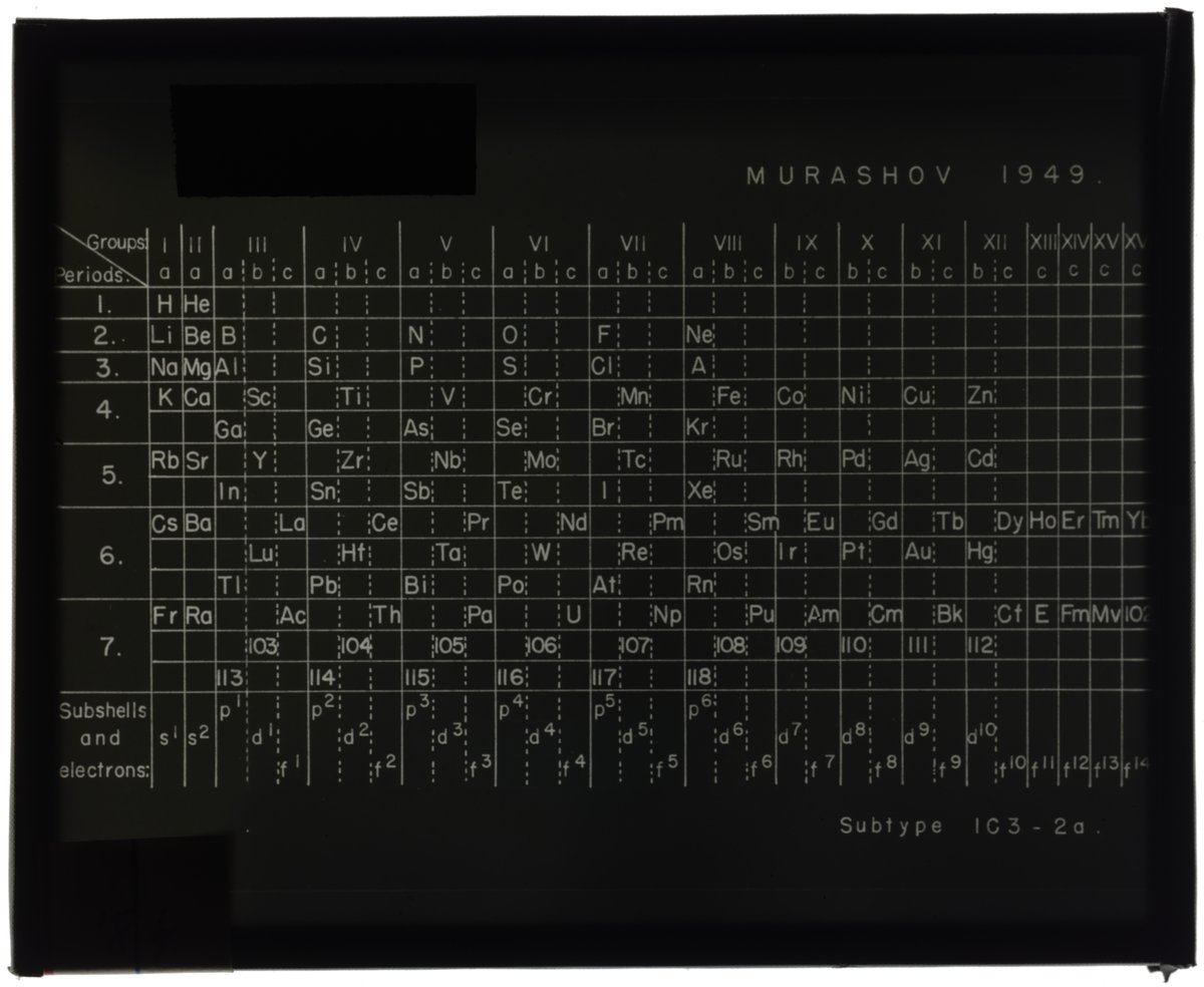 Murashov, G.M., and Edward G. Mazurs. “Series Table Organized into Sixteen Groups.” Glass (material), circa 1949–1957. Edward G. Mazurs Collection of Periodic Systems Images, Box 1. Science History Institute. Philadelphia. https://digital.sciencehistory.org/works/nc580n106.