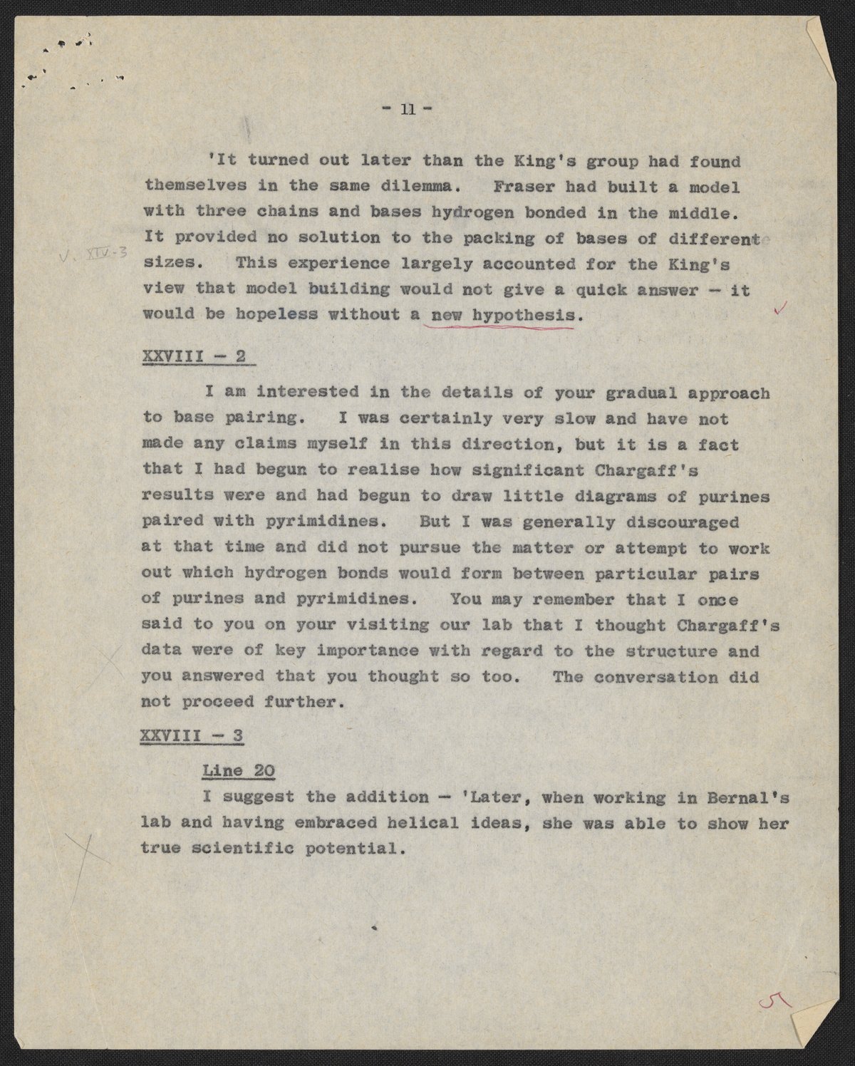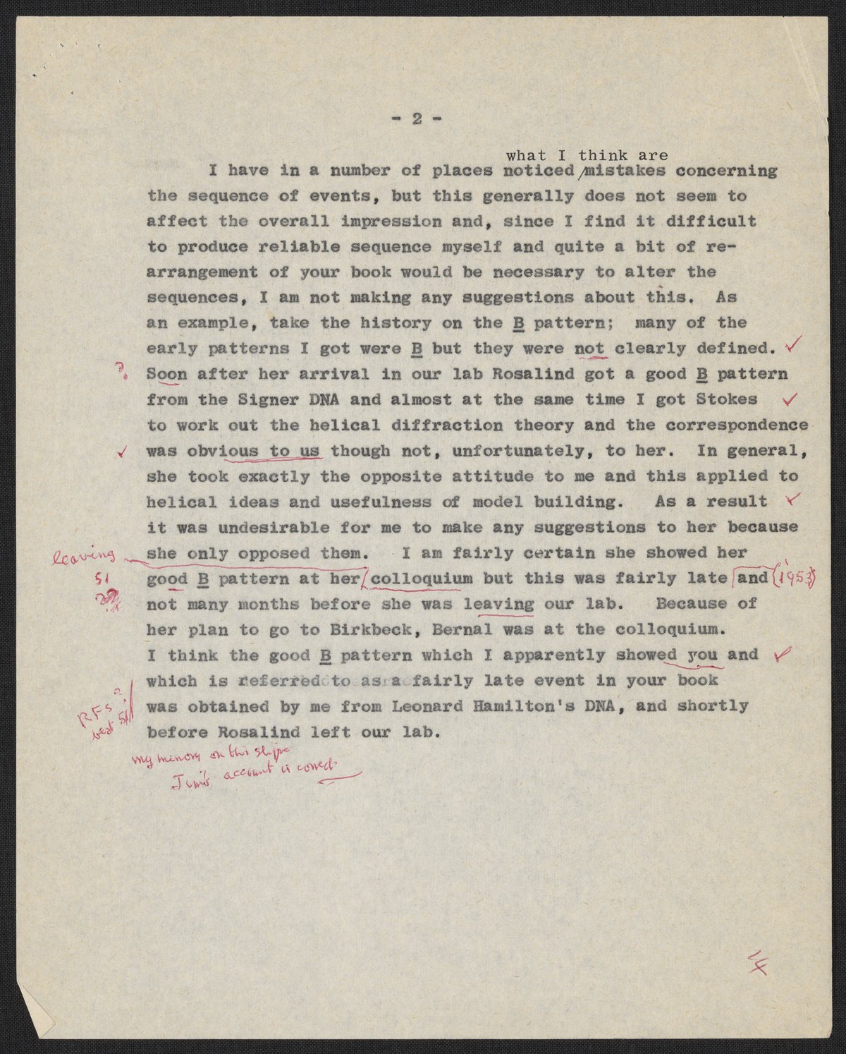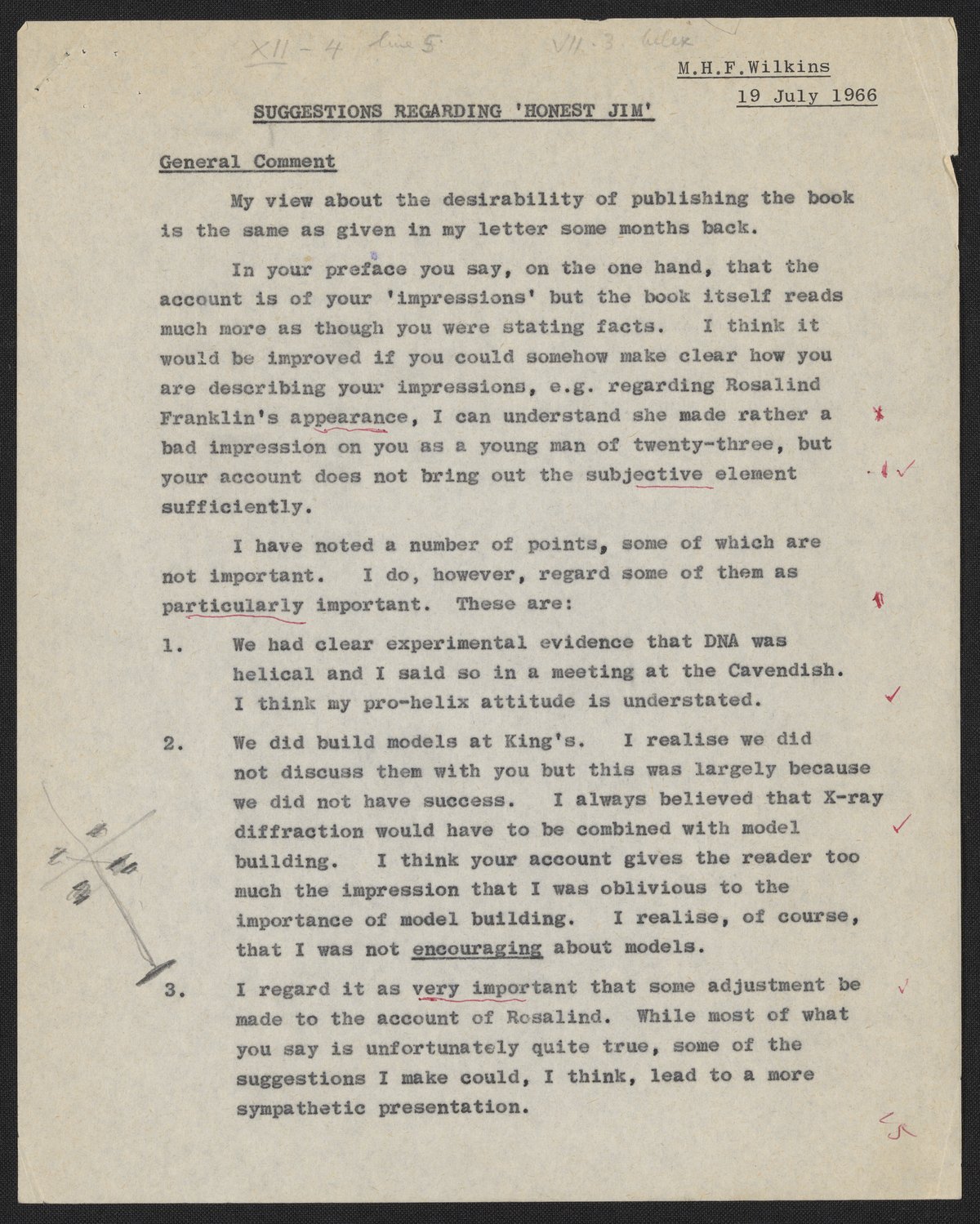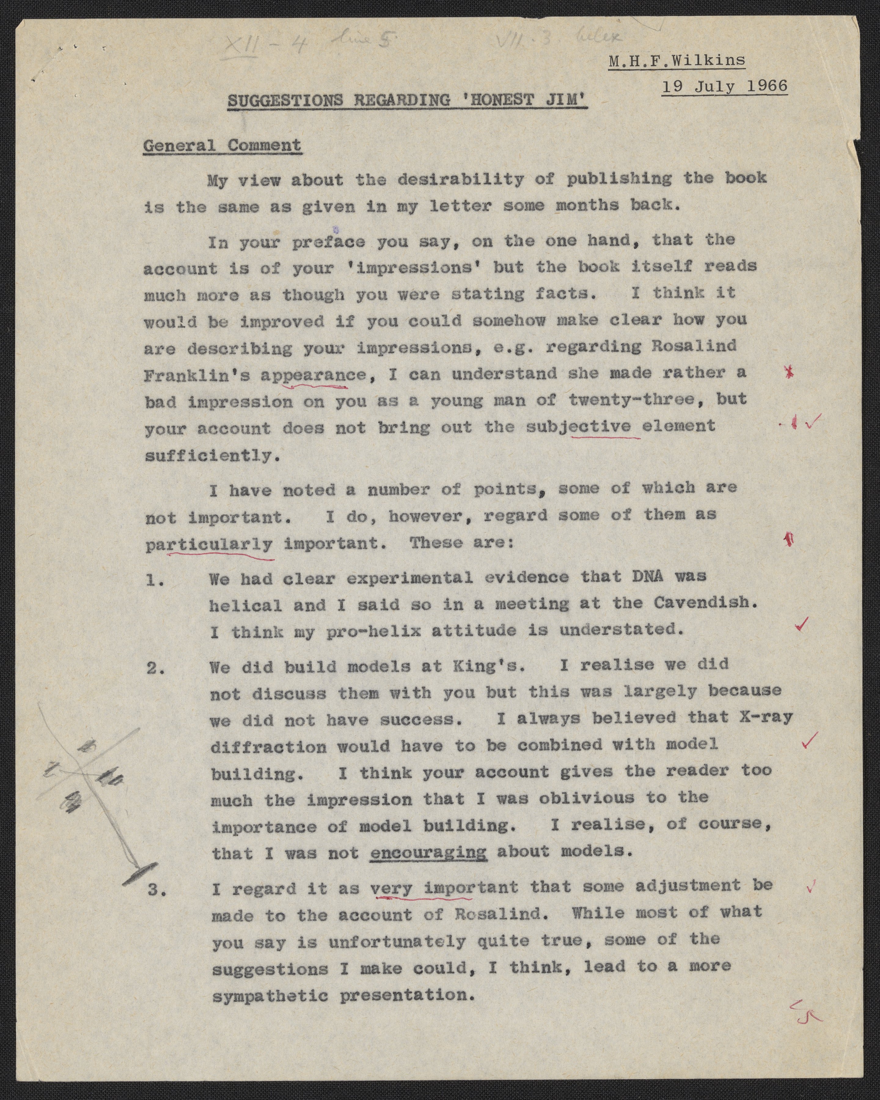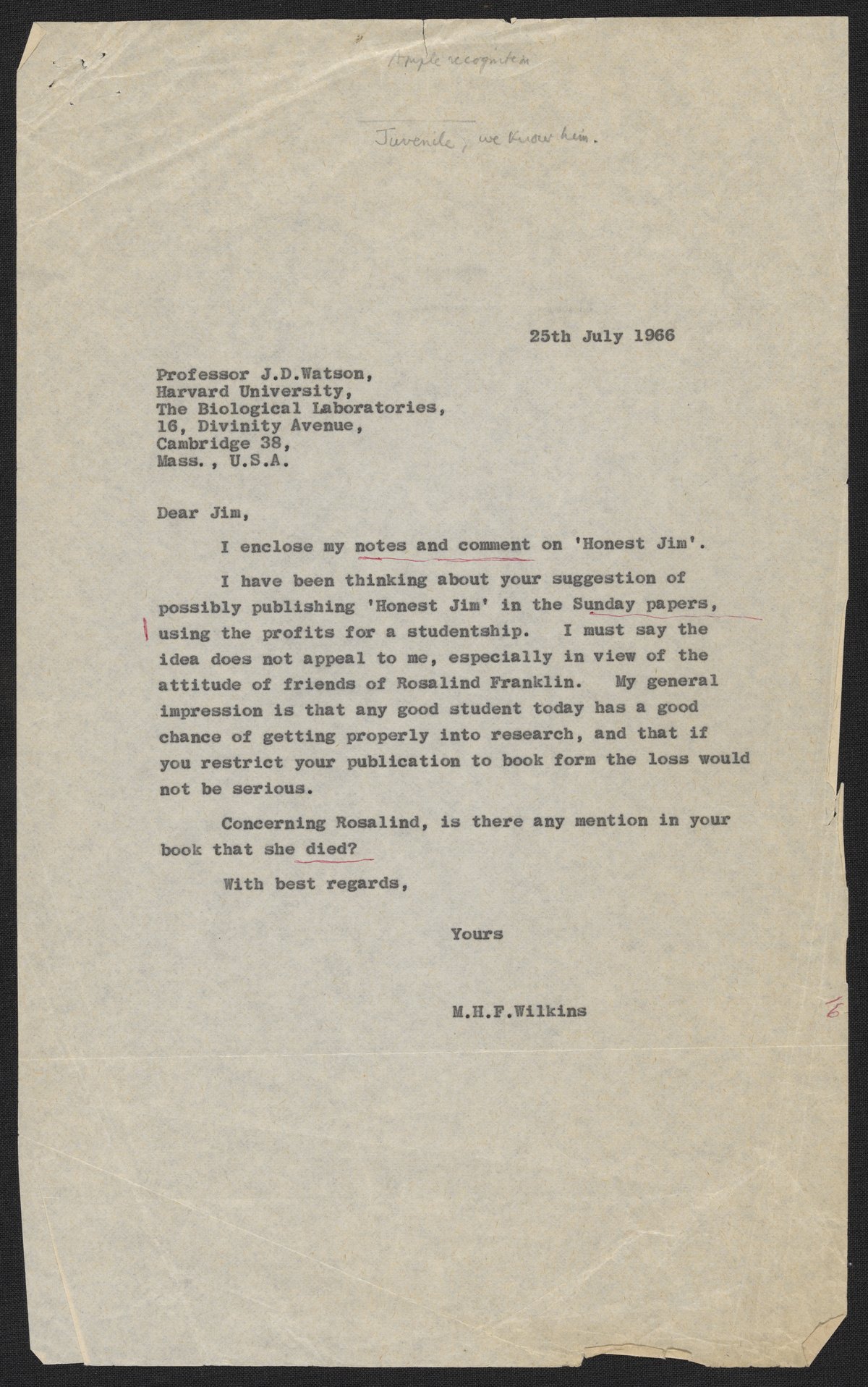 Letters and notes on "Honest Jim" from Maurice Wilkins to James D. Watson, July 1966
