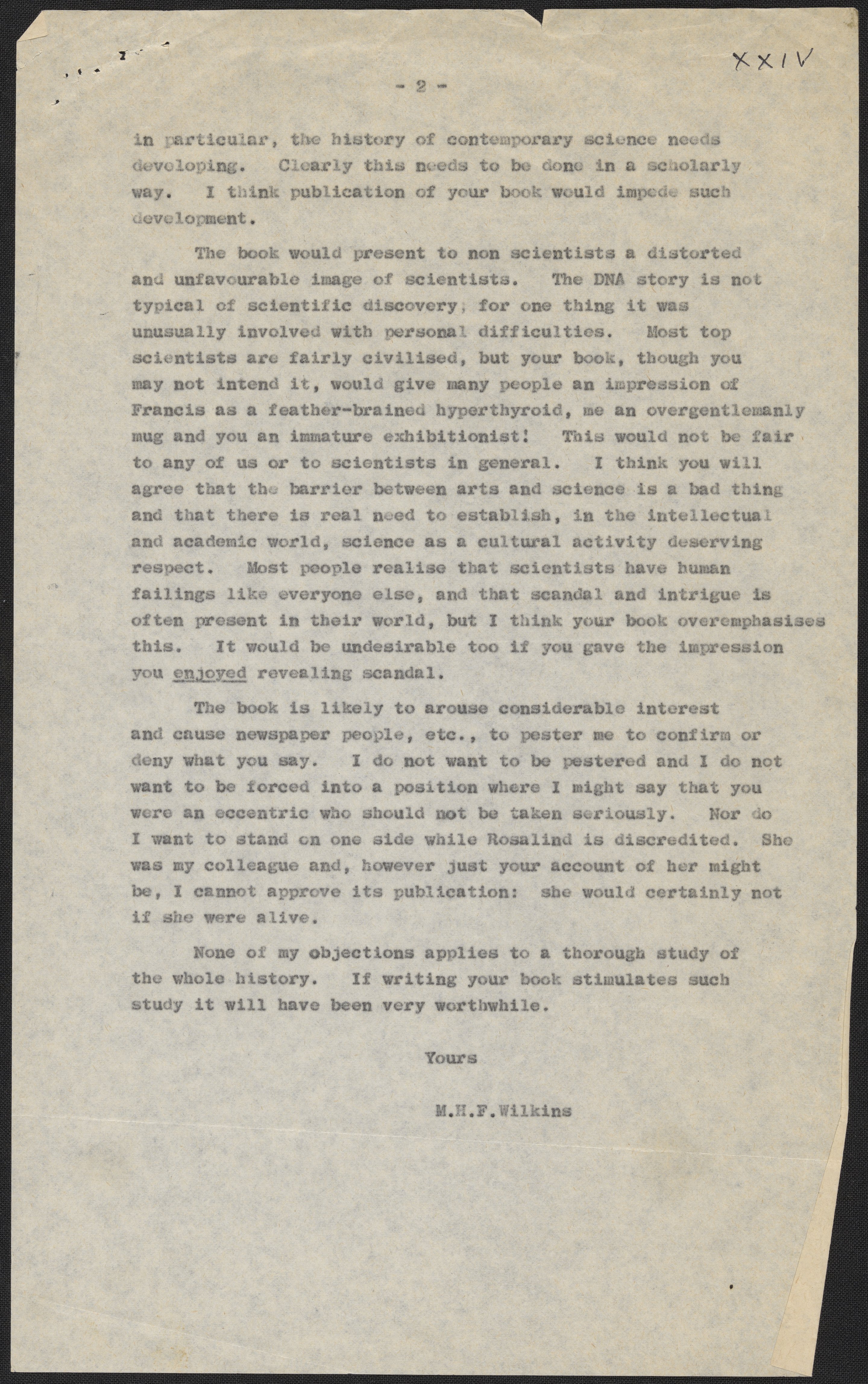 Wilkins, Maurice. “Letters and Notes on ‘Honest Jim’ from Maurice Wilkins to James D. Watson, July 1966,” 1966. History of Molecular Biology Collection, Box 3, Folder 2. Science History Institute. Philadelphia. https://digital.sciencehistory.org/works/nd9d0v9.