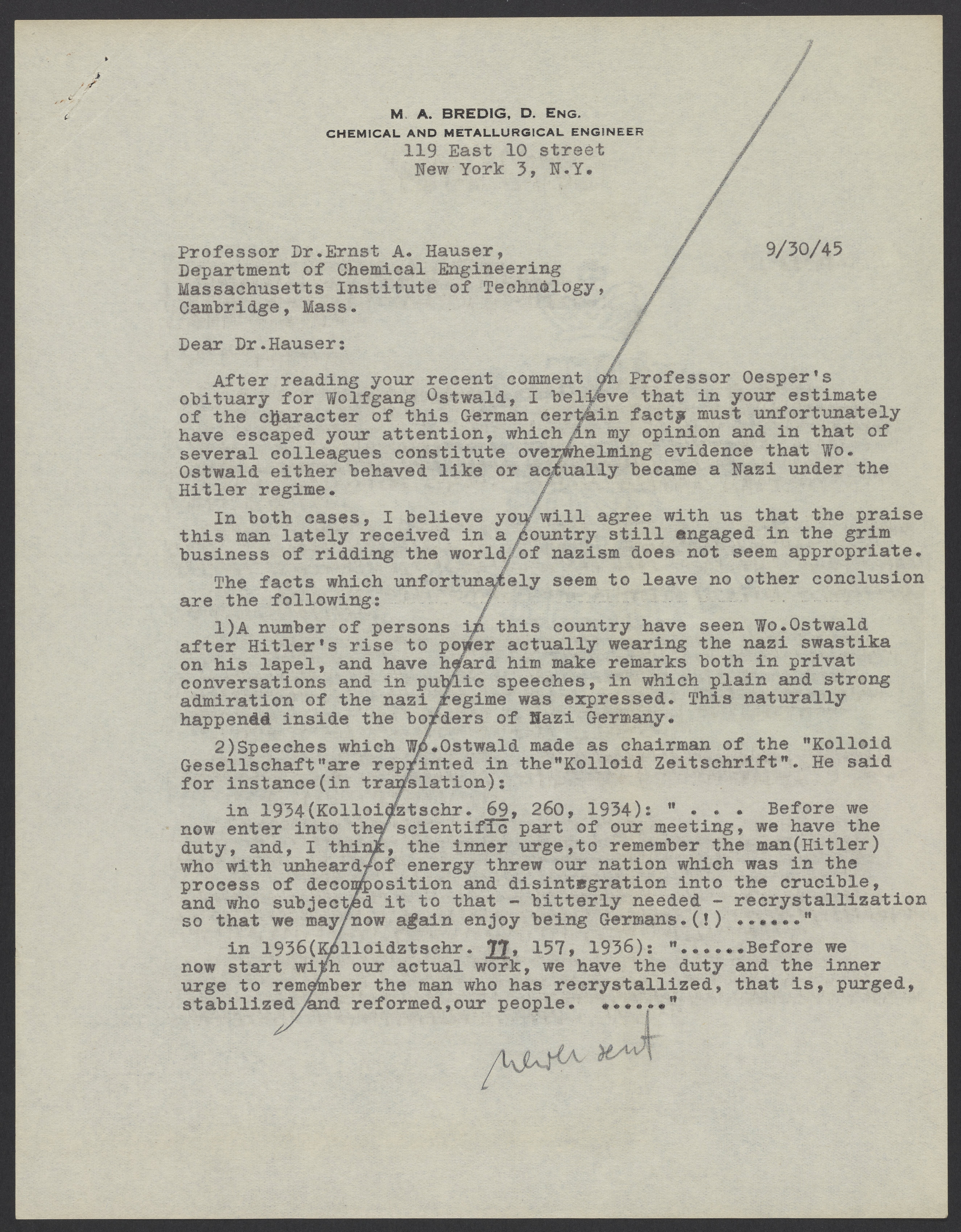 Bredig, Max Albert. “Letter from Max Bredig to Ernst A. Hauser, September 30, 1945,” September 30, 1945. Papers of Georg and Max Bredig, Box 7, Folder 30. Science History Institute. Philadelphia. https://digital.sciencehistory.org/works/ndh0pn5.