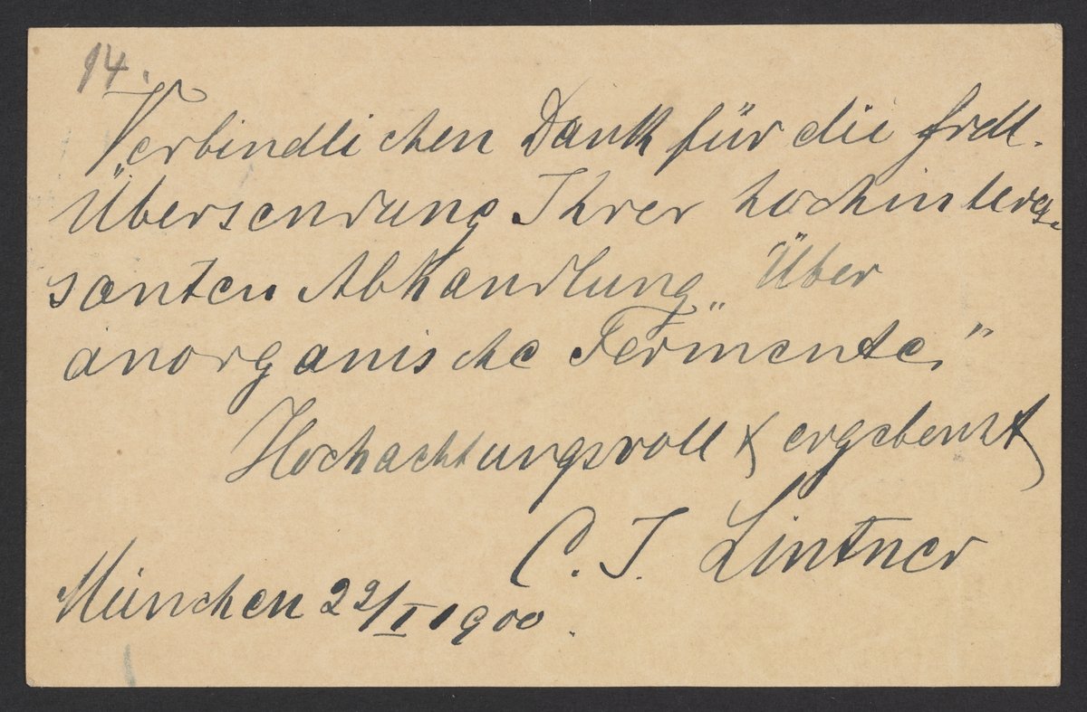 Lintner, Karl Josef Ludwig (1855-1926). “Postcard from C.J. Lintner to Georg Bredig,” January 22, 1900. Papers of Georg and Max Bredig, Box 2, Folder 13. Science History Institute. Philadelphia. https://digital.sciencehistory.org/works/ndkqiqq.