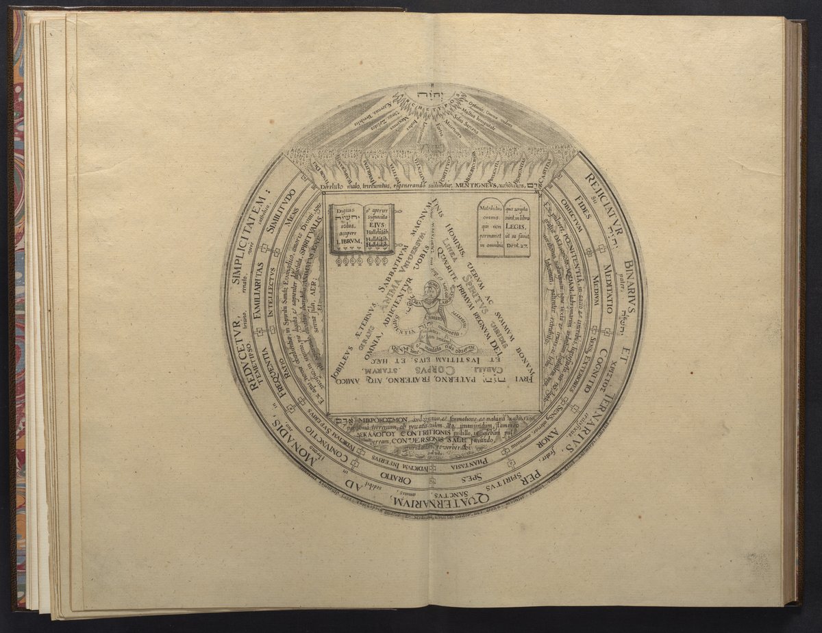 A circular engraving. Within several concentric rings heavily filled with text, a square is outlined. The square contains imagery of a holy book, stone tablets, and text written in a triangular form. At the center, a two-headed figure speaks.