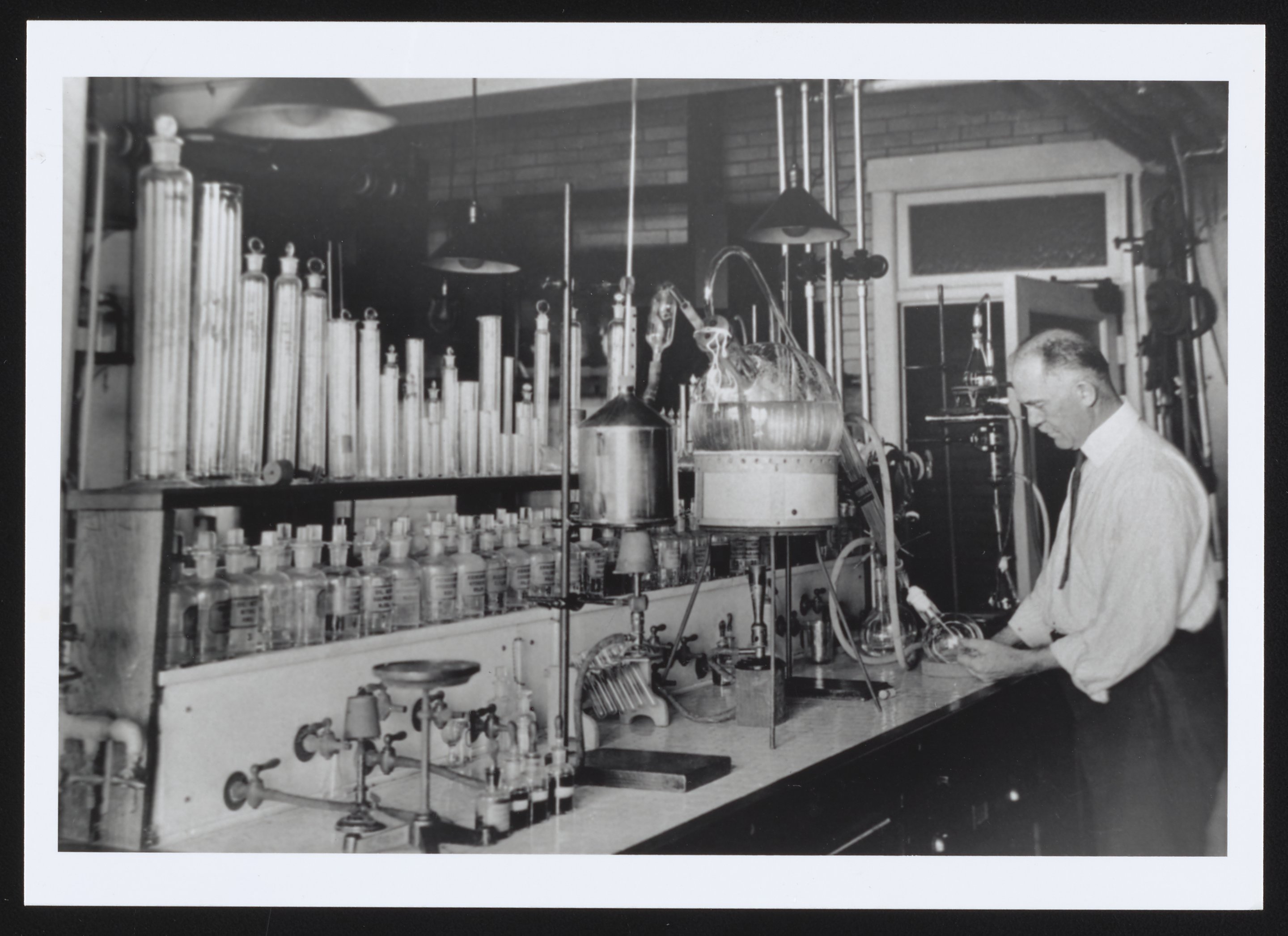 General view of an employee in the Bureau of Chemistry's Phytochemical Laboratory using a distillation apparatus to concentrate the odorous constituents of apples and peaches. Part of the U.S. Department of Agriculture, the Phytochemical Laboratory conducted research to ascertain the nature of the chemical substances that impart edible fruits with particular aromas. Such research was undertaken to help regulate the adulteration of natural fruit juices and artificial flavorings.