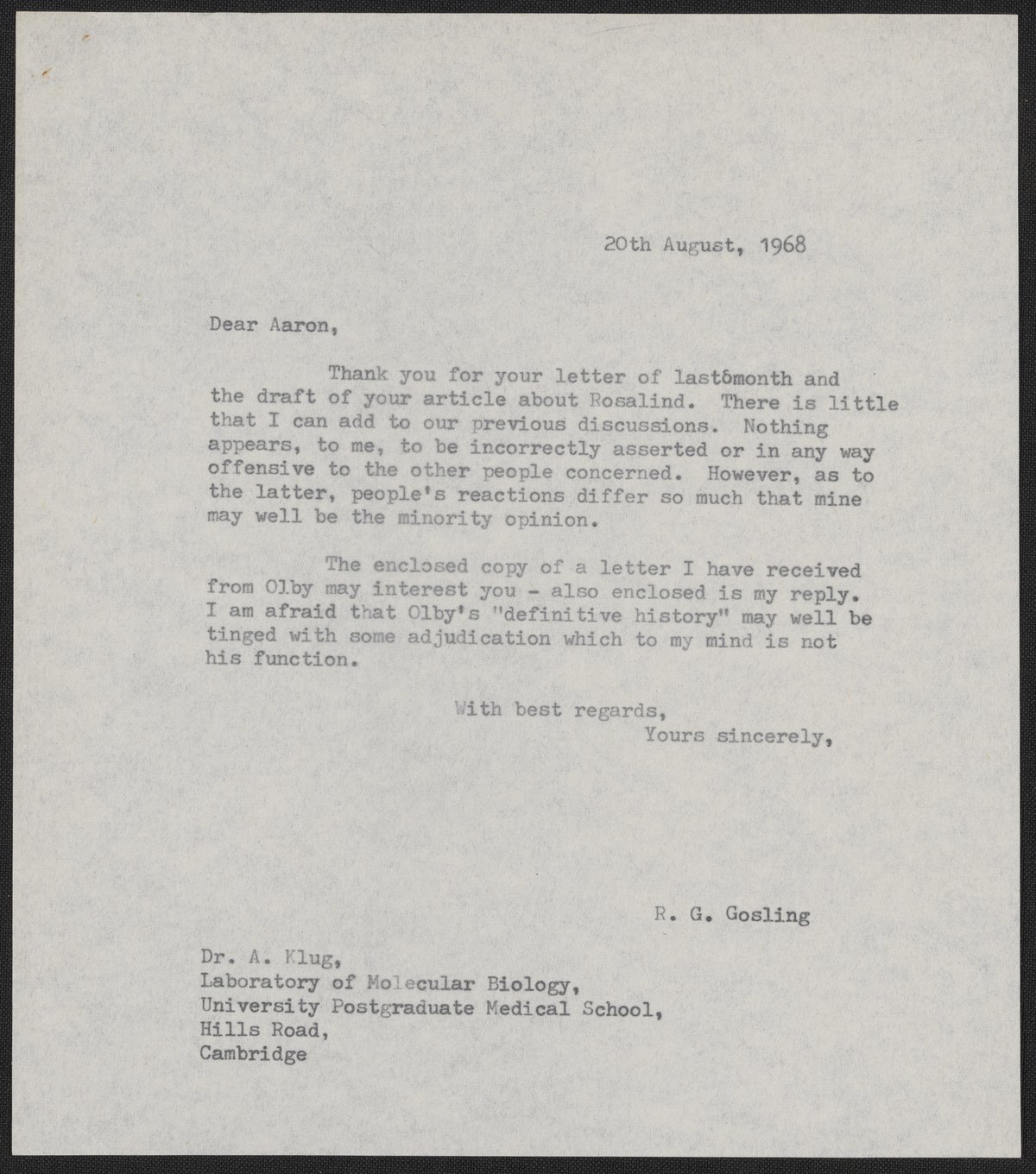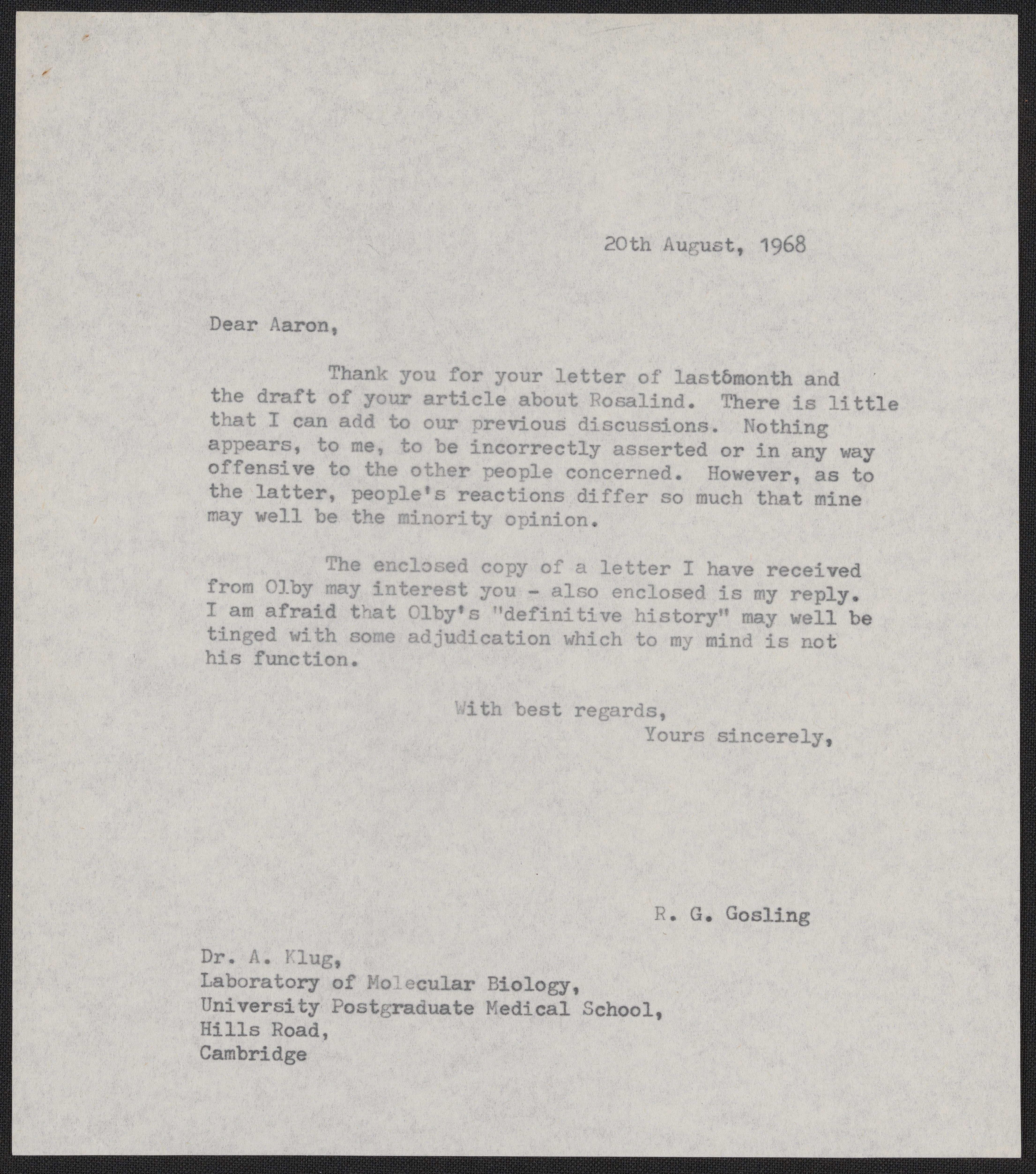Letter from Raymond Gosling to Aaron Klug, August 20, 1968