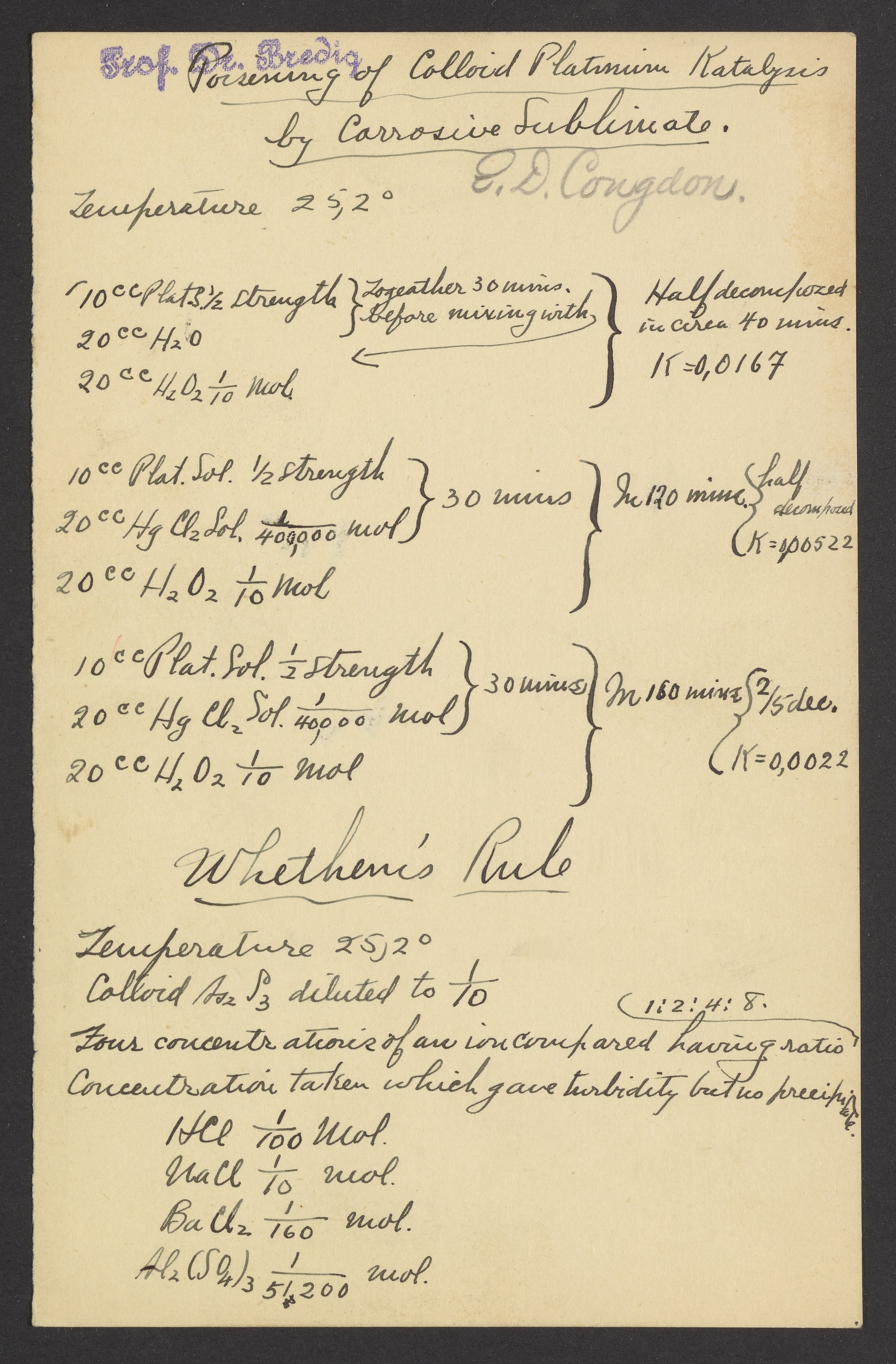 Bredig, Georg. “Colloid Platinum Katalysis Poisoning by Corrosive Sublimate,” circa 1909. Papers of Georg and Max Bredig, Box 3, Folder 20. Science History Institute. Philadelphia. https://digital.sciencehistory.org/works/njy2jkg.