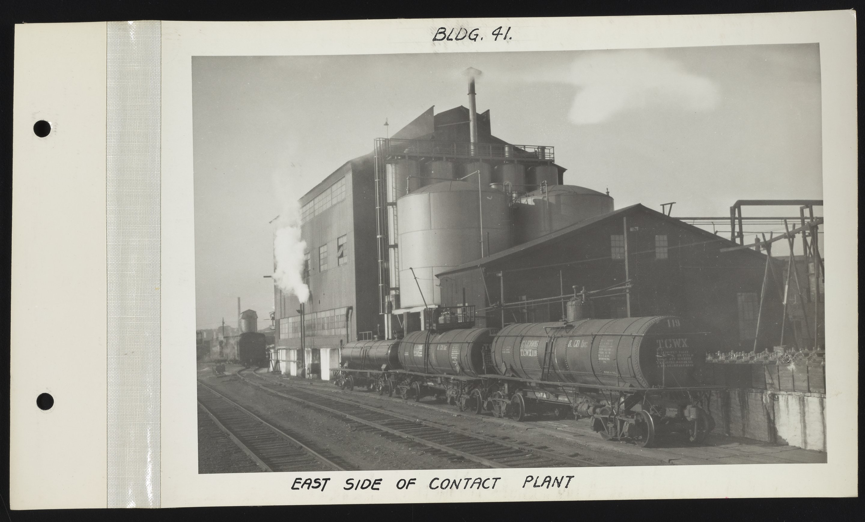 General view of the east side of the sulphuric acid contact plant (Building 41) and adjacent railroad tracks at the Charles Lennig and Company chemical manufacturing plant in Bridesburg, a neighborhood located along the Delaware River in the Northeast section of Philadelphia, Pennsylvania. Charles Lennig and Company operated as a subsidiary of the Rohm and Haas Company, an international chemical company headquartered in Philadelphia, from 1920 to 1947.