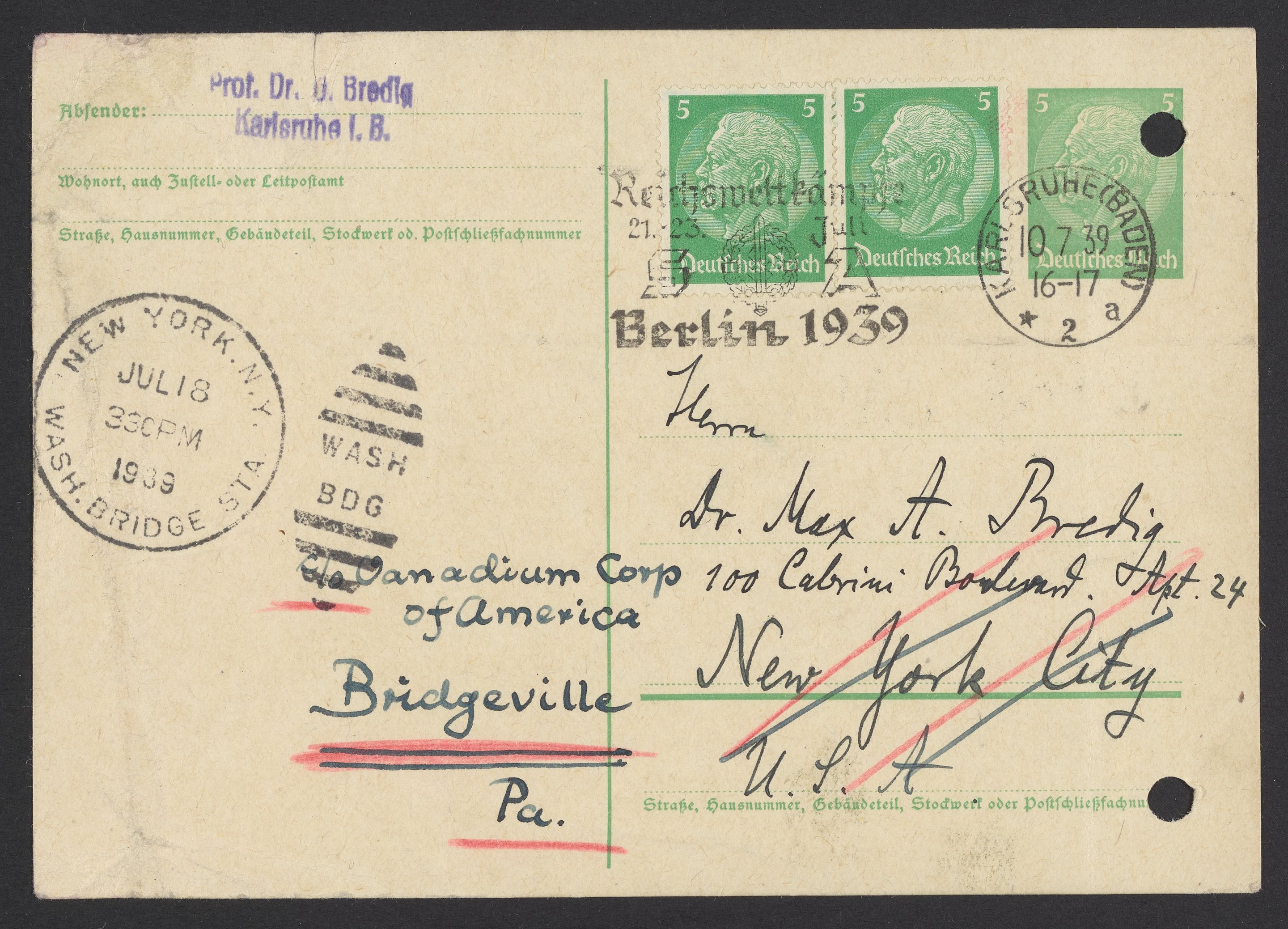 Postcard from Georg Bredig to Max Bredig, July 10, 1939
