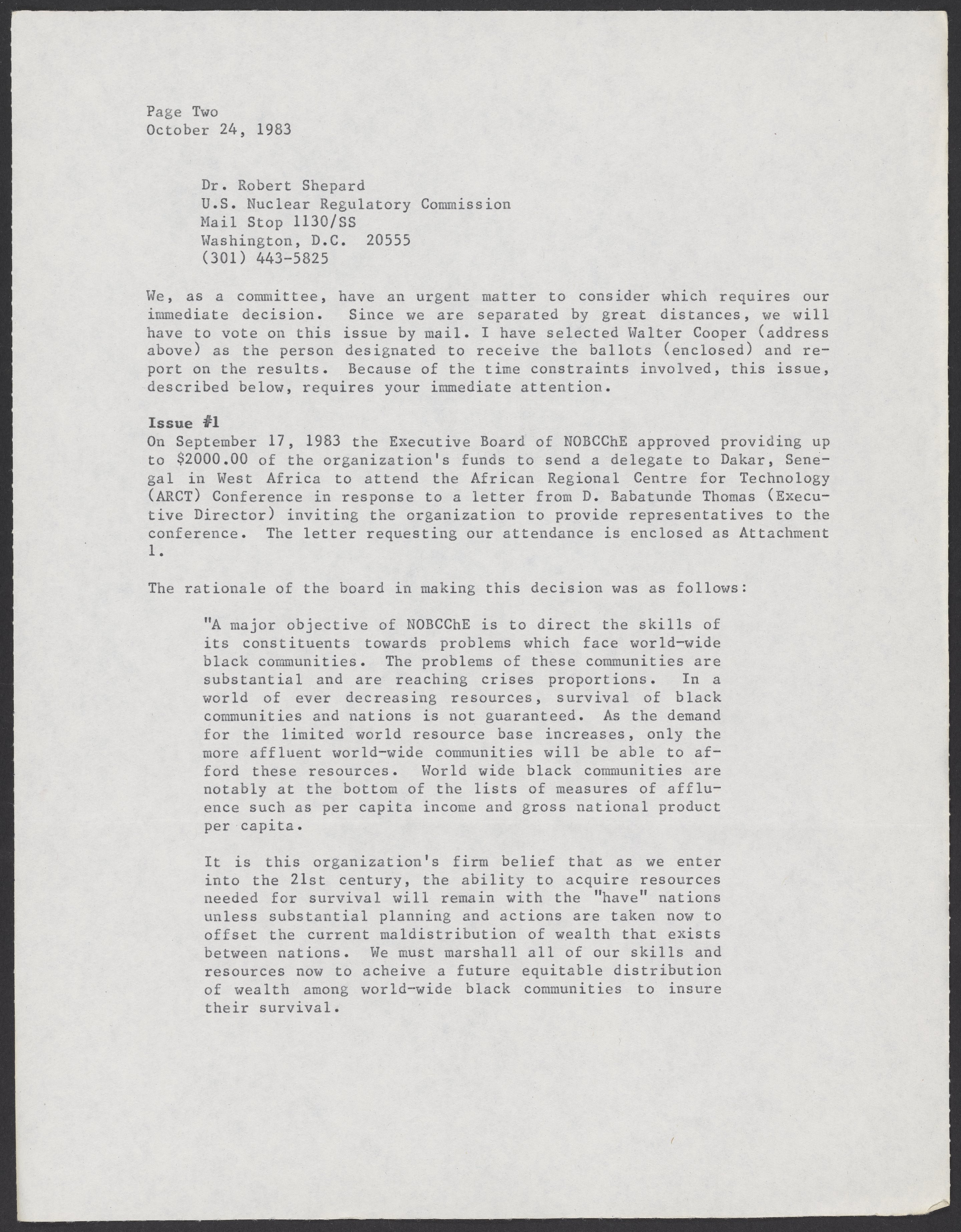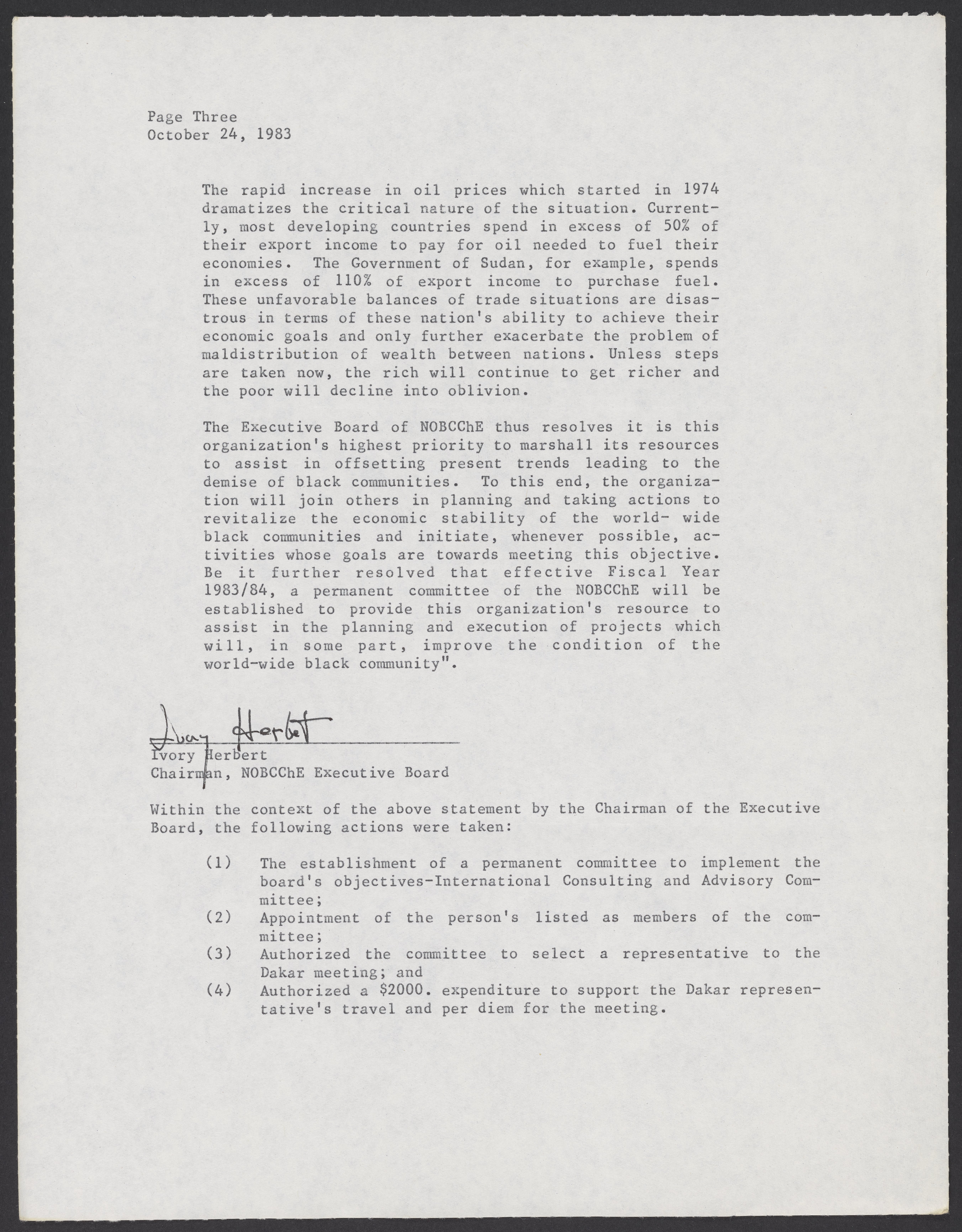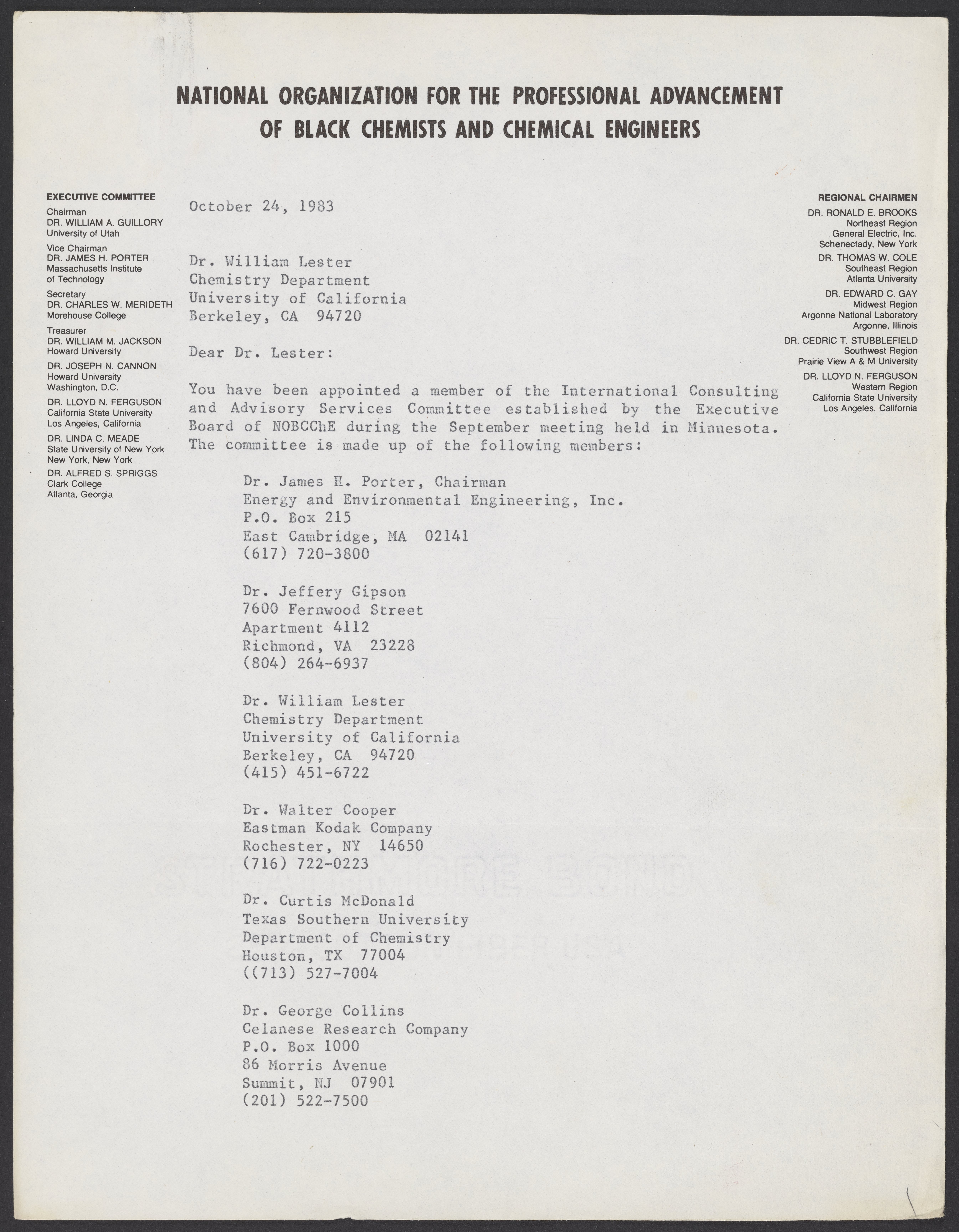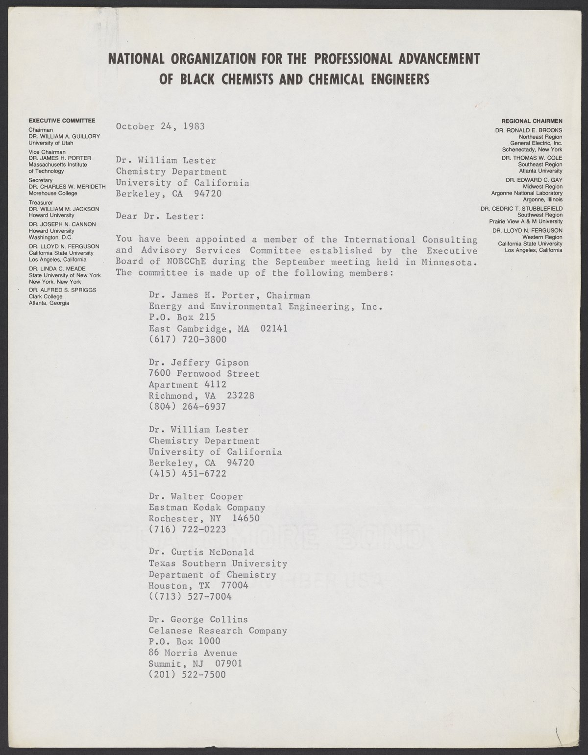 Small JPG1200 x 1541px — 223 KBLarge JPG2880 x 3699px — 1.2 MBFull-sized JPG5380 x 6910px — 4.1 MBOriginal fileTIFF — 5380 x 6910px — 106 MBLetter to William A. Lester, Jr. (1937-) from James H. Porter, informing Lester that he has been appointed to the International Consulting and Advisory Services Committee of the National Organization for the Professional Advancement of Black Chemists and Engineers (NOBCChE).