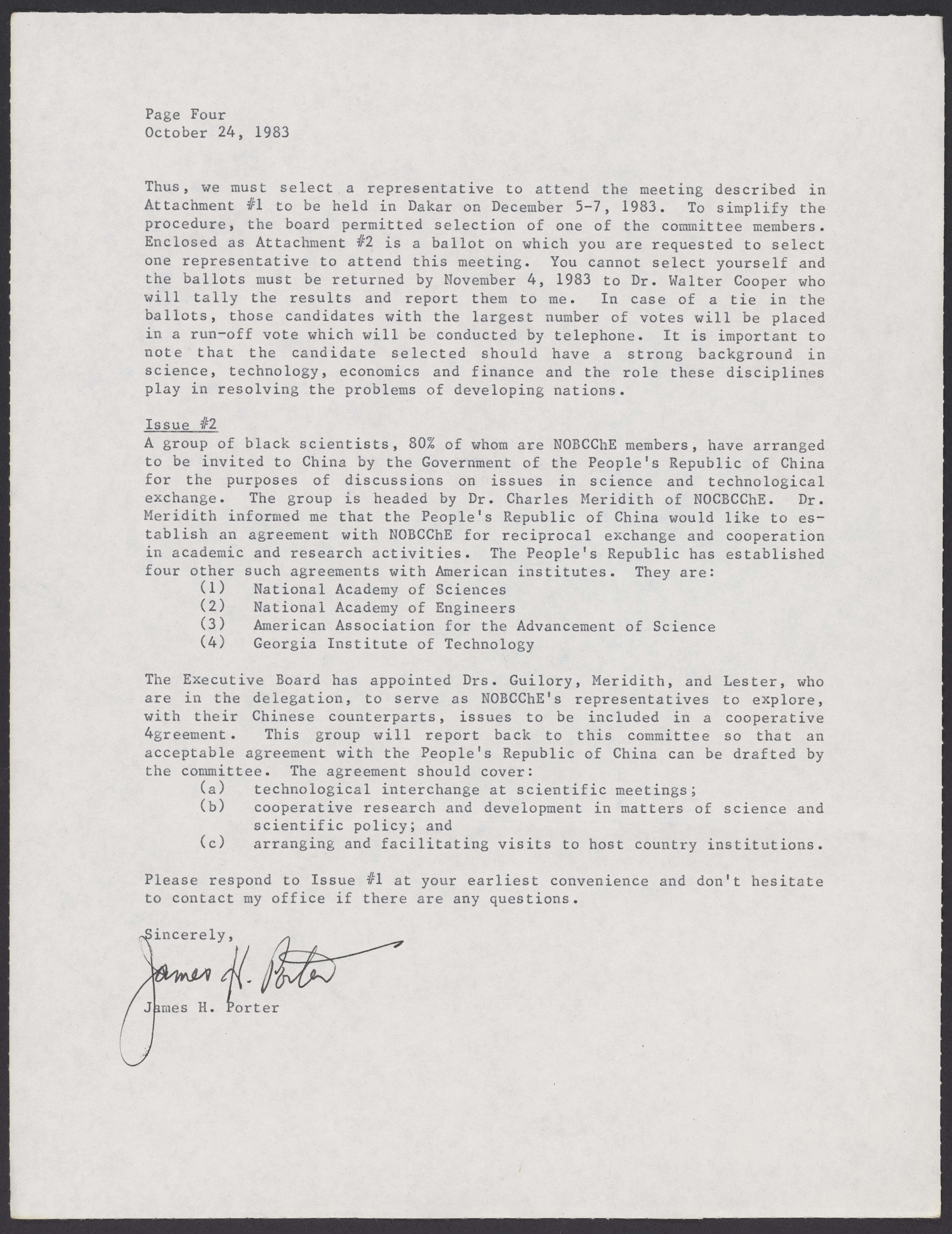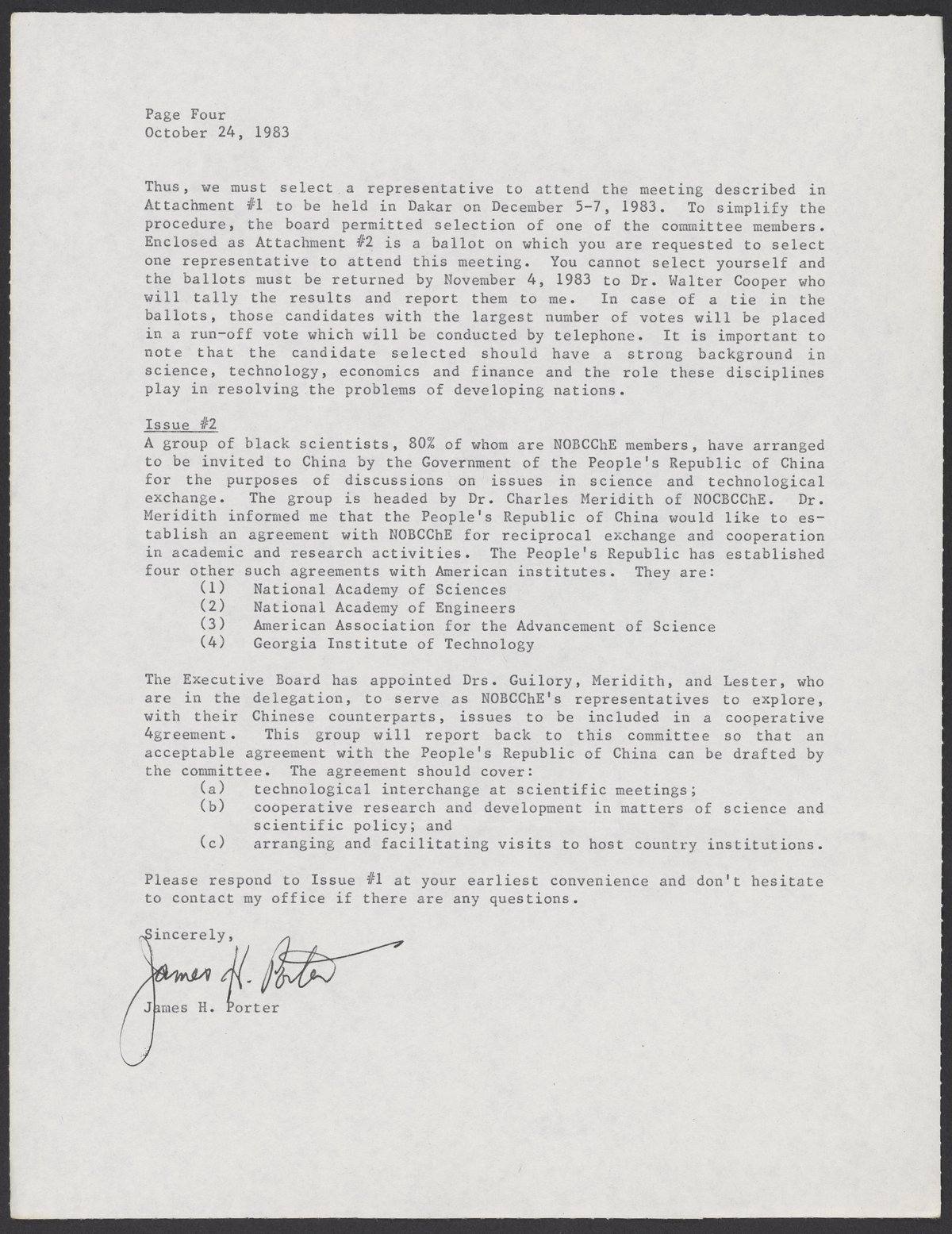 Porter, James H., and National Organization for Black Chemists and Chemical Engineers. “Letter to William A. Lester, Jr. from James H. Porter, October 24, 1983,” October 24, 1983. William A. Lester, Jr. Papers, Box 44, Folder 32. Science History Institute. Philadelphia. https://digital.sciencehistory.org/works/nlg6j2g.