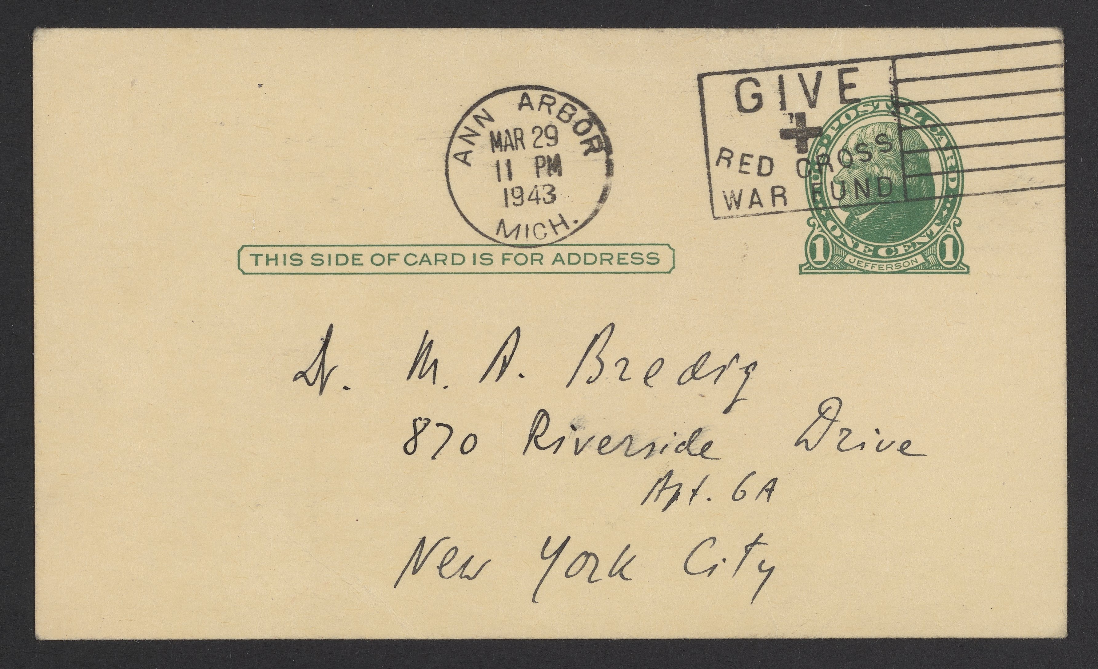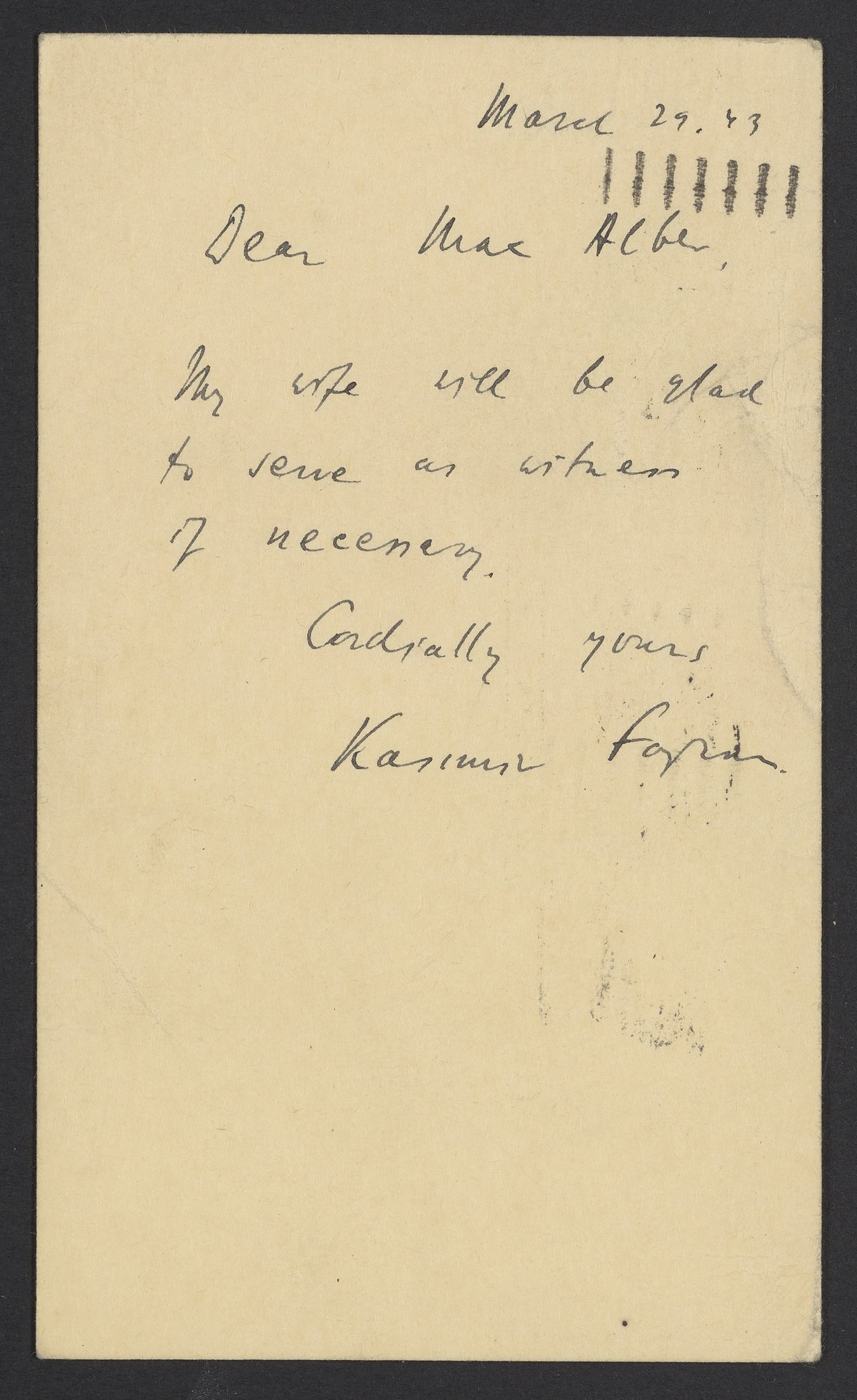 Postcard from Kasimir Fajans to Max Bredig, March 29, 1943