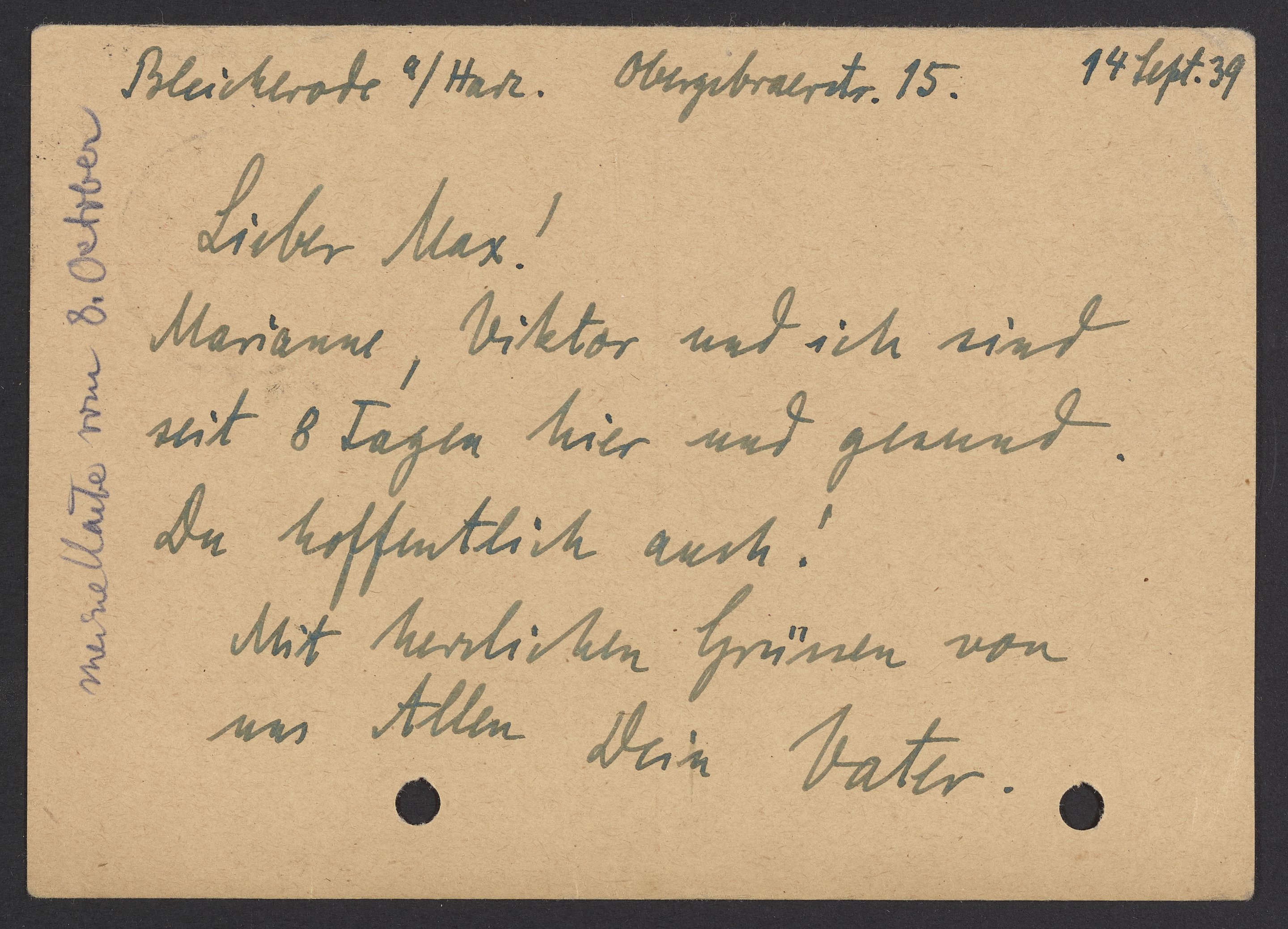 Postcard from Georg Bredig to Max Bredig, September 14, 1939