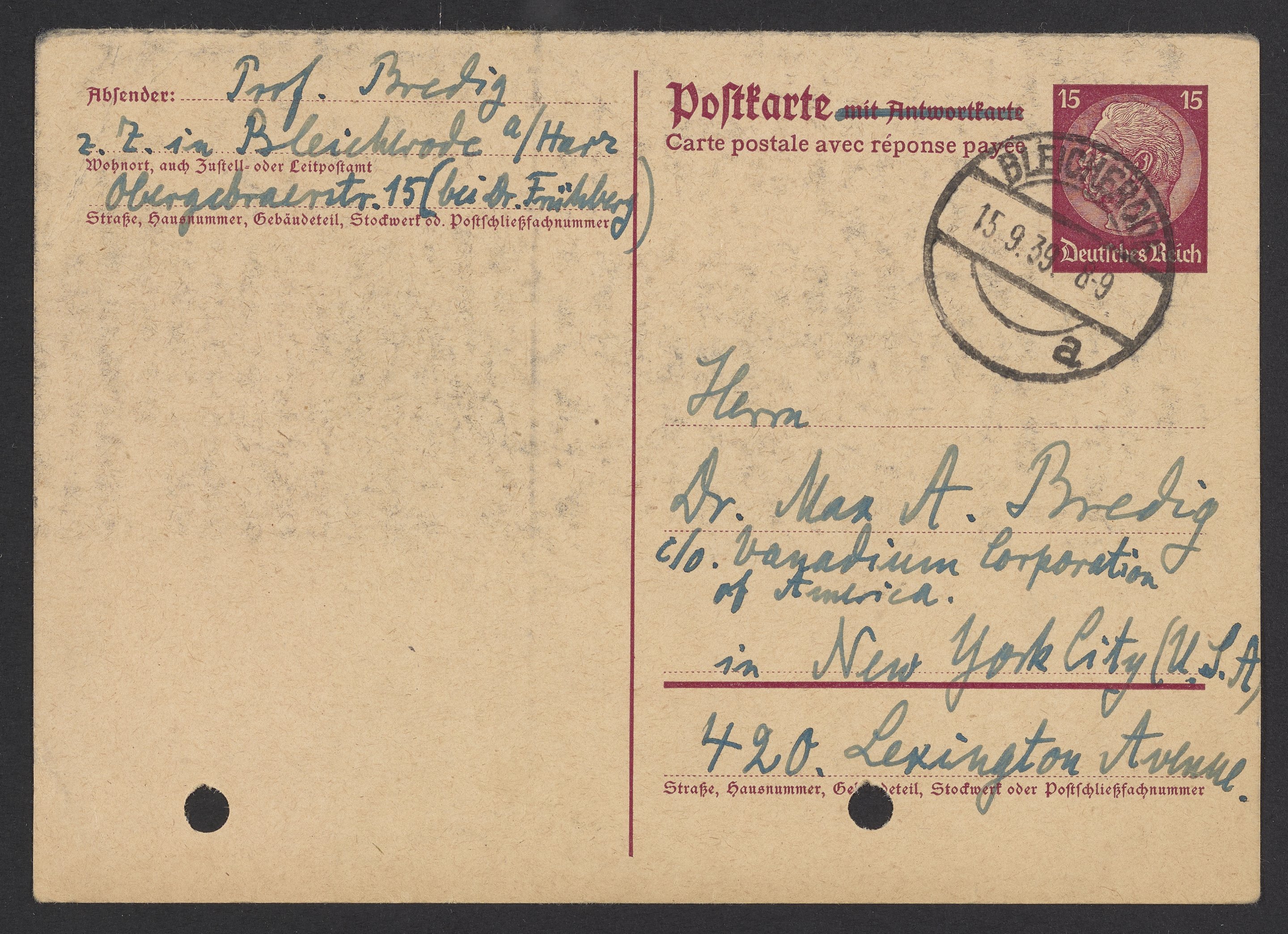 Bredig, Georg. “Postcard from Georg Bredig to Max Bredig, September 14, 1939,” September 14, 1939. Papers of Georg and Max Bredig, Box 7, Folder 15. Science History Institute. Philadelphia. https://digital.sciencehistory.org/works/none90i.