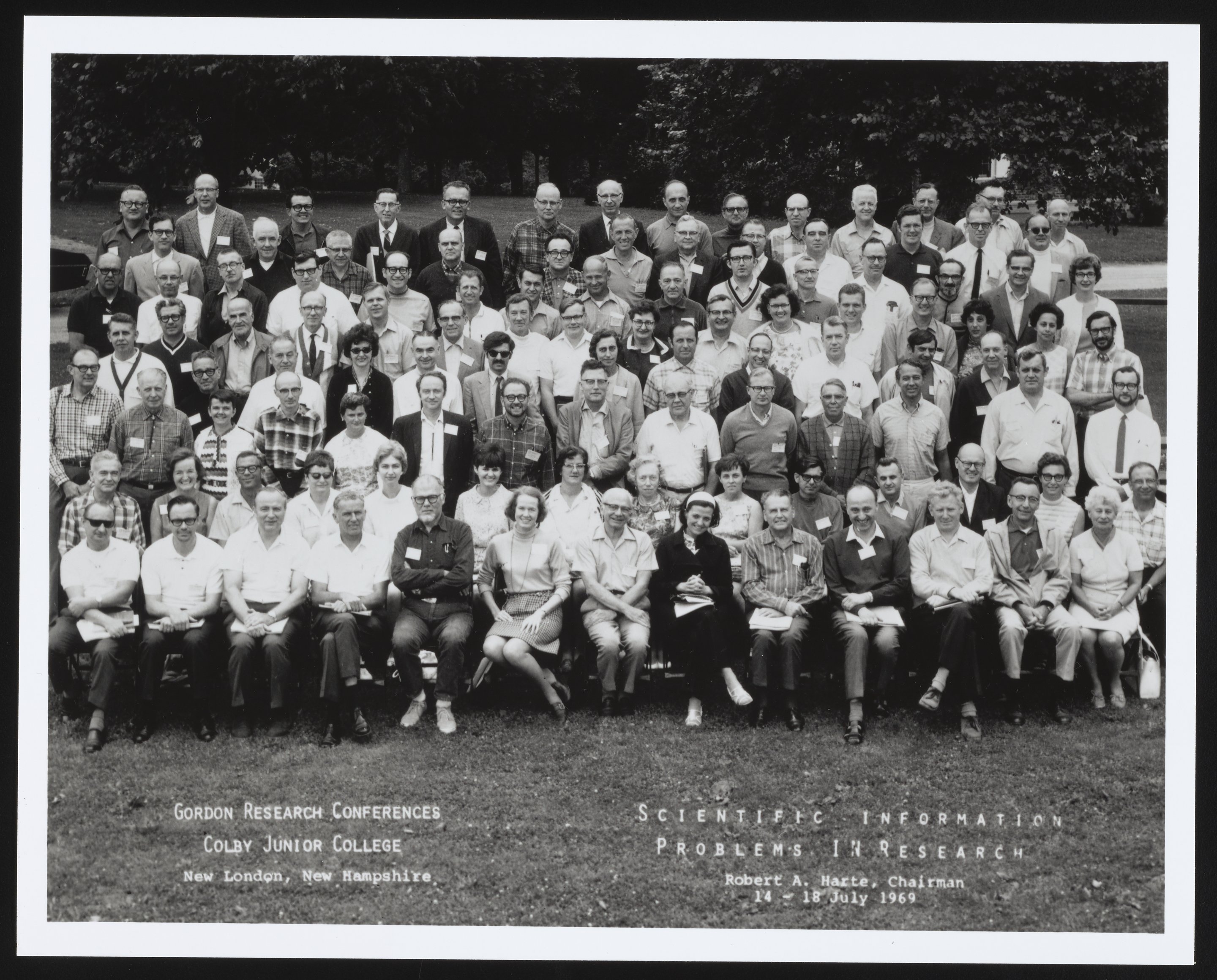Group photograph of attendees at the Gordon Research Conference on Scientific Information Problems in Research held at Colby Junior College in New London, New Hampshire in July 1969.