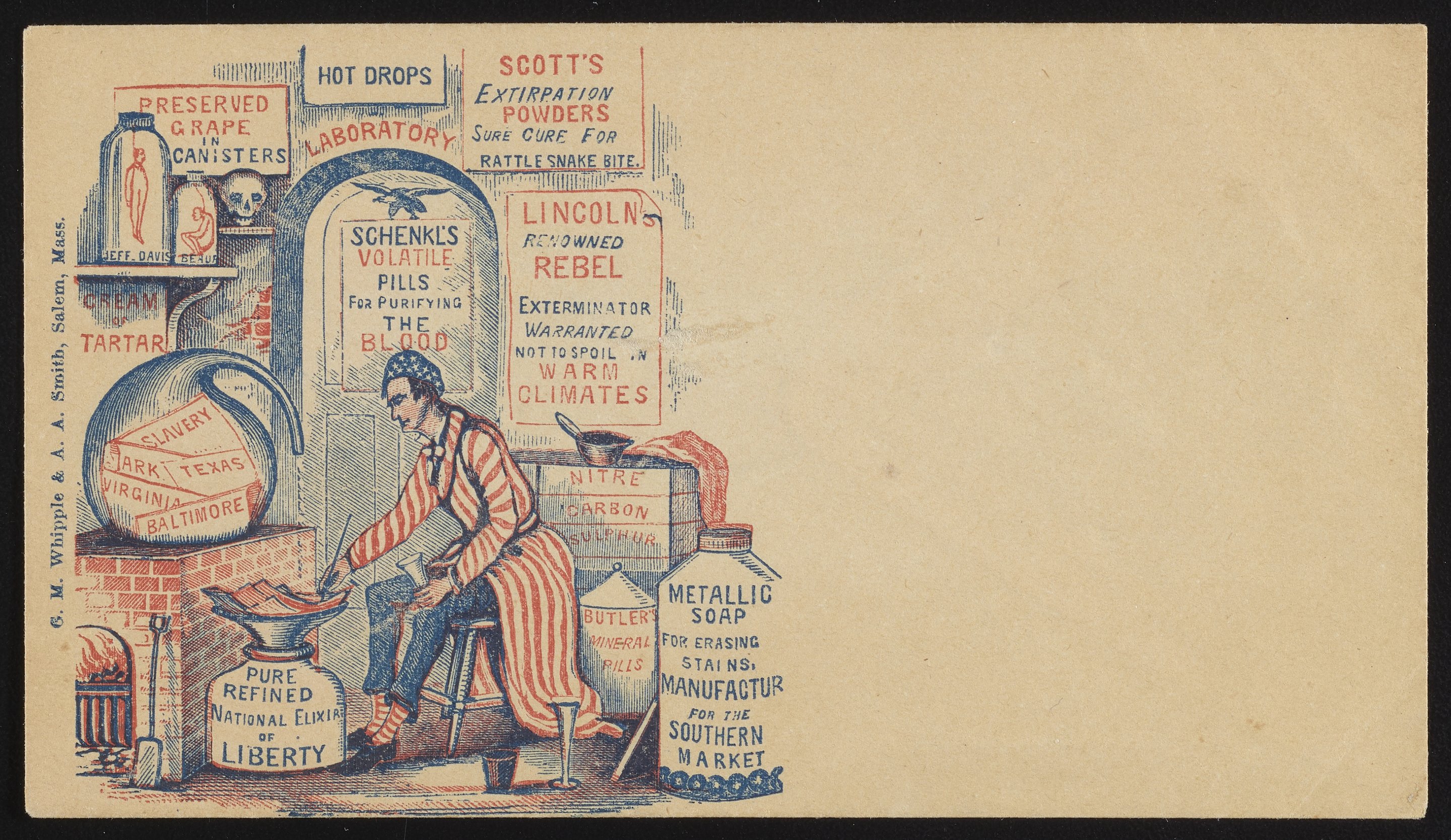 Small JPG1200 x 695px — 198 KBLarge JPG2880 x 1668px — 1.0 MBFull-sized JPG3544 x 2053px — 1.5 MBOriginal fileTIFF — 3544 x 2053px — 20.9 MBThis envelope, produced during the American Civil War, features a patriotic Union theme with President Abraham Lincoln (1809-1865) portrayed as a pharmacist, chemist or alchemist stirring a receptacle titled "Pure refined national elixir of liberty." Posters advertising Union remedies surround him. Confederate leaders are shown as hanging specimens in bottles.