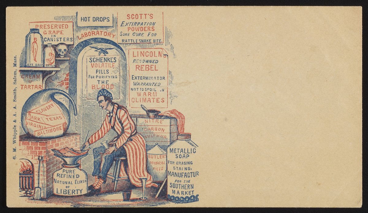“Civil War Envelope Portraying Abraham Lincoln as a Chemist.” Salem, Massachusetts: G. M. Whipple & A. A. Smith, 1861–1865. Science History Institute. Philadelphia. https://digital.sciencehistory.org/works/np193b43r.