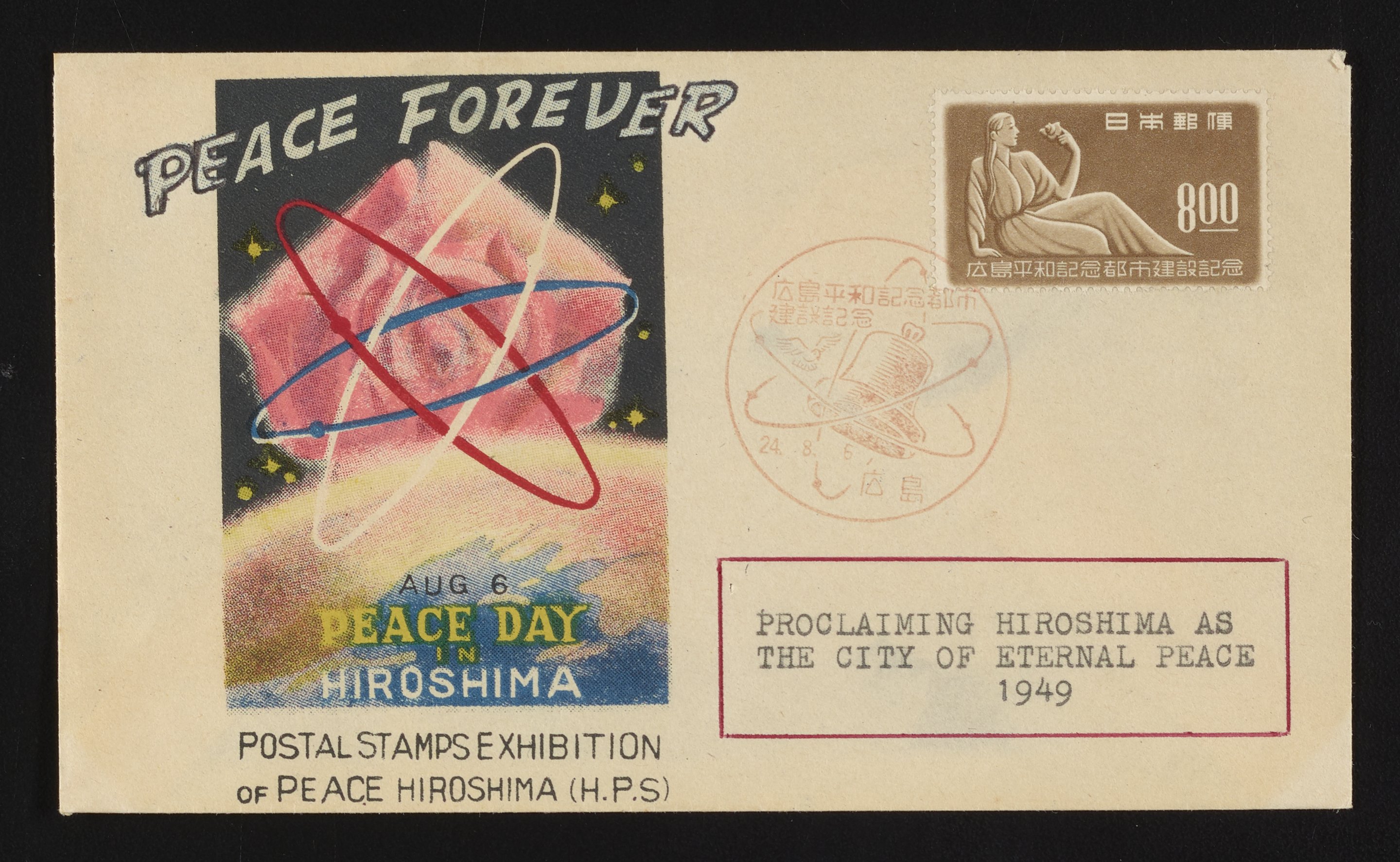 Philatelic cachet is an offset lithograph depicting an atomic model floating above the Earth with the text "Peace Forever" heading the illustration. Designates August 6th as Peace Day in Hiroshima in memoriam of the 140,000 people who died after the first atomic bomb, Little Boy, was dropped on Hiroshima on August 6, 1945. Printed text on the envelope states "Proclaiming Hiroshima as the City of Eternal Peace 1949" and "Postal Stamps Exhibition of Peace Hiroshima (H.P.S.)." Stamp depicts a seated person.
