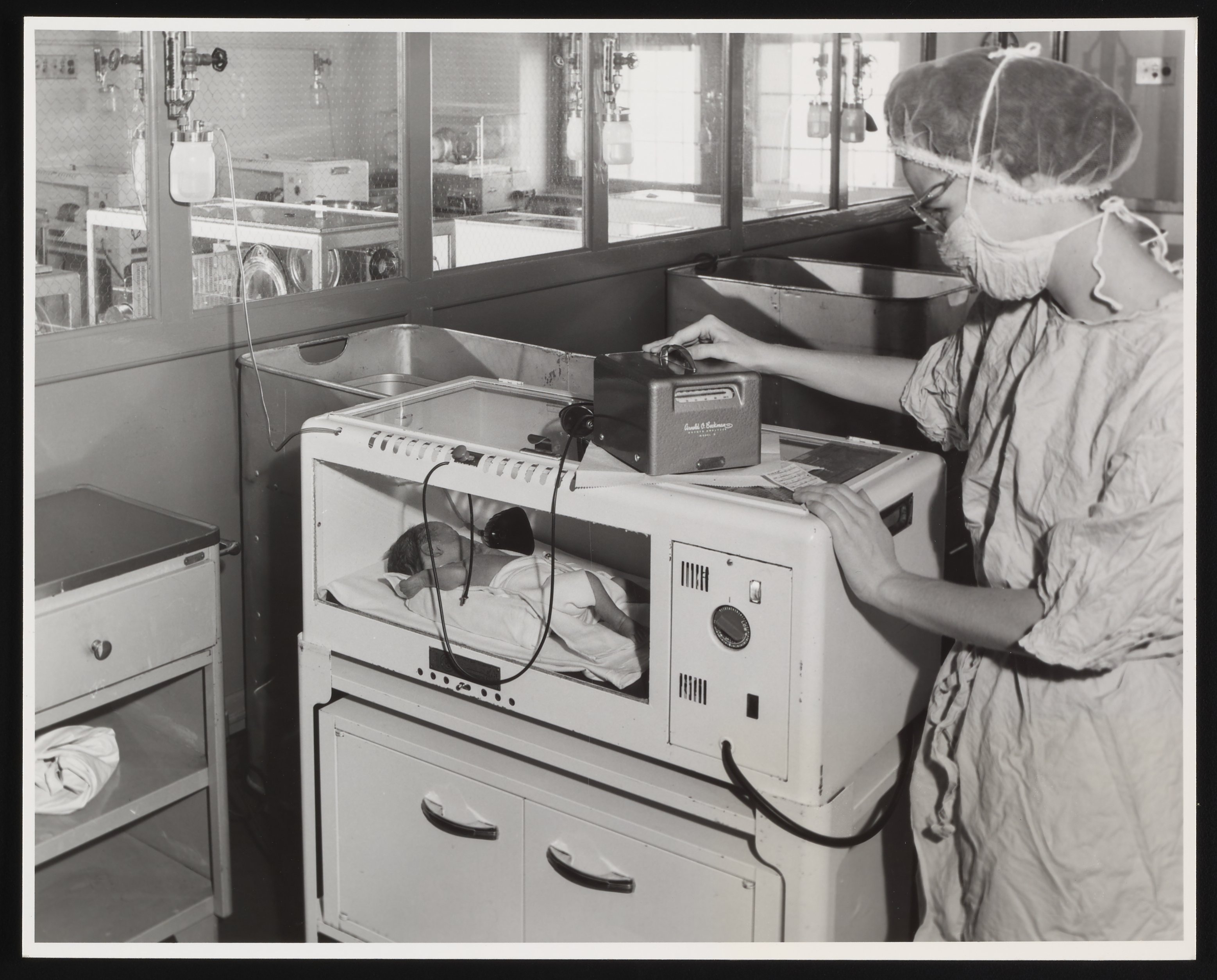 Los Angeles County General Hospital nurse Mary Finlay is monitoring the oxygen levels of a prematurely born infant in an incubator, to provide just the right oxygen mixture. Too little oxygen has obvious repercussions, but until the 1950s doctors did not realize that too much oxygen caused retrolental fibroplasia, resulting in blindness.