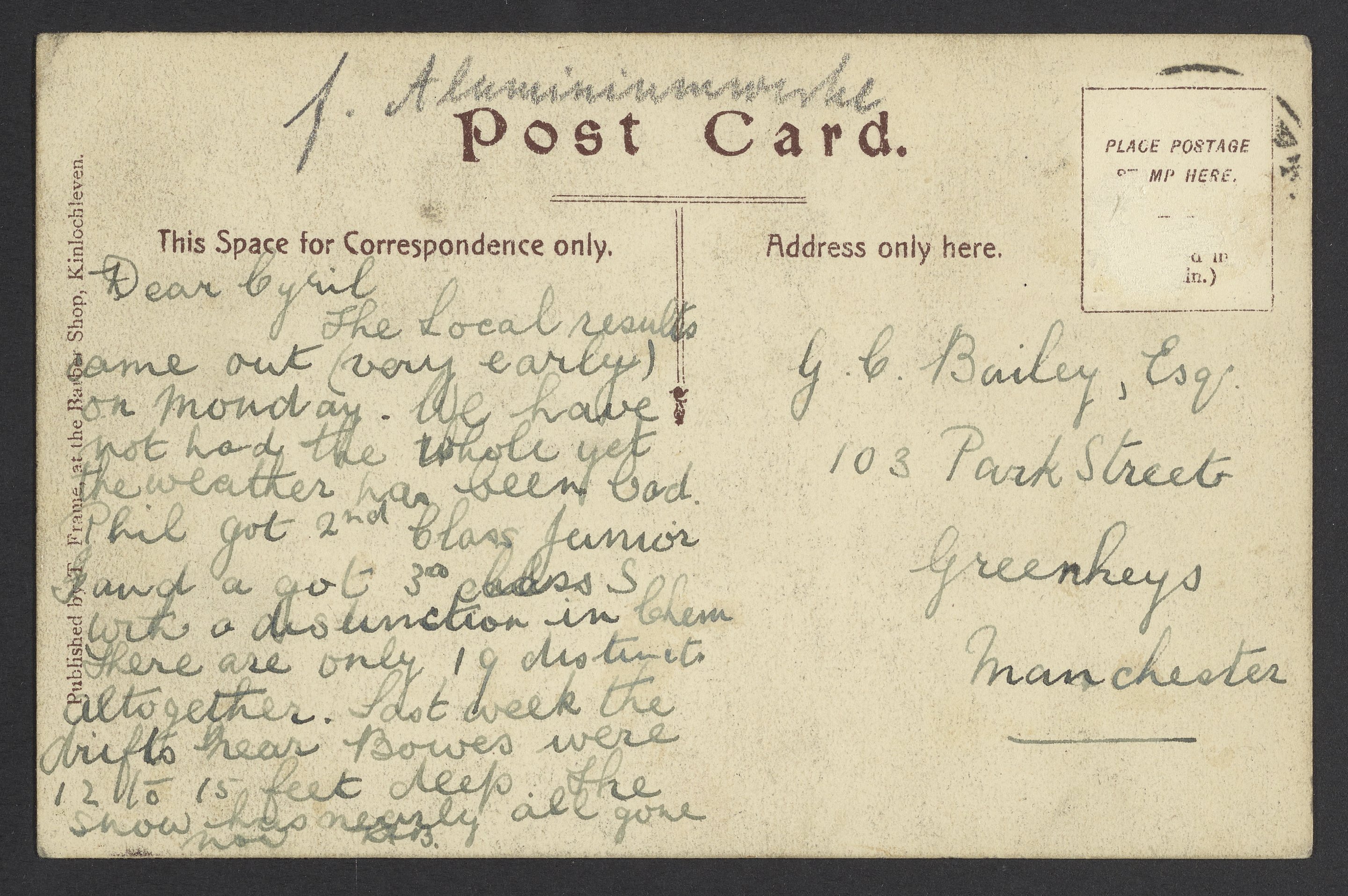 Small JPG1200 x 799px — 295 KBLarge JPG2880 x 1917px — 1.8 MBFull-sized JPG3446 x 2294px — 2.5 MBOriginal fileTIFF — 3446 x 2294px — 22.7 MBPostcard sent to George Cyril Bailey (1890-1972) in Manchester from his brother Kenneth H. Bailey. The front of the postcard features a canteen in Kinlochleven, Scotland. Kenneth writes about the weather and someone named Phil's grades.