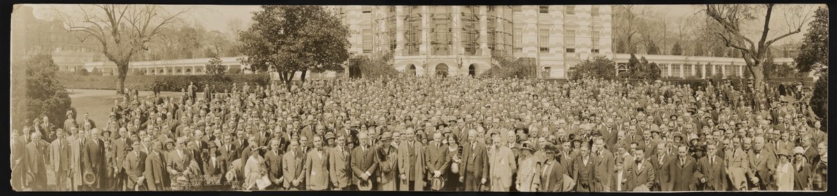 Sepia-toned panoramic photograph of President Calvin Coolidge (1872-1933) standing with members of the American Chemical Society on the White House lawn.