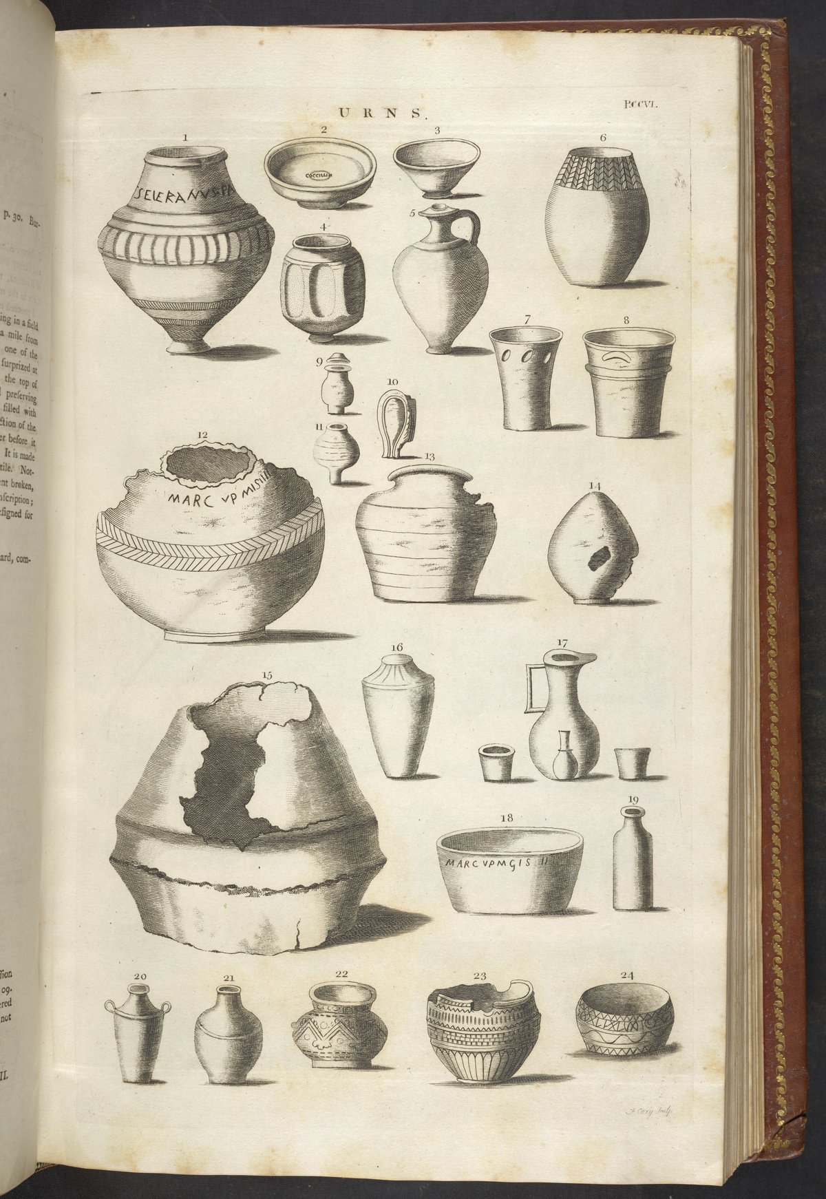 Engraving by English cartographer and engraver John Cary (c. 1754-1835) depicting 24 urns excavated from locations throughout Great Britain.
