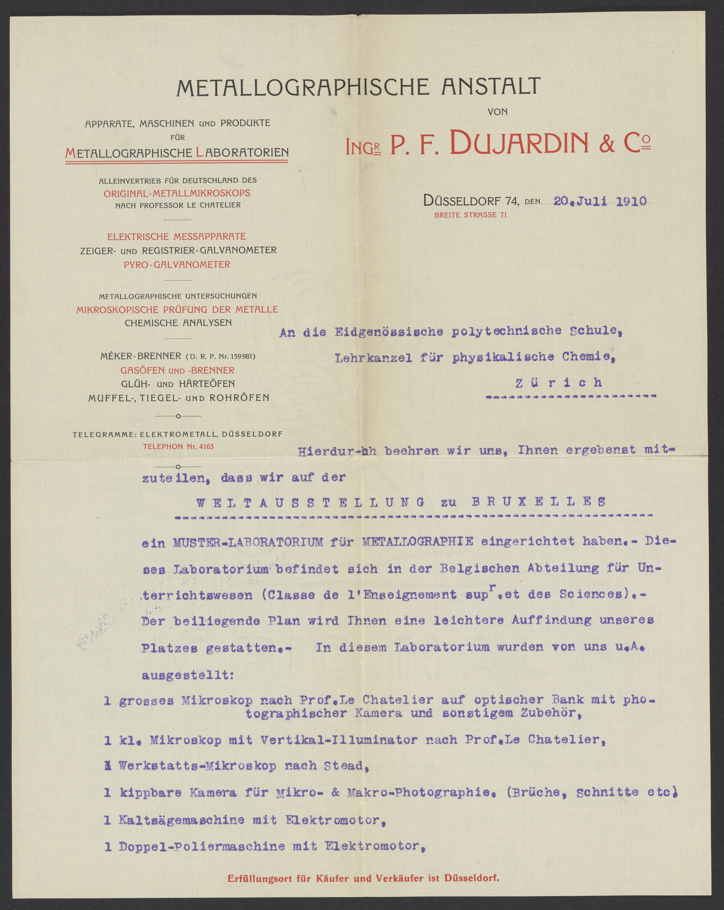 P. F. Dujardin & Co. “Letter from P.F. Dujardin & Co. Advertising Machines and Products for Metallographic Laboratories,” July 20, 1910. Papers of Georg and Max Bredig, Box 3, Folder 3. Science History Institute. Philadelphia. https://digital.sciencehistory.org/works/o15rqfk.