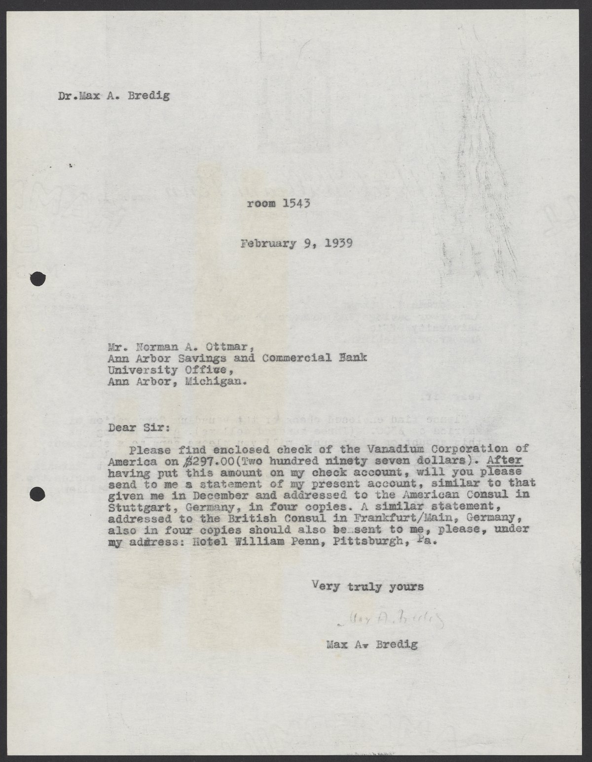 Letter from Max Bredig to Norman A. Ottmar, February 9th, 1939