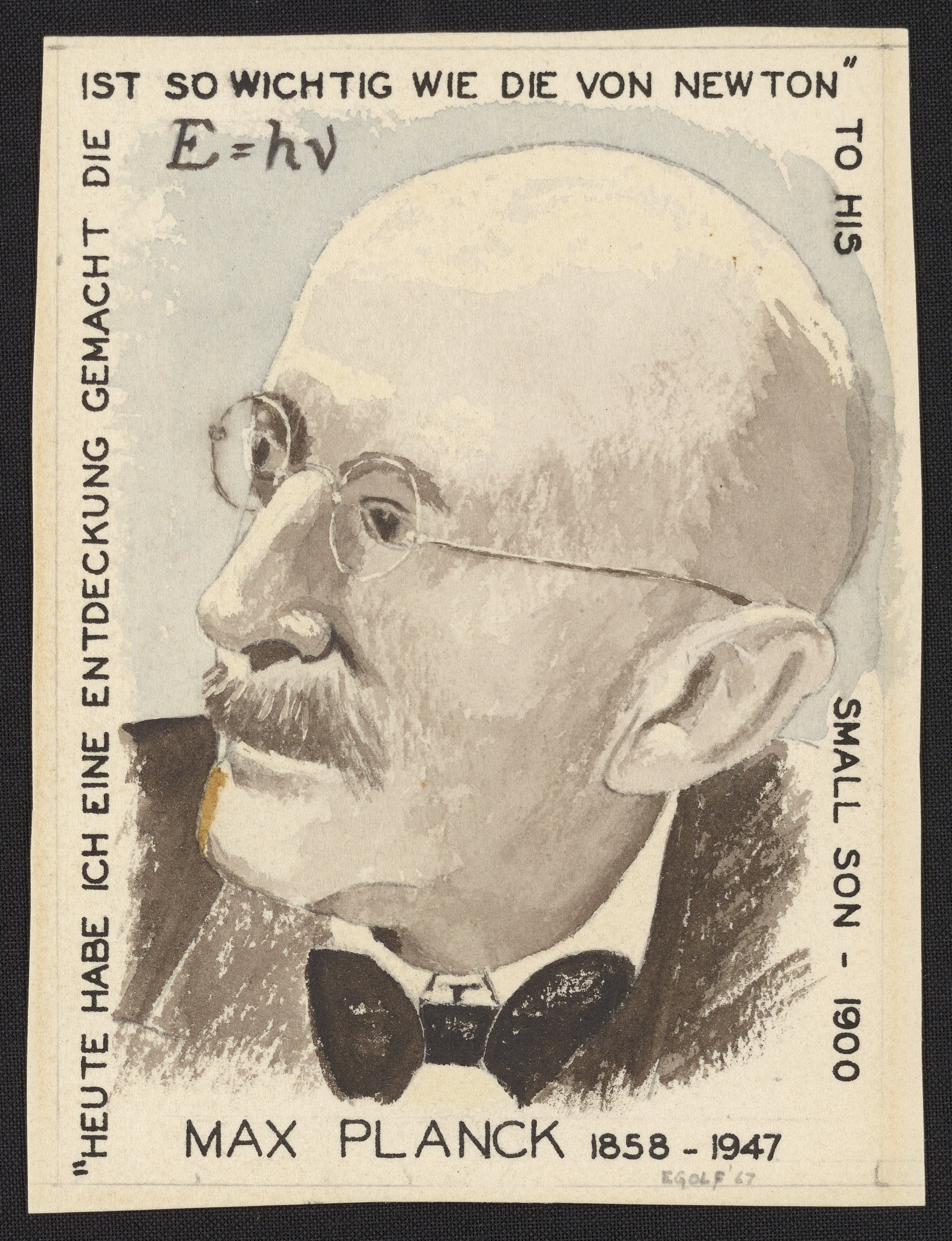 Watercolor portrait of Max Planck (1858-1947). Planck was a German theoretical physicist whose discovery of energy quanta won him the Nobel Prize in Physics in 1918. Planck deduced the relationship between the energy and frequency of radiation, E=hv, where h is a universal constant, now called Planck’s constant. Planck published this derivation in a 1900 paper, which was based on the revolutionary idea that the energy emitted by a resonator could only take on discrete values.
