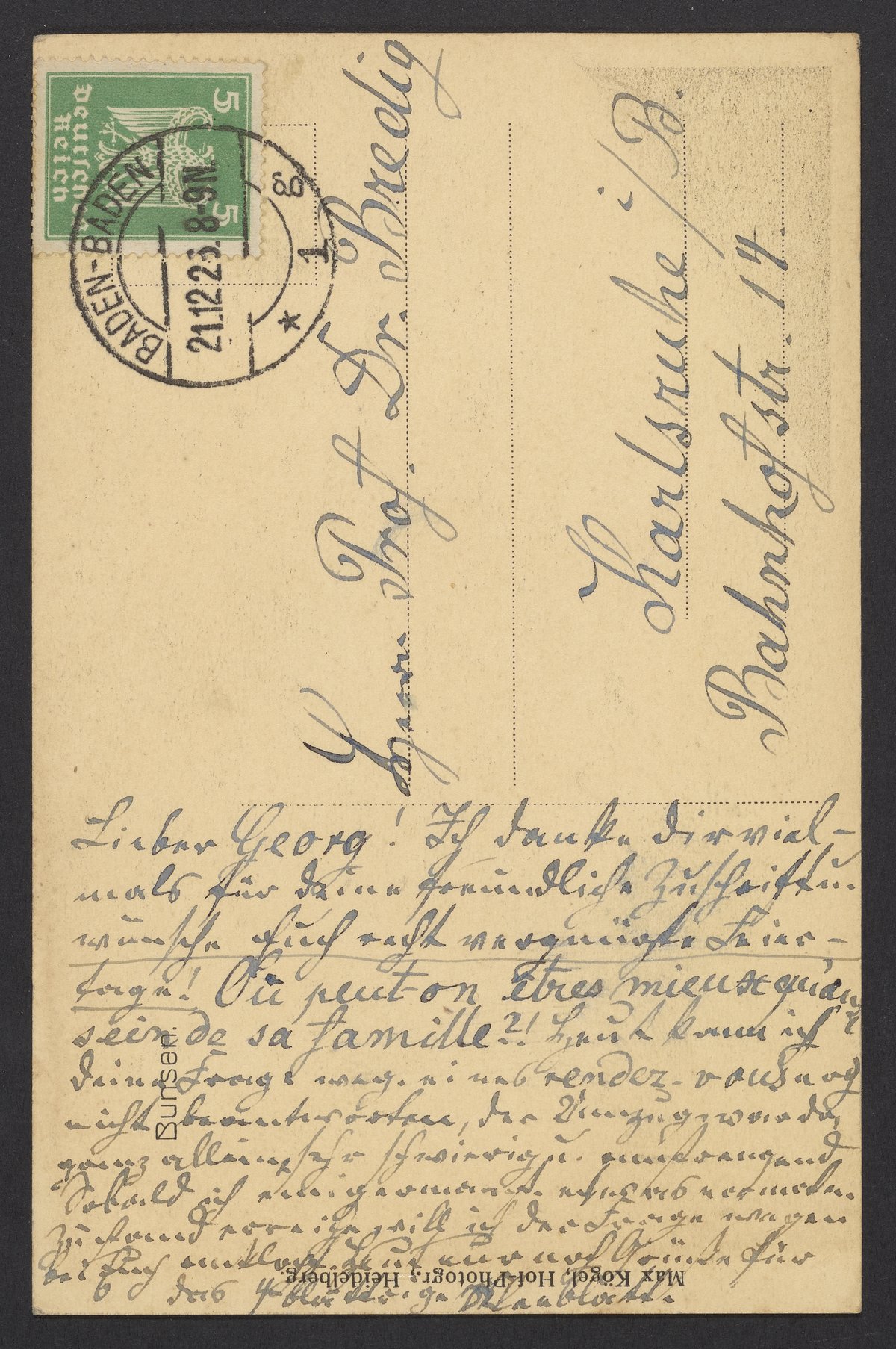 Postcard of Robert Bunsen sent to Georg Bredig