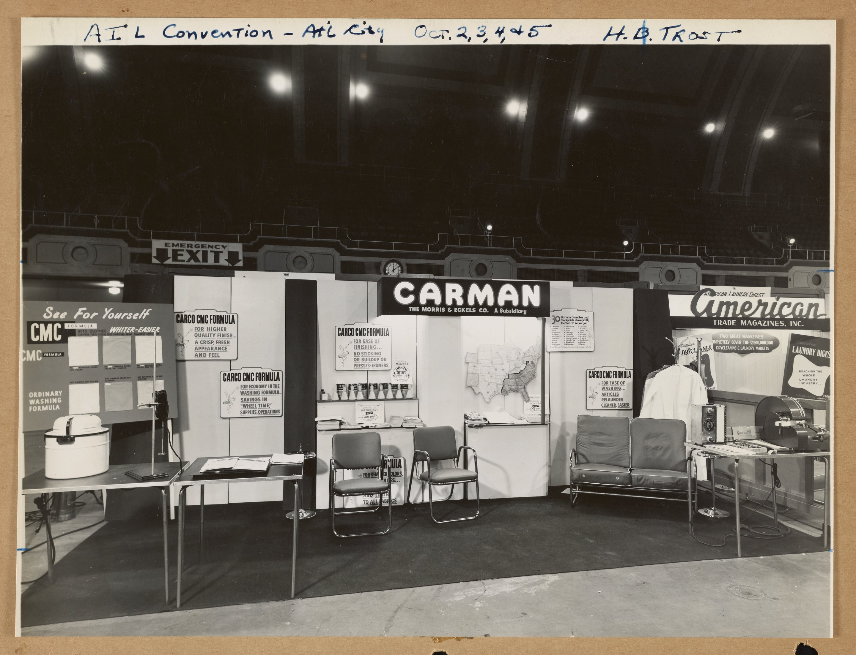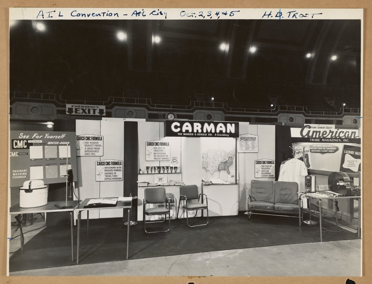 General view of several exhibition displays at the American Institute of Laundering convention held in Atlantic City, New Jersey advertising Carco CMC (sodium carboxymethylcellulose) for use in detergents.