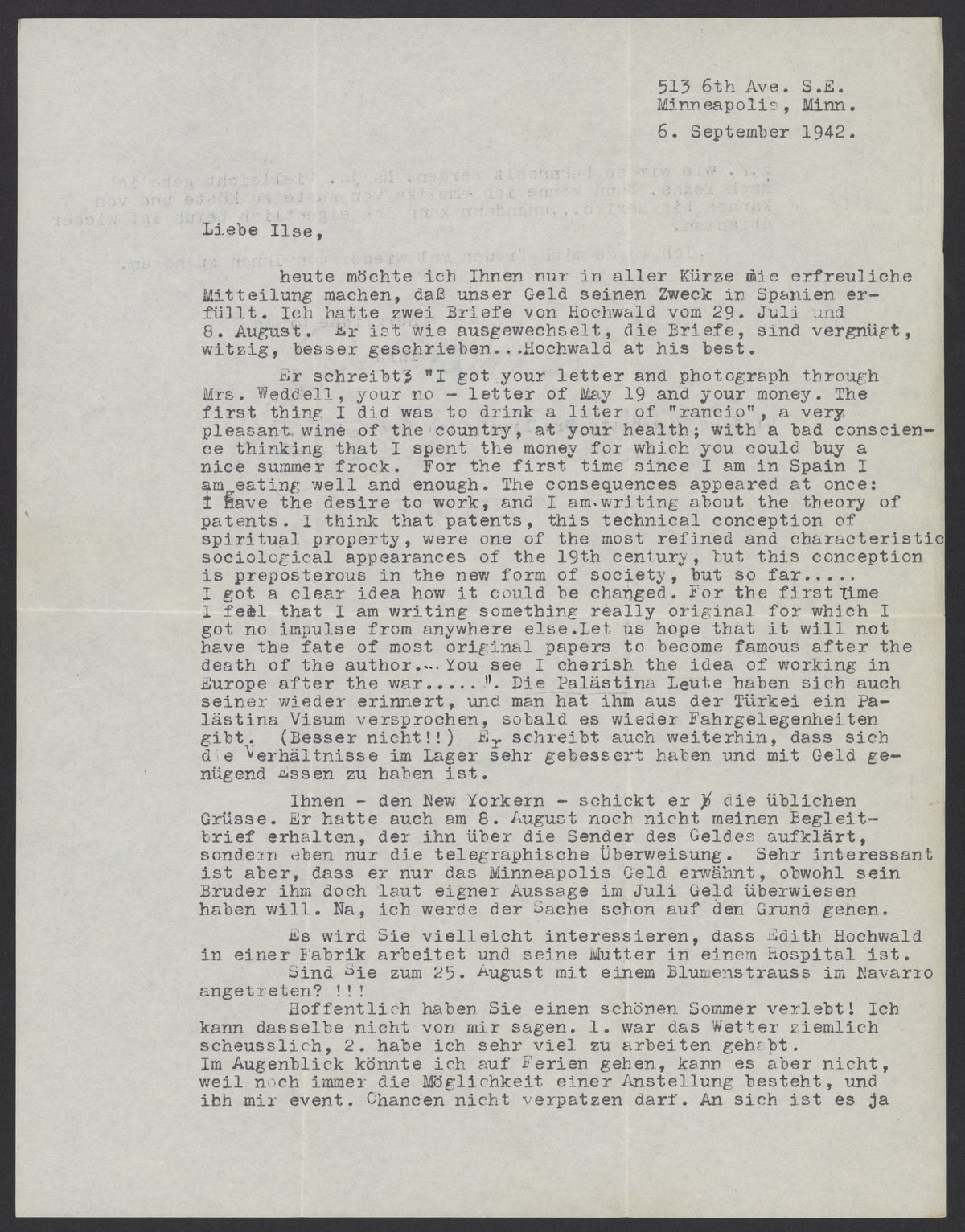 heute möchte ich Ihnen nur in aller Kürze die erfreuliche Mitteilung machen, dass unser Geld seinen Zweck in Spanien erfüllt. Ich hatte zwei Briefe von Hochwald von 29. Juni und 8. August. Er ist wie ausgewechselt, die Briefe, sind vergnügt, witzig, besser geschrieben...Hochwald at his best.