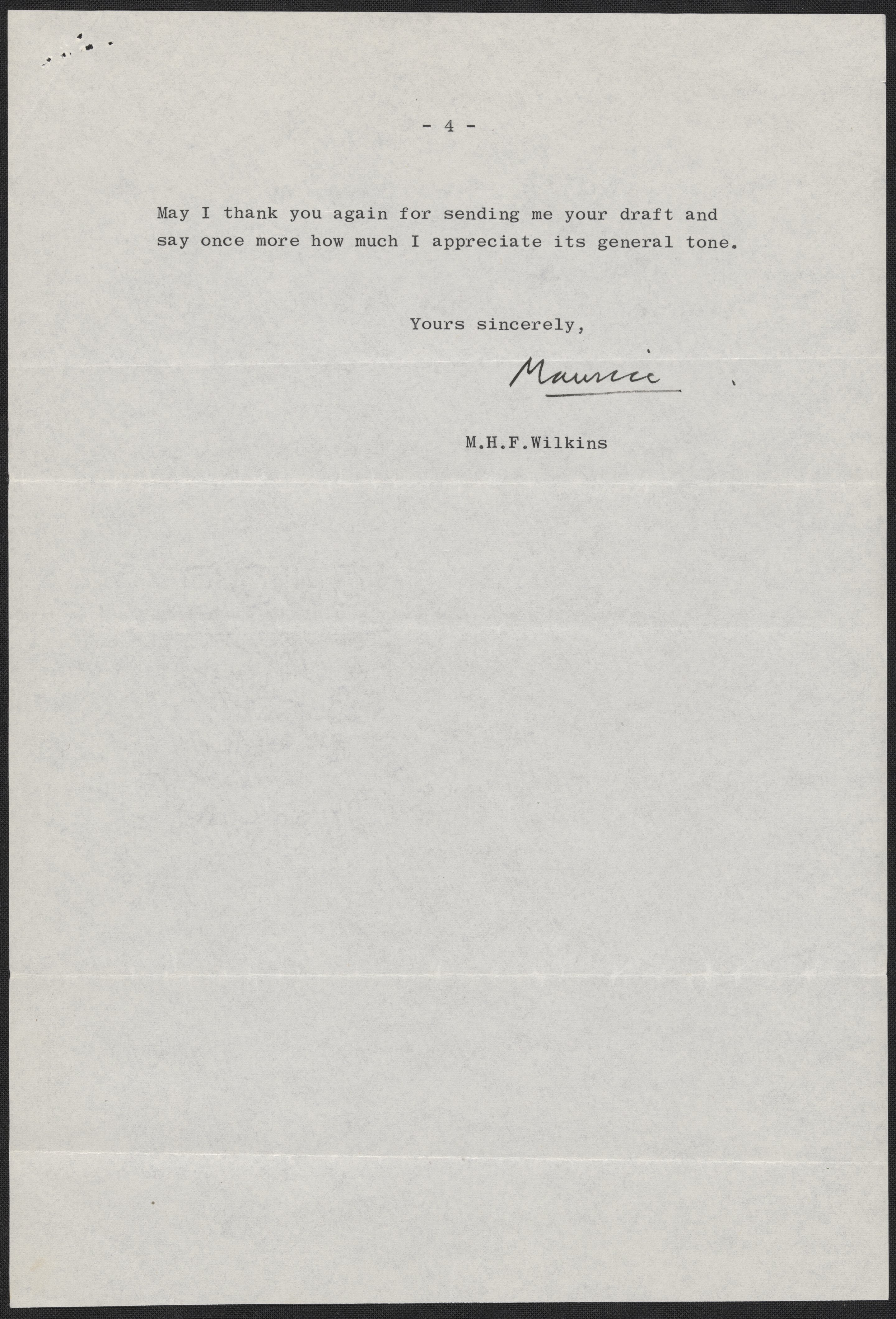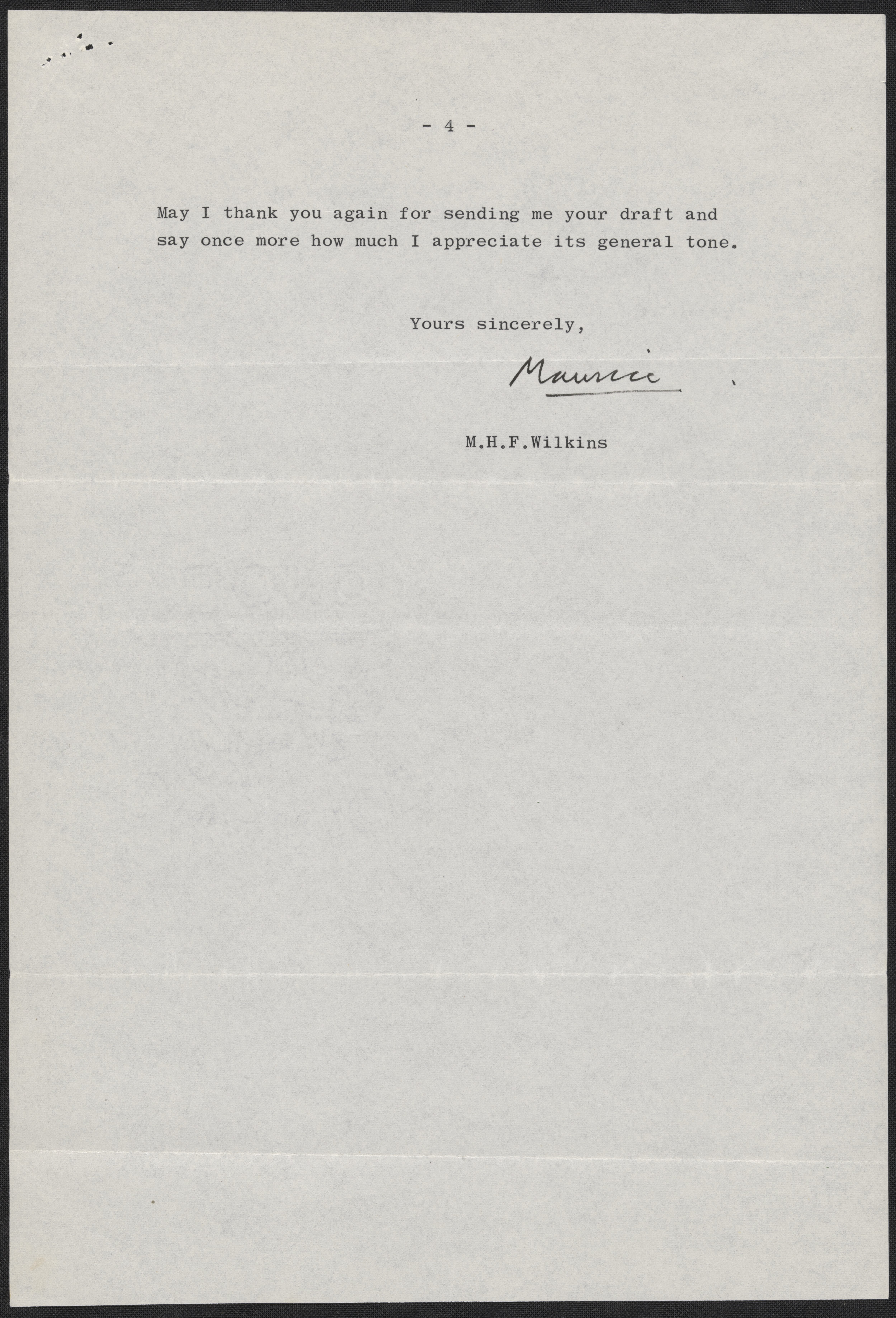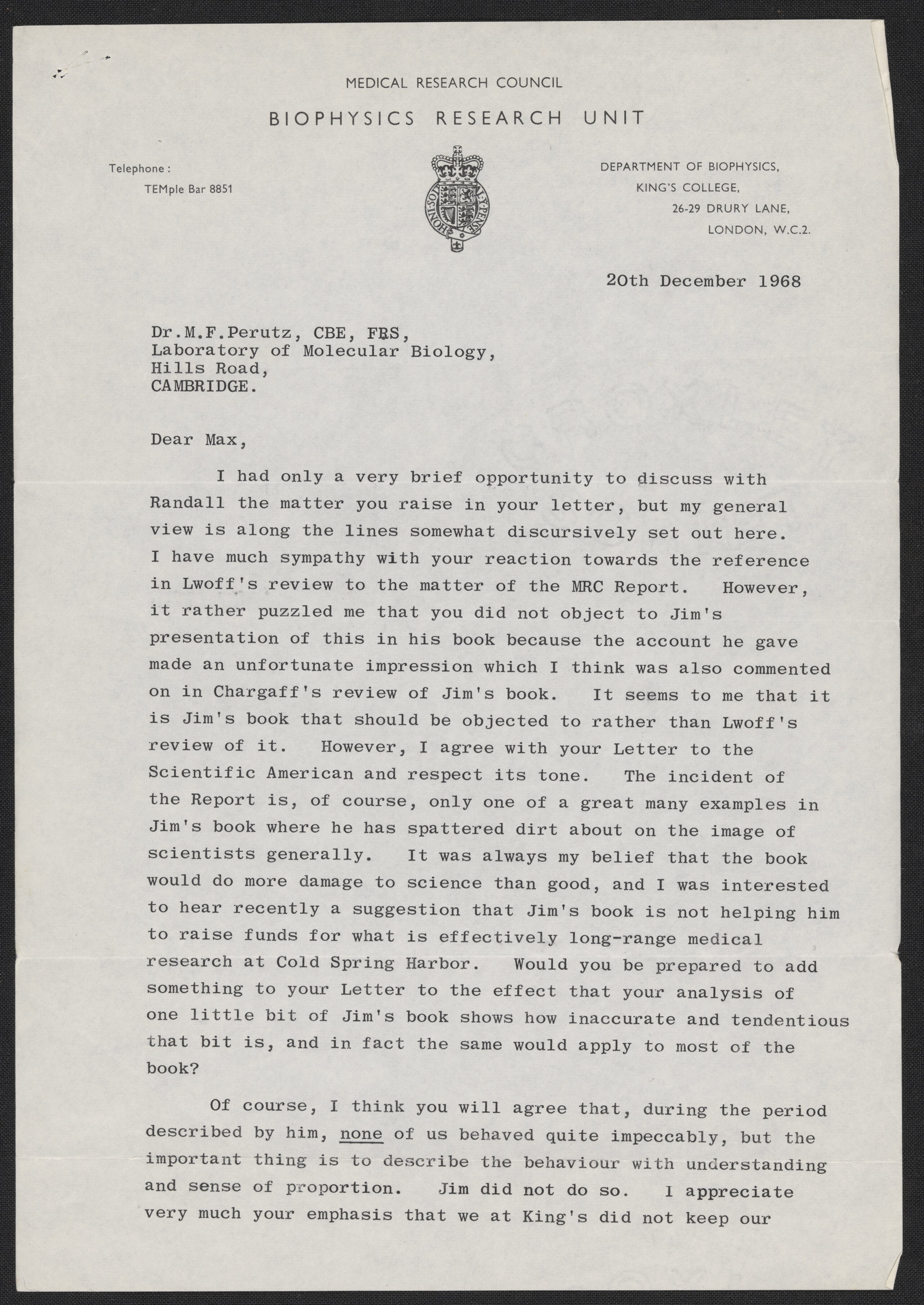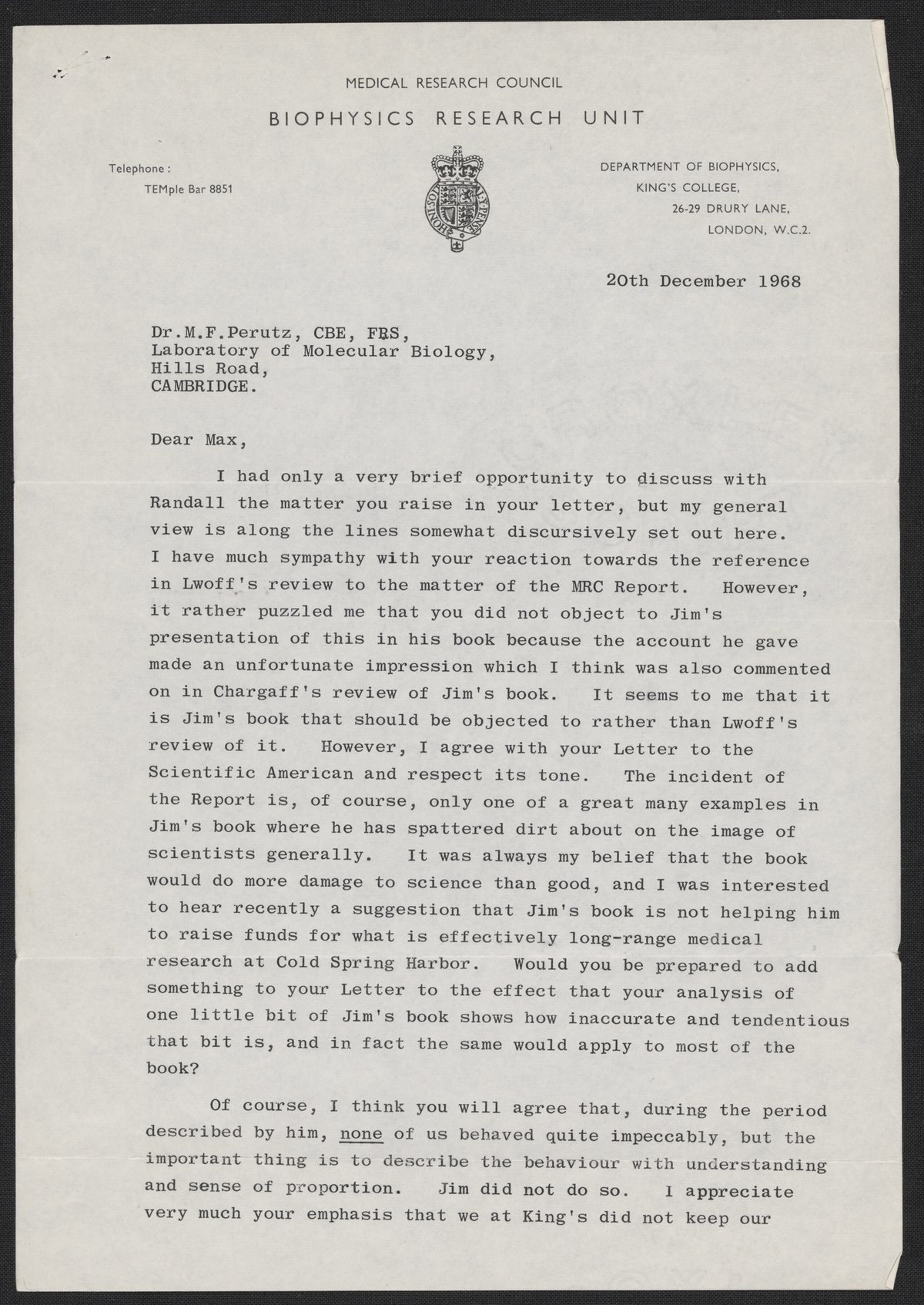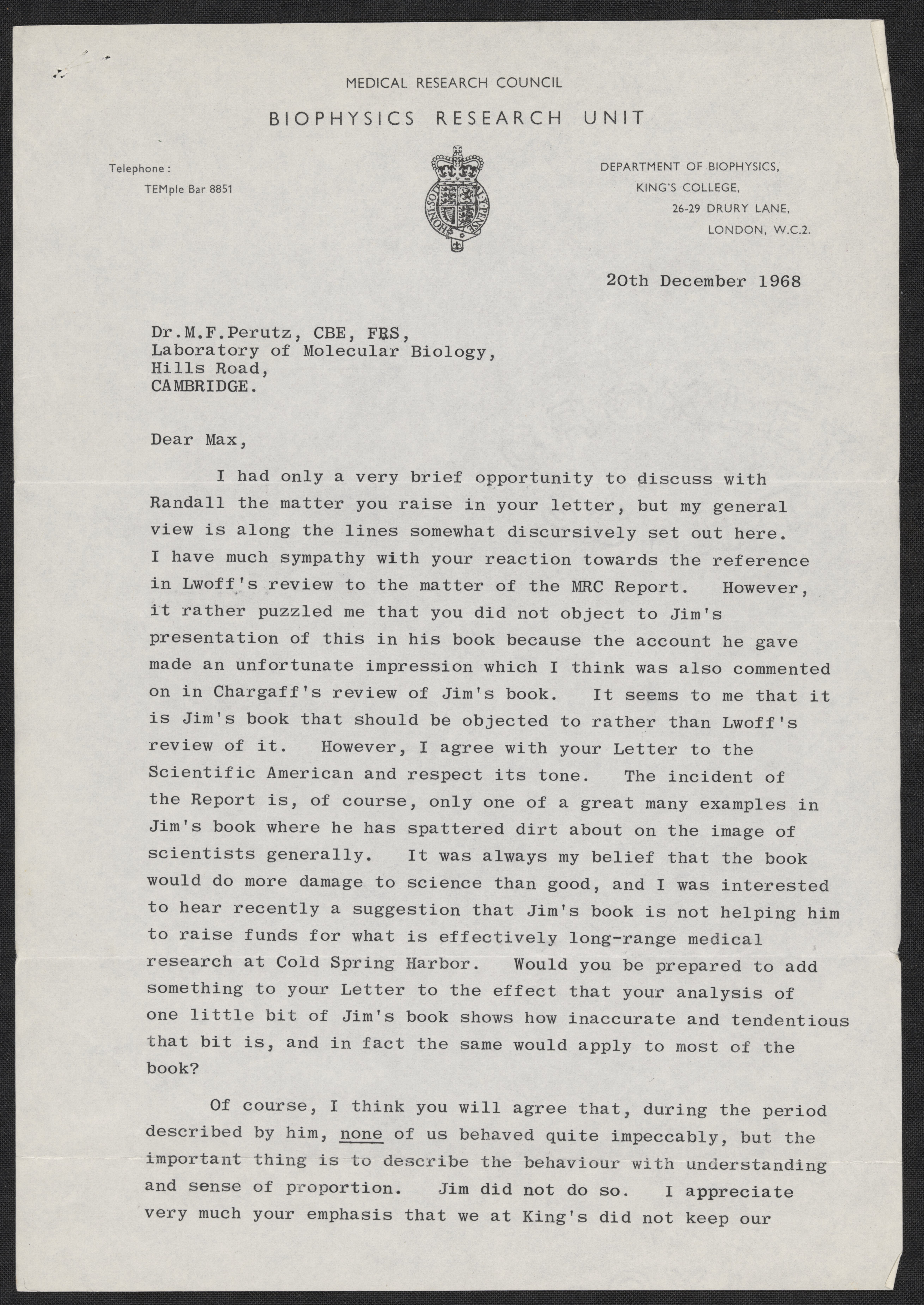 Letter from Maurice Wilkins to Max Perutz, December 20, 1968