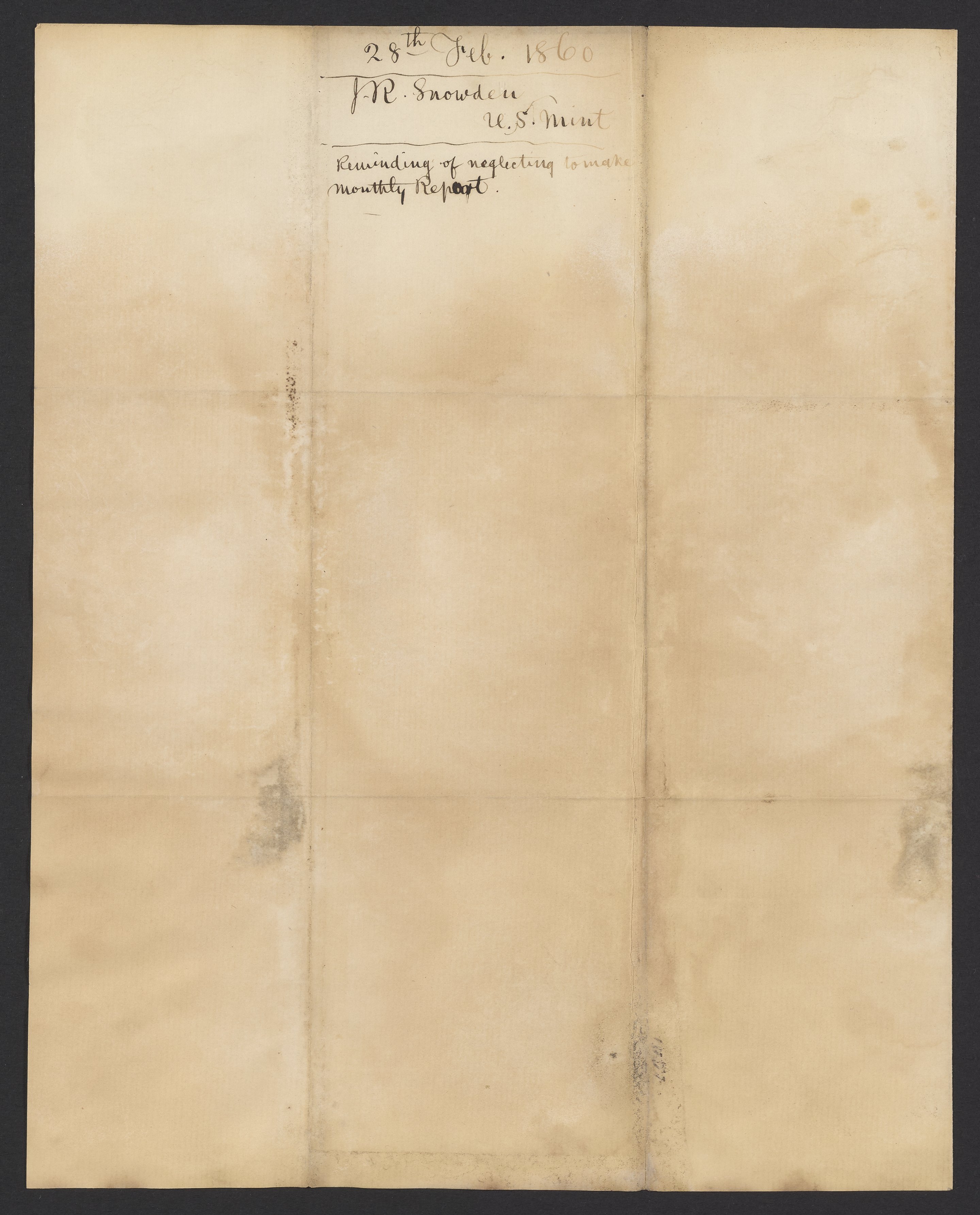 Small JPG1200 x 1491px — 194 KBLarge JPG2880 x 3579px — 1.0 MBFull-sized JPG3374 x 4193px — 1.4 MBOriginal fileTIFF — 3374 x 4193px — 40.5 MBJames Ross Snowden (1809-1878) writes to James Curtis Booth (1810-1888) reminding Booth that he has neglected to make his Monthly Report.