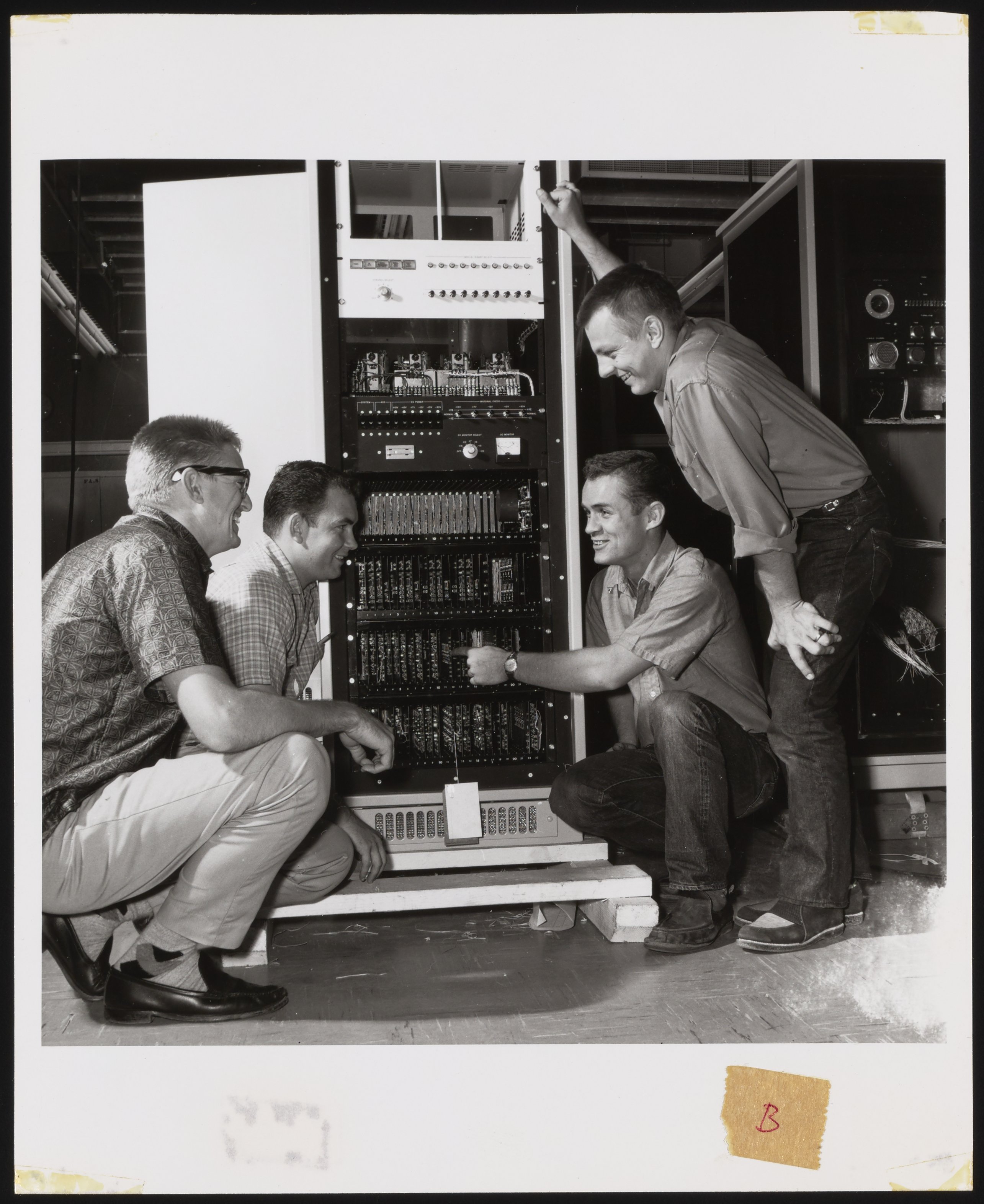General view of several Beckman Instruments employees inspecting a receiver cabinet purchased by the Thiokol Chemical Company. The employees visible in the photographs are identified as follows (left to right): Jim [indecipherable] Adams; Bob Huizinga; Bob Condit; and Gordon Kuh.