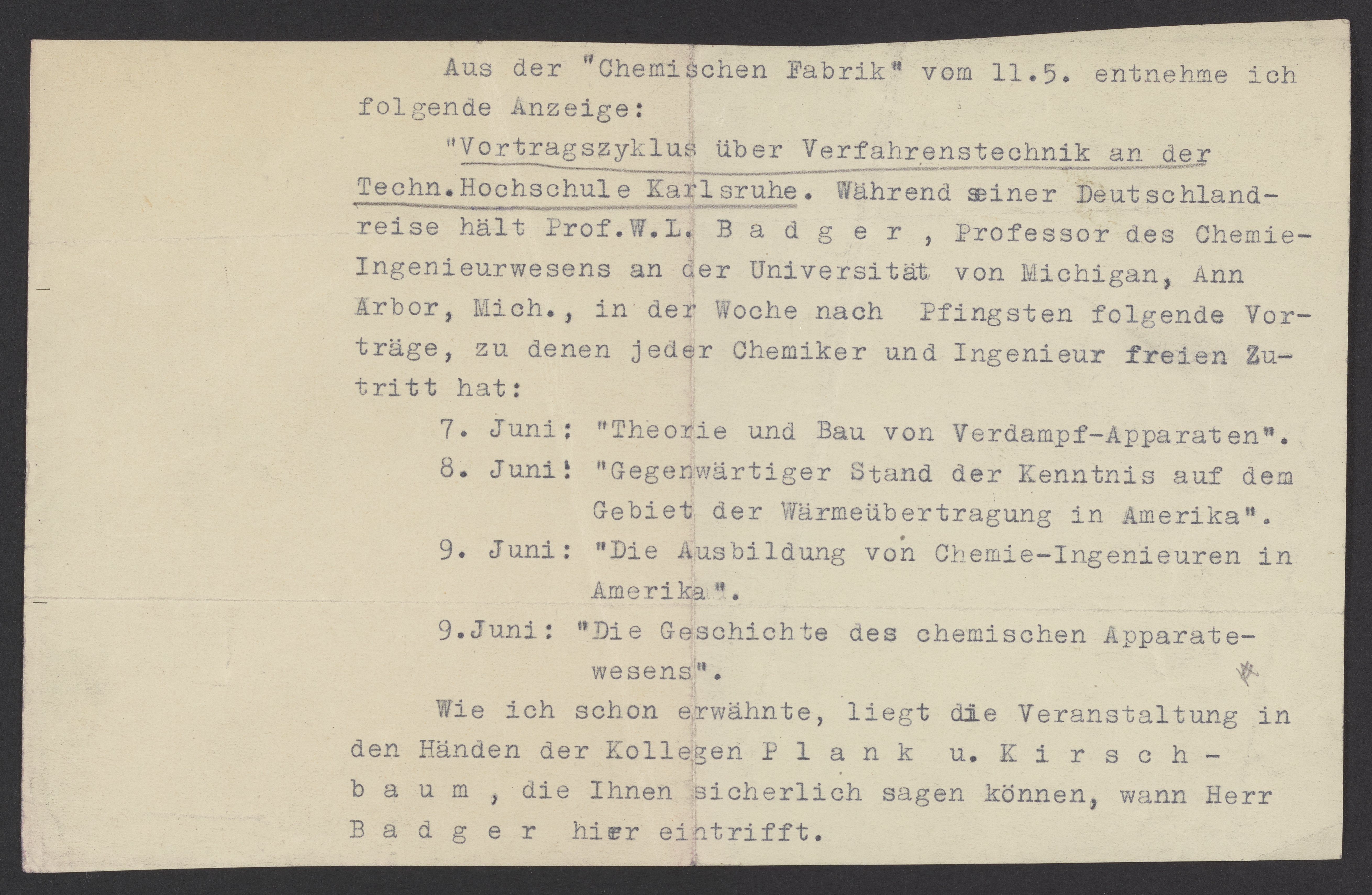 "Vertragszyklus über Verfahrenstechnik" an der Tech.Hochschule. Karlsruhe. Während seiner Deutschlandreise hält Prof. W.L. Badger, Professor des Chemie-Ingenieurwesens an der Universität von Michigan, Ann Arbor, Mich., in der Woche nach Pfingsten folgende Vorträge, zu denen jeder Chemiker und Ingenieur freien Eintritt hat: