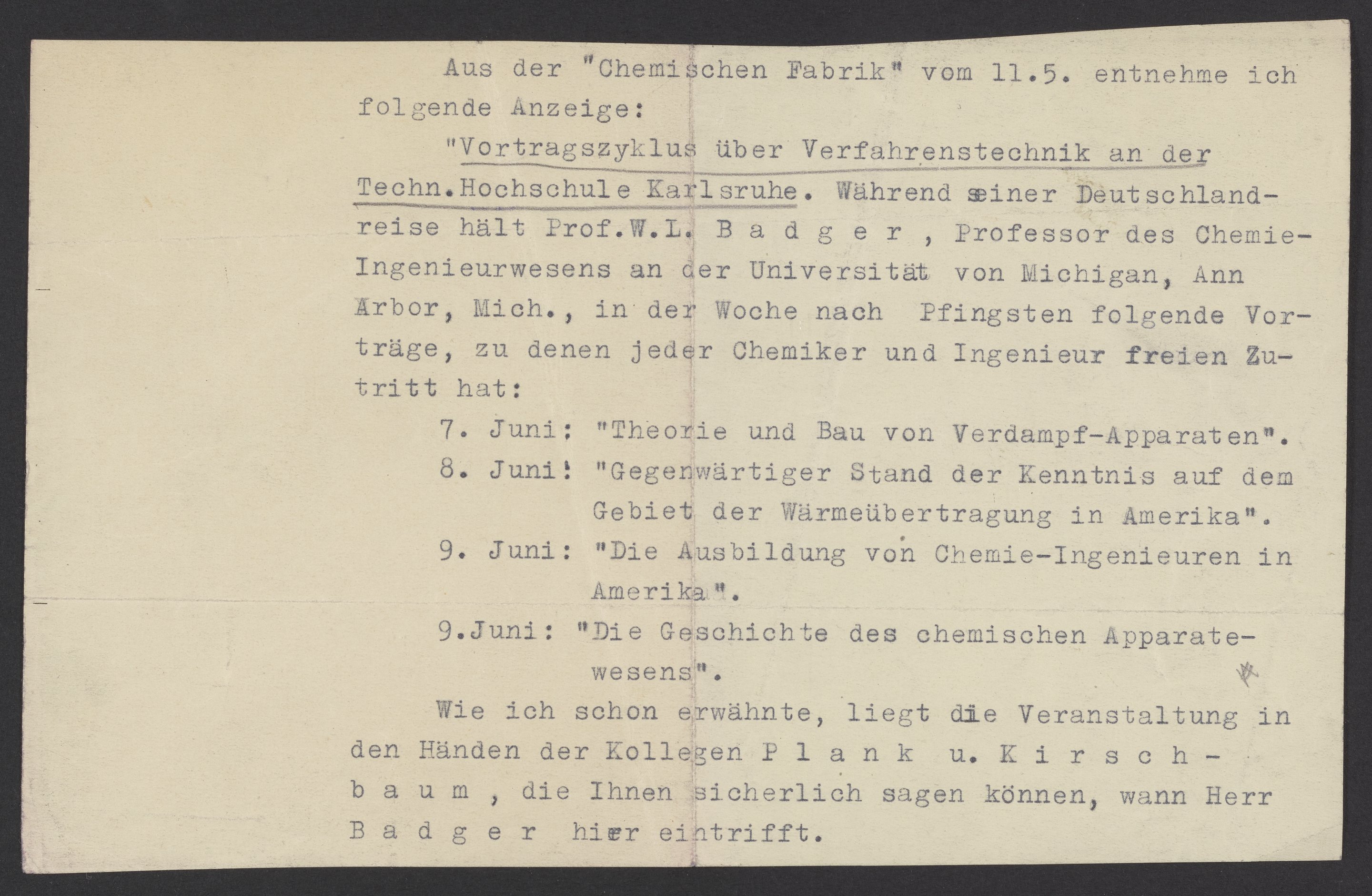 "Lecture Series on Process Engineering” at the Karlsruhe Technical University. During his trip to Germany, Prof. W.L. Badger, Professor of Chemical Engineering at the University of Michigan, Ann Arbor, Michigan, will give the following lectures in the week after Pentecost, to which every chemist and engineer has free admission: