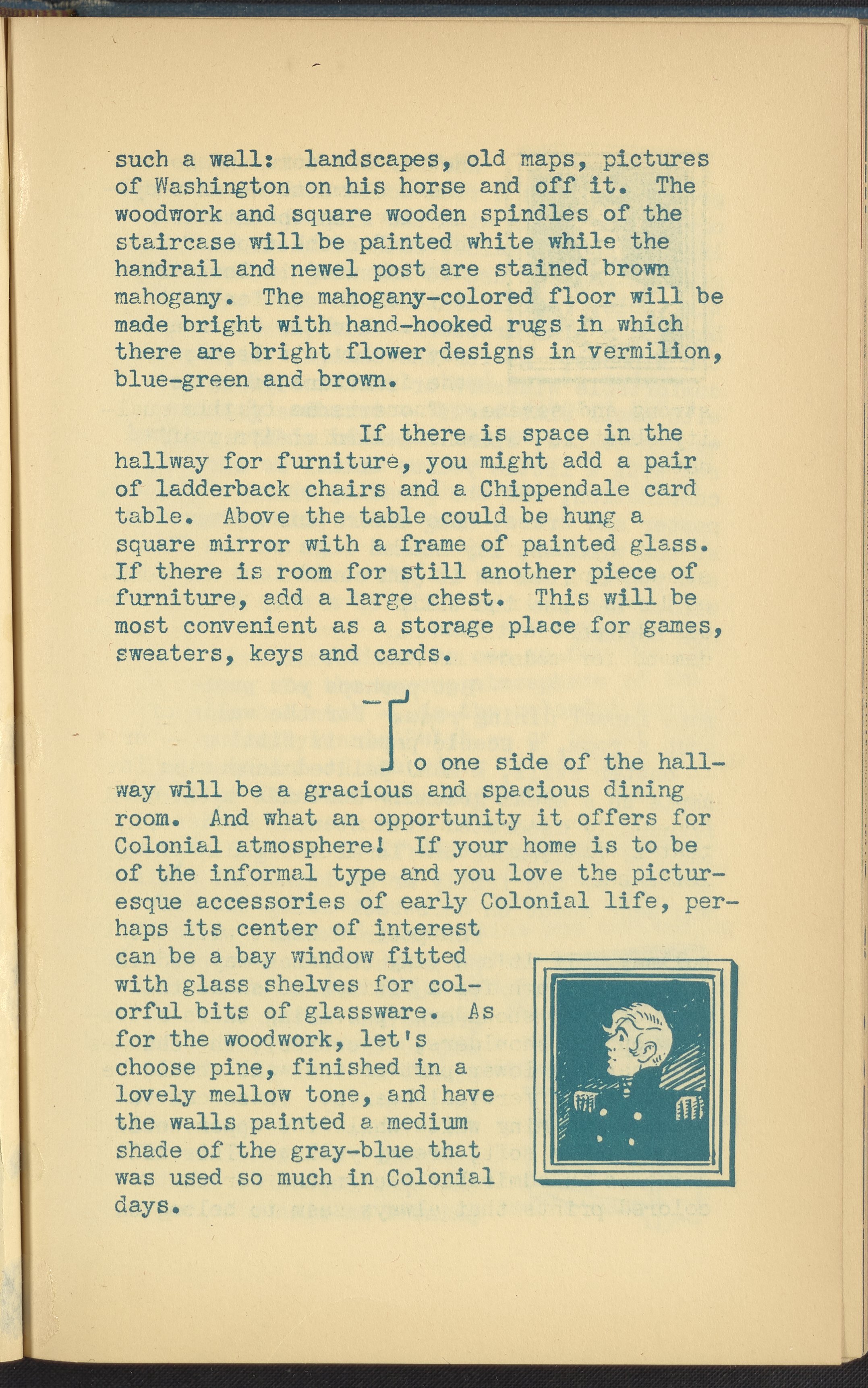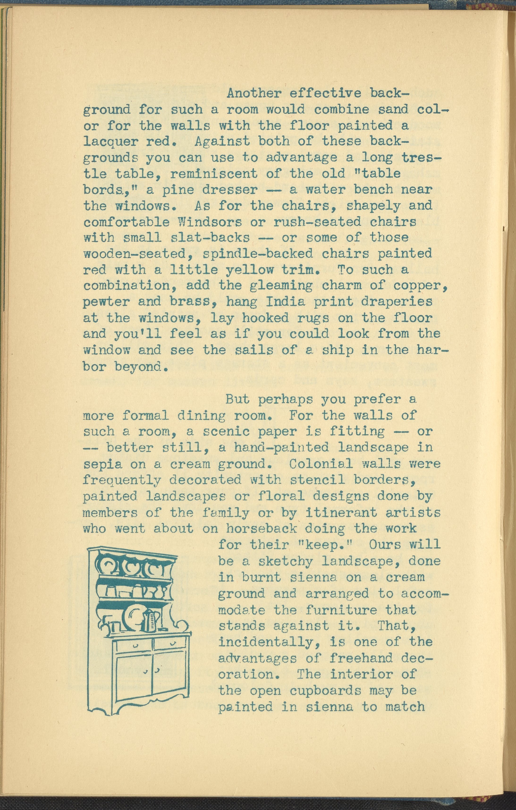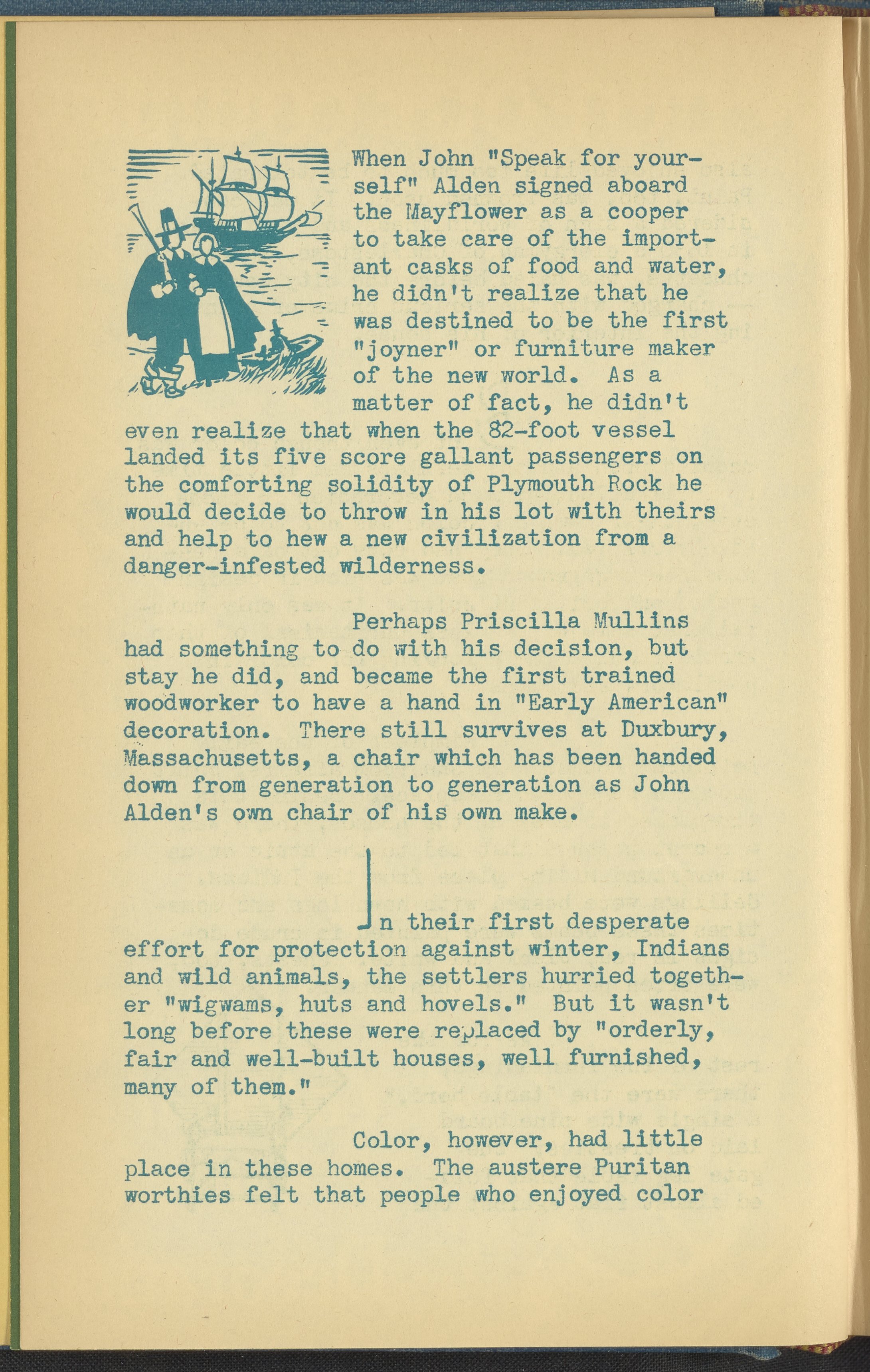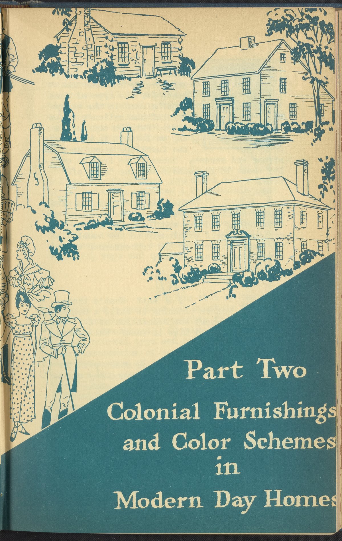 Booklet corresponding to a radio broadcast program created by the National Paint, Varnish, and Lacquer Association. The booklet consists of two parts. Part one describes home decoration of early American colonists, specifically, how color was used and what colors were preferred, how furniture was crafted and styled, and the differences in interior design by region. Part two provides instruction for choosing color schemes and furniture in order to decorate one's home in a colonial style. Includes small stylized illustrations throughout and decorated covers.