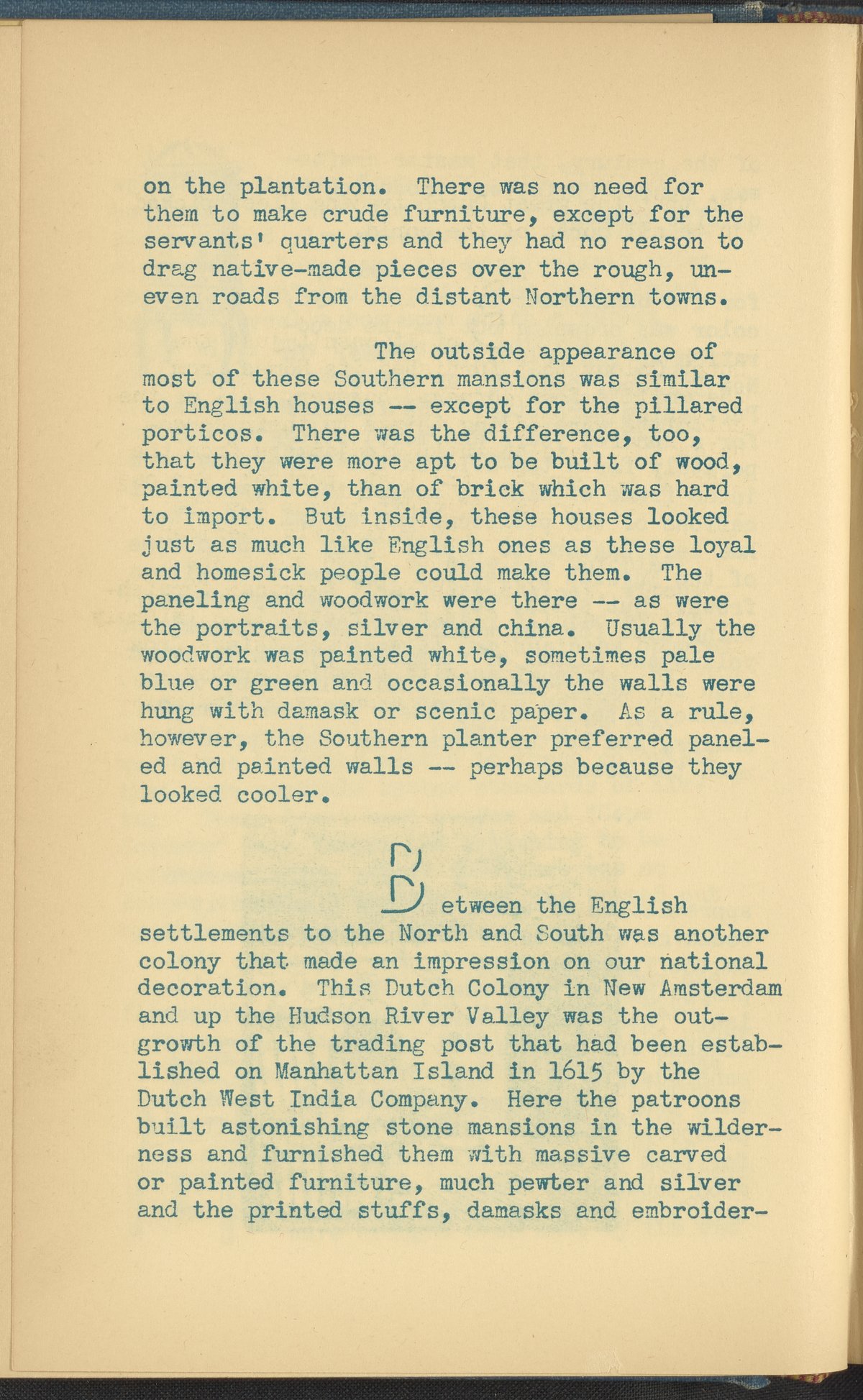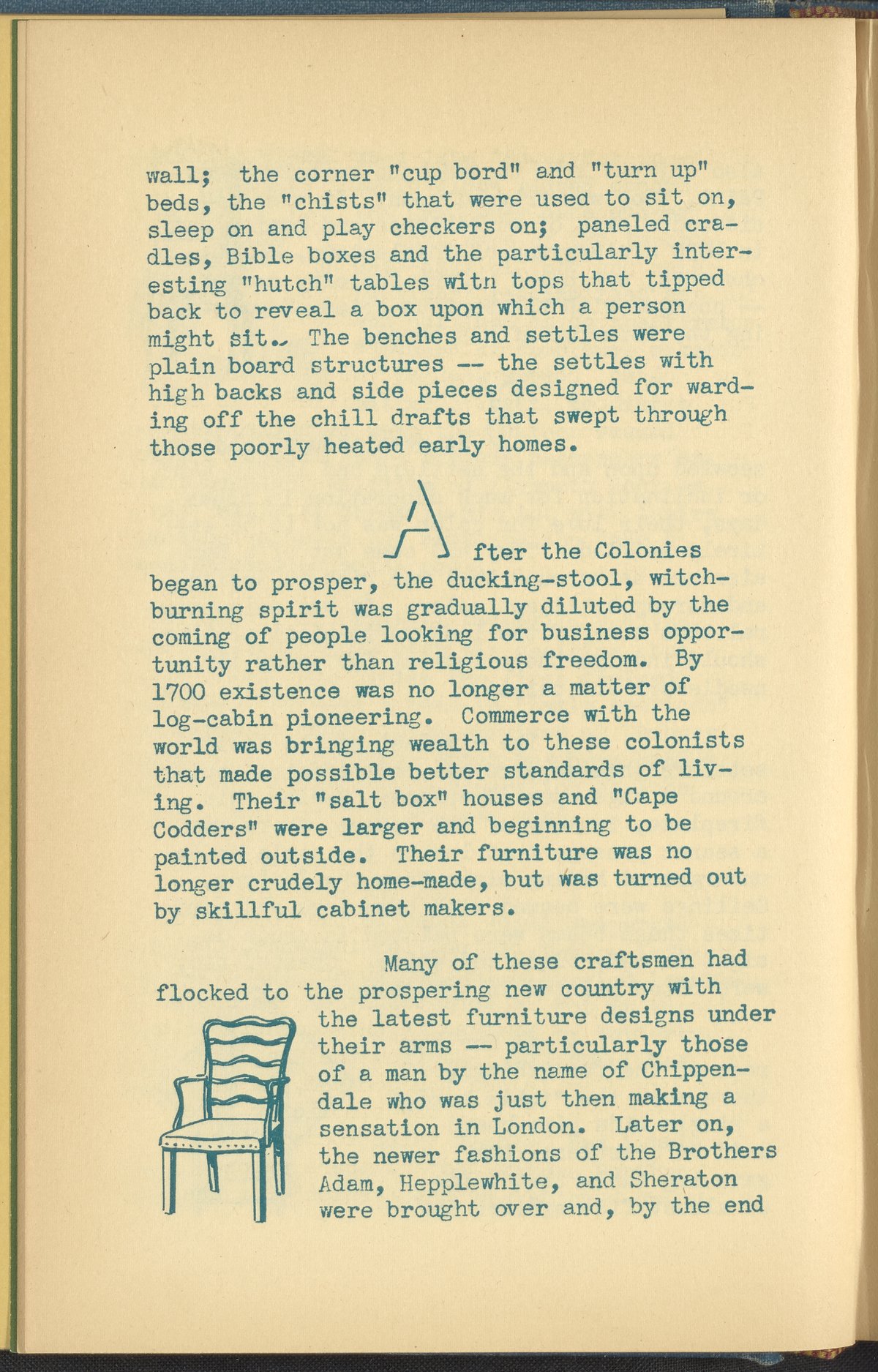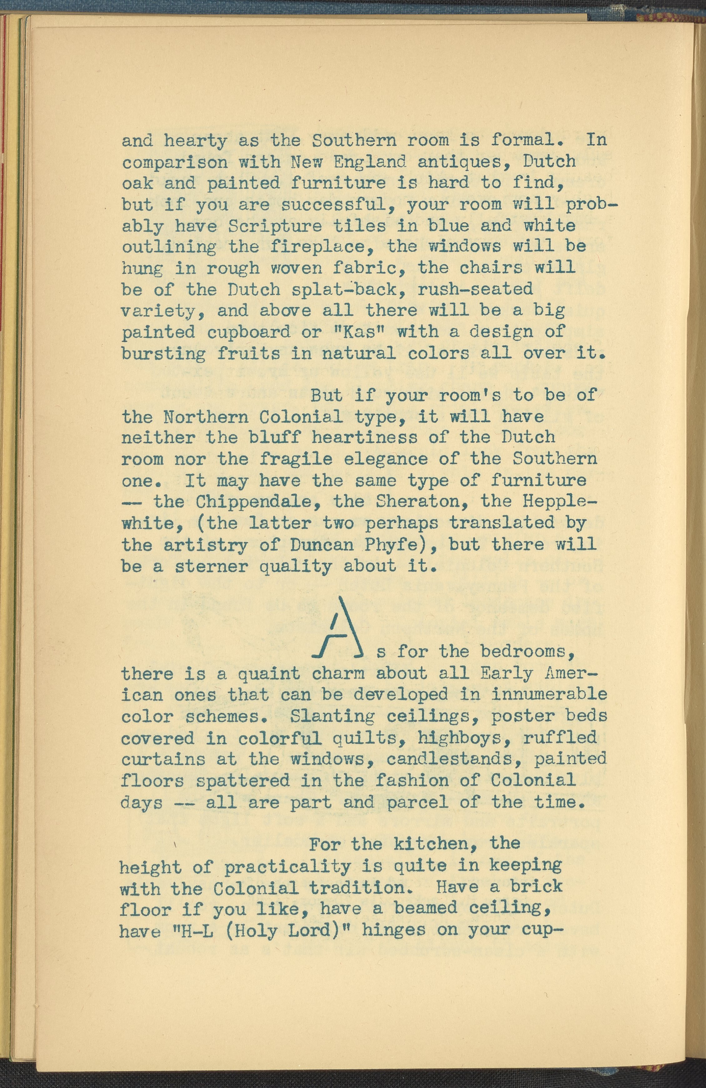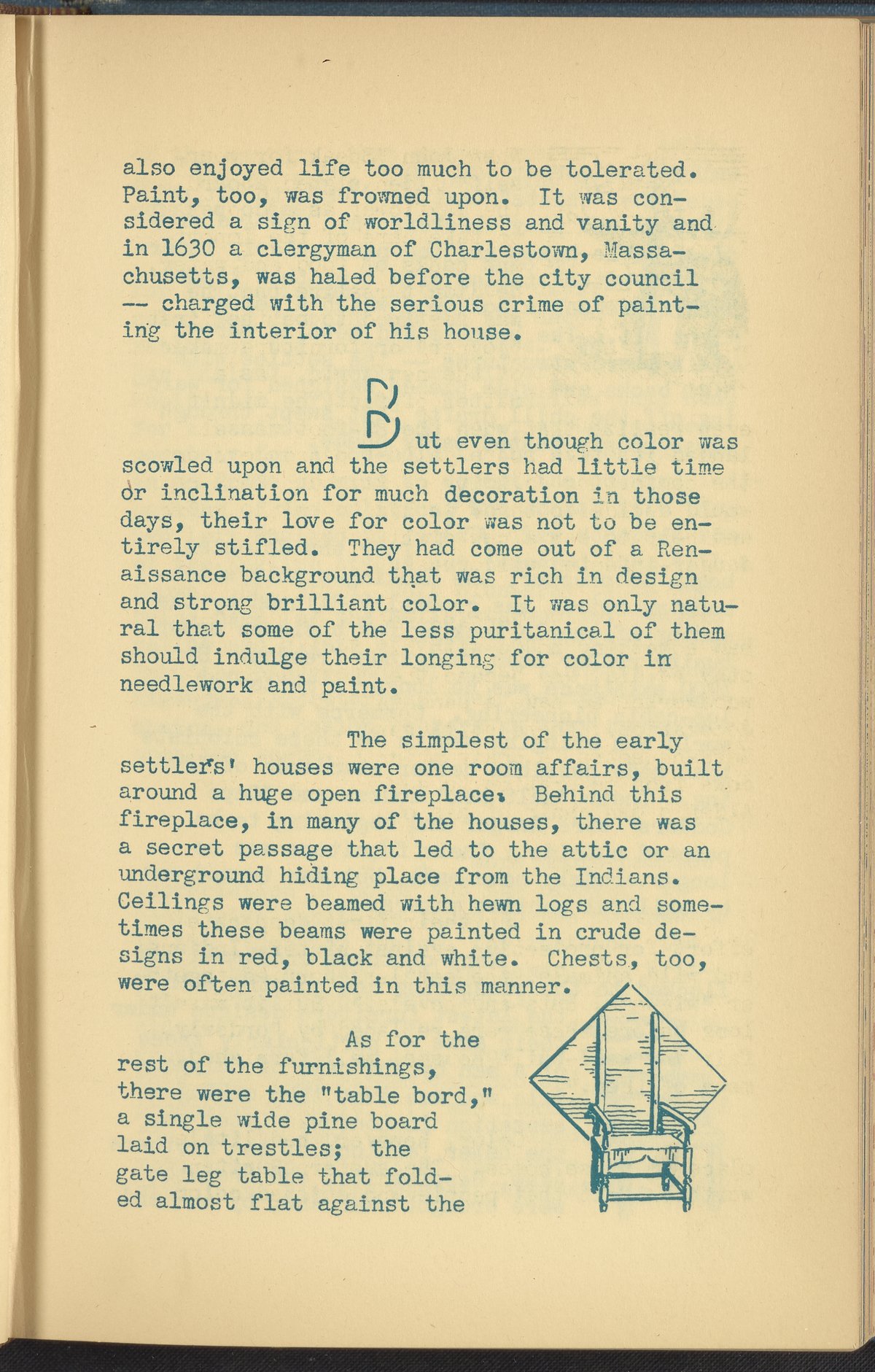 Booklet corresponding to a radio broadcast program created by the National Paint, Varnish, and Lacquer Association. The booklet consists of two parts. Part one describes home decoration of early American colonists, specifically, how color was used and what colors were preferred, how furniture was crafted and styled, and the differences in interior design by region. Part two provides instruction for choosing color schemes and furniture in order to decorate one's home in a colonial style. Includes small stylized illustrations throughout and decorated covers.