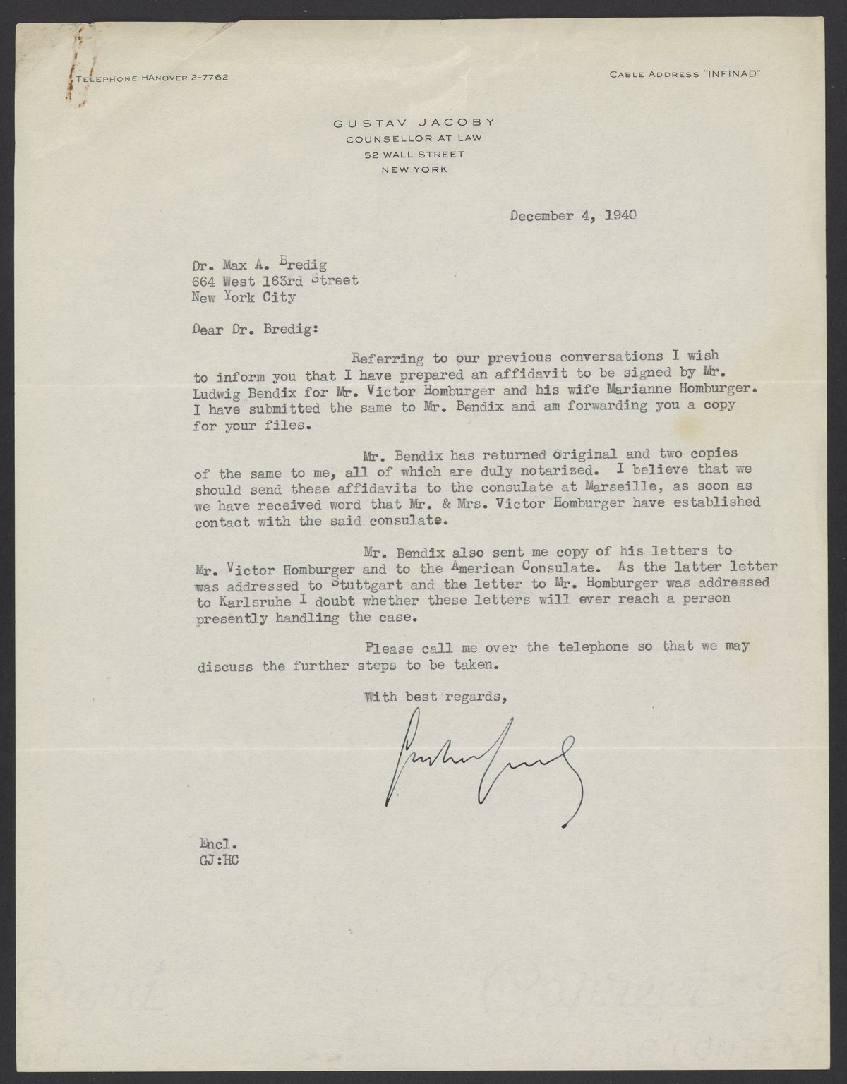 Gustav Jacoby, a New York immigration lawyer, informs Max Bredig (1902-1977) of his progress towards preparing an affidavit for Bredig's brother-in-law, Viktor Homburger (1888-1968).