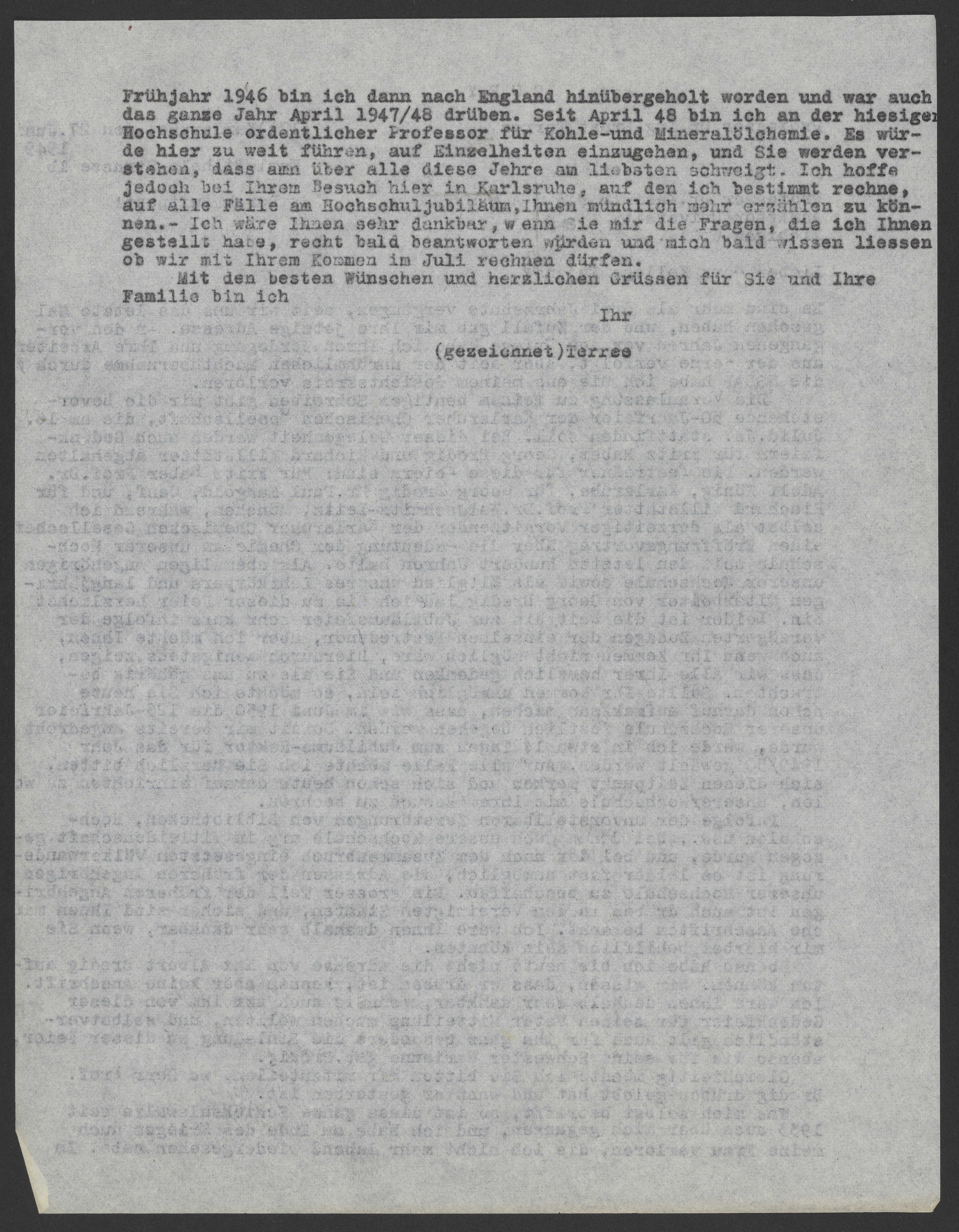 Im Frühjahr 1946 bin ich dann nach England hinübergeholt worden und war auch das ganze Jahr April 1947/48 drüben. Seit April 48 bin ich an der hiesigen Hochschule ordentlicher Professor für Kohl-und Mineralölchemie. Es würde hier zu weit führen auf Einzelheiten einzugehen, und Sie werden verstehen, dass man über alle diese Jahre am liebsten schweigt. Ich hoffe jedoch bei Ihrem Besuch hier in Karlsruhe, auf den ich bestimmt rechne, auf alle Fälle an Hochschuljubiläum, Ihnen mündlich mehr erzählen zu können. – Ich wäre Ihnen sehr dankbar, wenn Sie mir die Fragen, die ich Ihnen gestellt habe, recht bald beantworten würden und mich bald wissen liessen, ob wir mit Ihrem Kommen im Juli rechnen dürfen.
