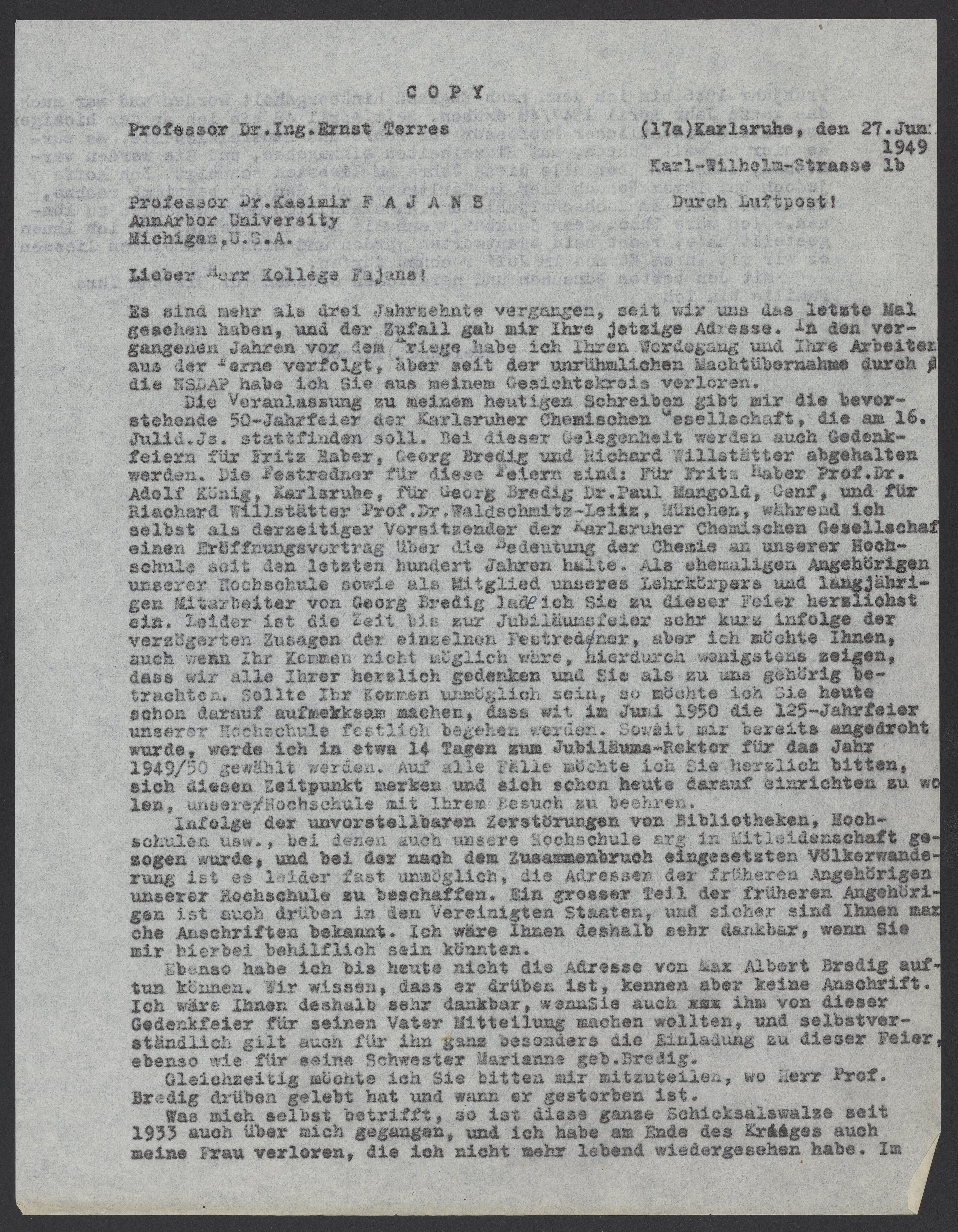 Die Veranlassung zu meinem heutigen Schreiben gibt mir die bevorstehende 50-Jahrfeier der Karlsruher Chemischen Gesellschaft, die am 16. Juli d.Js. stattfinden soll. Bei dieser Gelegenheit werden auch Gedenkfeier für Fritz Haber, Georg Bredig und Richard Willstätter abgehalten werden. Die Festredner für diese Feiern sind: Für Fritz Haber Prof. Dr. Adolf König, für Georg Bredig Dr. Paul Mangold, Genf, und für Richard Willstätter Prof. Dr. Waldschmitz-Leitz, München, während ich selbst als derzeitiger Vorsitzender der Karlsruher Chemischen Gesellschaft einen Eröffnungsvortrag über die Bedeutung der Chemie an unserer Hochschule seit den letzten hundert Jahren halte. Als ehemaligen Angehörigen unserer Hochschule sowie als Mitglied unseres Lehrkörpers und langjährigen Mitarbeiter von Georg Bredig lade ich Sie zu dieser Feier herzlichst ein. Leider ist die Zeit bis zur Jubiläumsfeier sehr kurz infolge der verzögerten Zusagen der einzelnen Festredner, aber ich möchte Ihnen, auch wenn Ihr Kommen nicht möglich wäre, hierdurch wenigstens zeigen, dass wir alle Ihrer herzlich gedenken und Sie als zu uns gehörig betrachten. Sollte Ihr Kommen unmöglich sein, so möchte ich Sie heute schon darauf aufmerksam machen, dass wir im Juni 1950 die 125-Jahrfeier unserer Hochschule festlich begehen werden. Soweit mir bereits angedroht wurde, werde ich in etwa 14 Tagen zum Jubiläums-Rektor für das Jahr 1949/50 gewählt werden. Auf alle Fälle möchte ich Sie herzlich bitten, sich diesem Zeitpunkt merken und sich schon heute darauf einrichten zu wollen, unsere Hochschule mit Ihrem Besuch zu beehren.