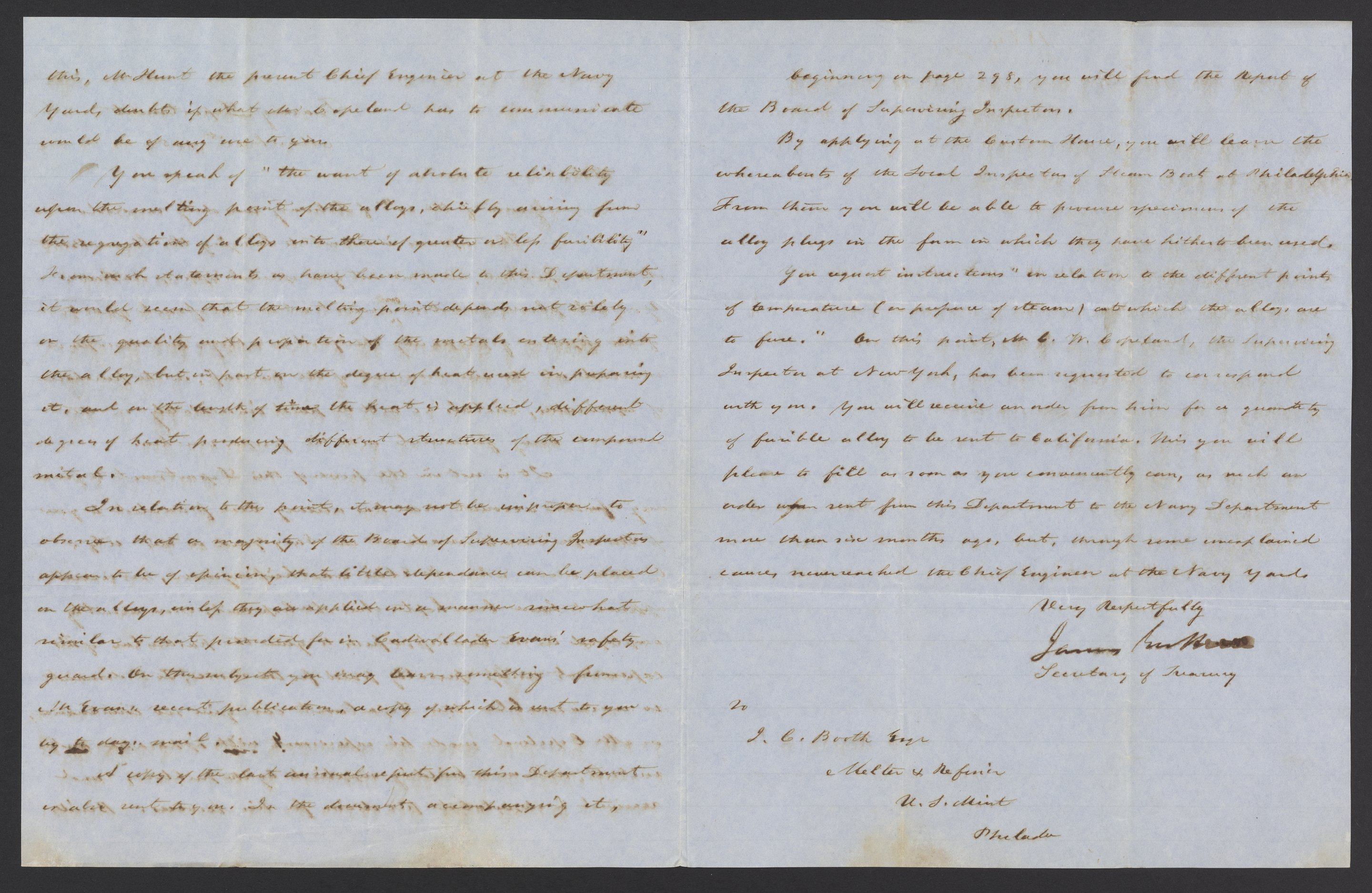 Small JPG1200 x 1517px — 280 KBLarge JPG2880 x 3641px — 1.5 MBFull-sized JPG3296 x 4167px — 1.9 MBOriginal fileTIFF — 3296 x 4167px — 39.4 MBJames B. Guthrie (1792 - 1869), United States Secretary of the Treasury from 1853-1857, writes to James Curtis Booth (1810-1888) outlining what the Treasury expects of Booth in the matter of fusible alloys.