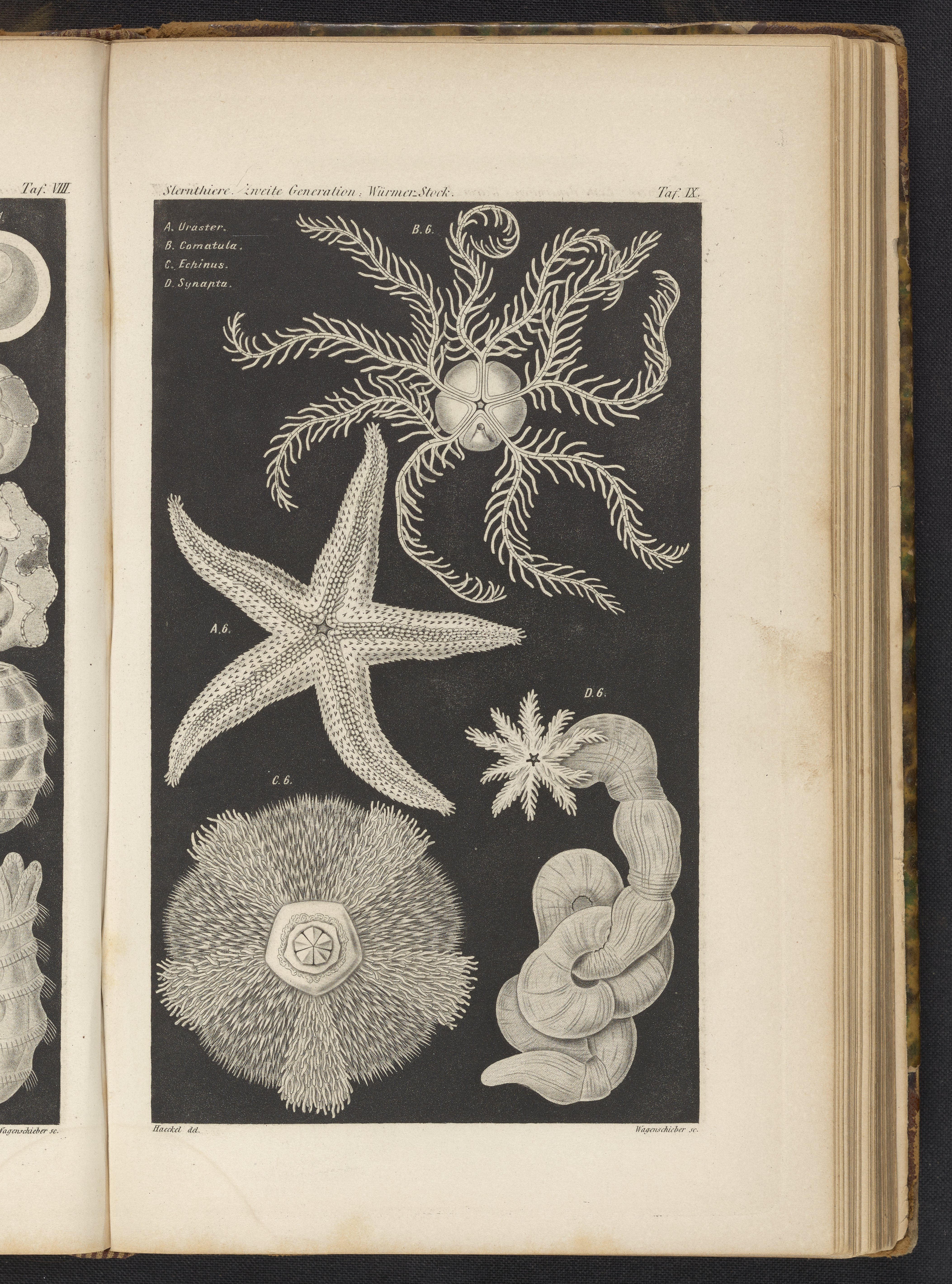 Plate depicts several invertebrates including a starfish (figure A. Uraster), a Comatula (figure B), a sea urchin (figure C echinus), and a sea cucumber (figure D Synapta). Haeckel is known for his descriptive work on marine organisms including radiolarians, poriferans (sponges), and cnidarians (jellyfish, anemones and corals).