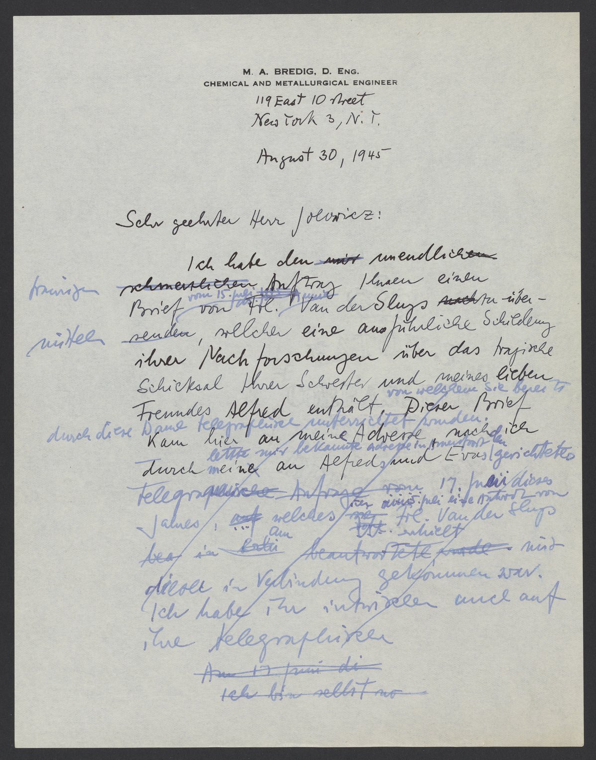 Bredig, Max Albert. “Letter from Max Bredig to Hans Jolowicz, August 30, 1945,” August 30, 1945. Papers of Georg and Max Bredig, Box 9, Folder 9. Science History Institute. Philadelphia. https://digital.sciencehistory.org/works/oujxkp3.