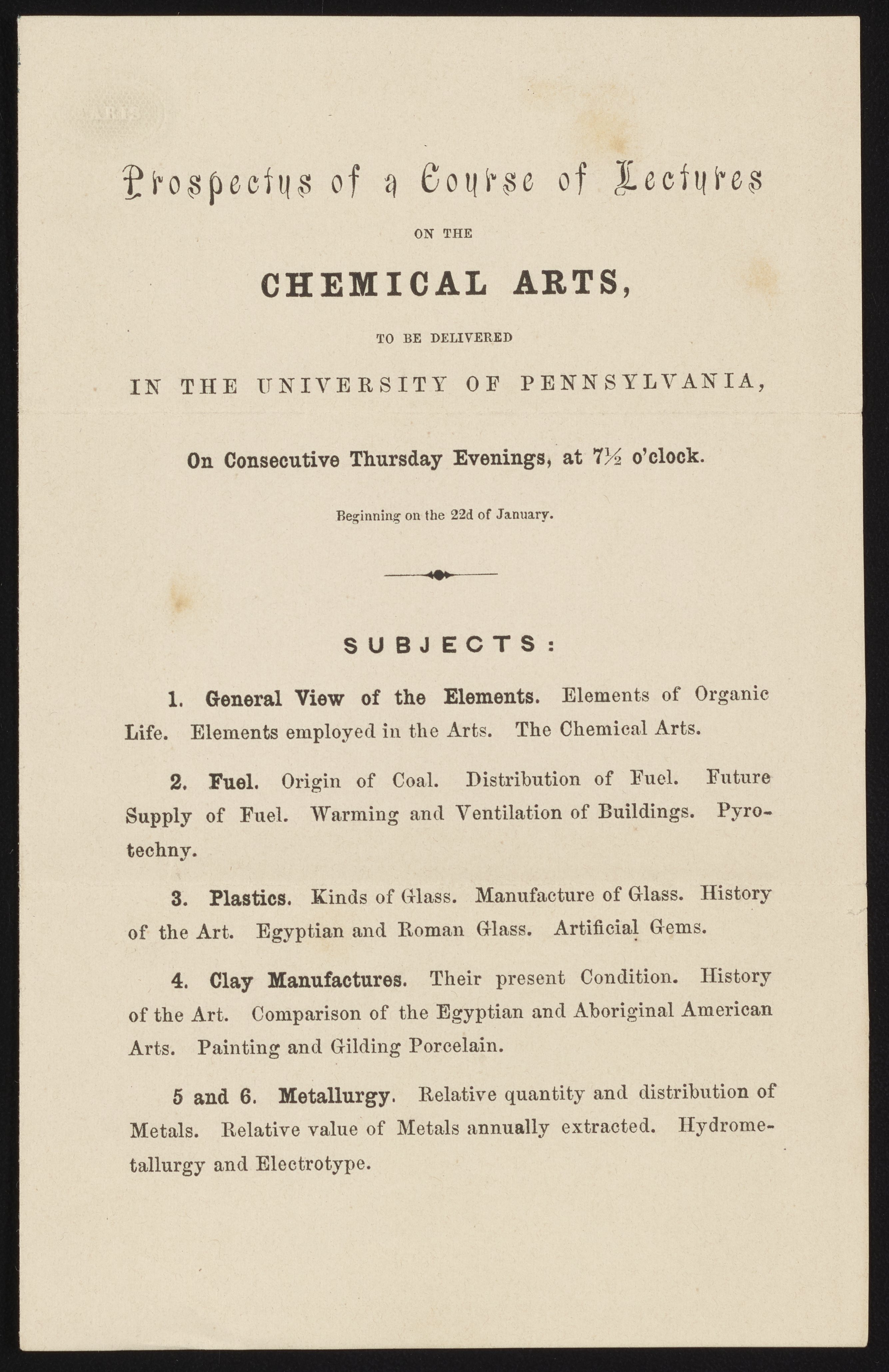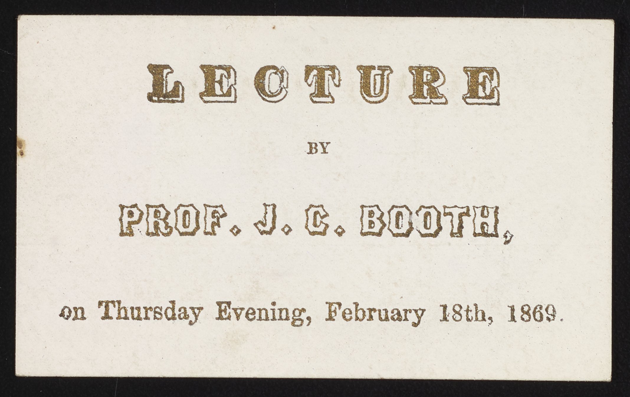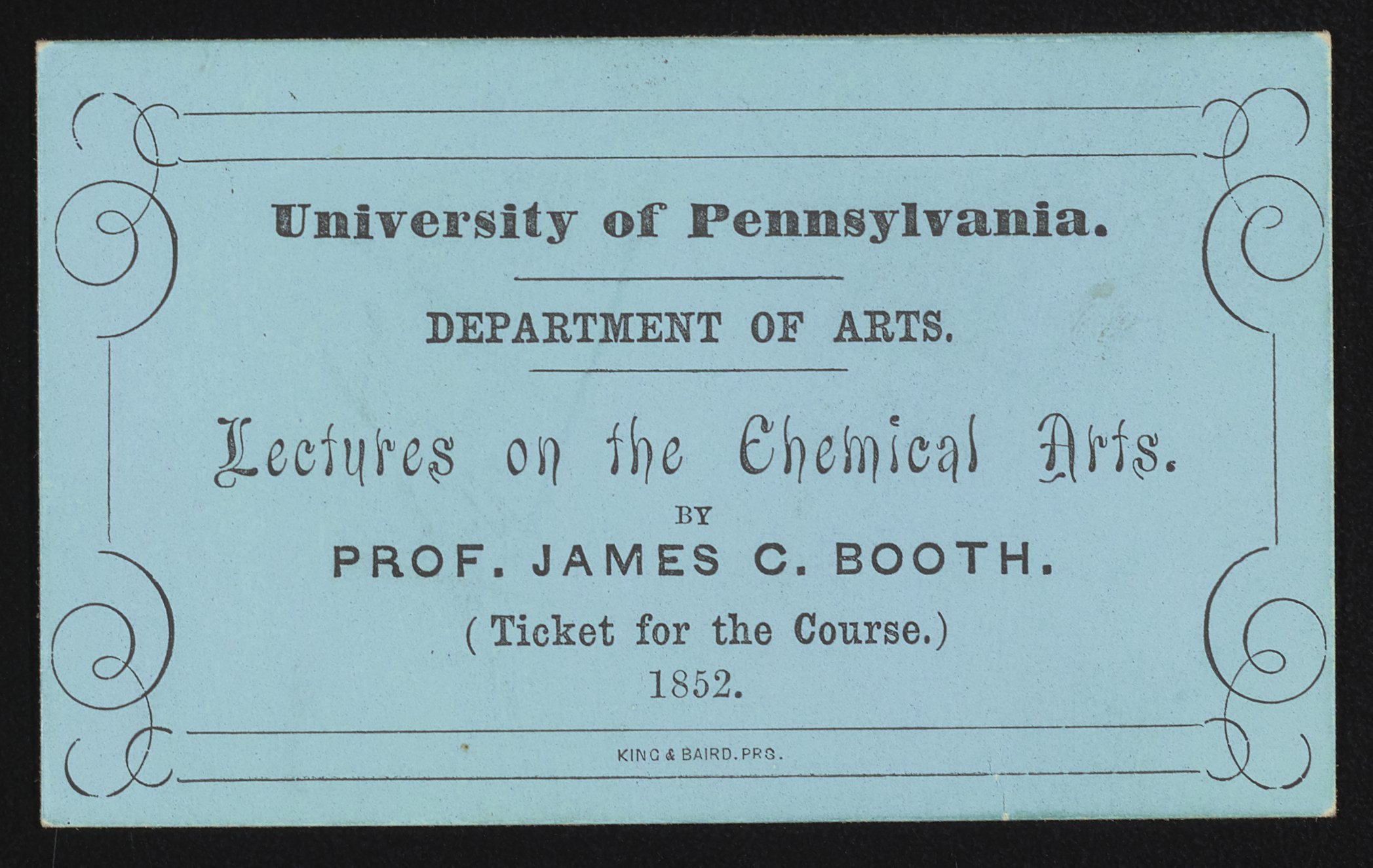 “Lecture Tickets and Announcements,” 1852–1887. Papers of James Curtis Booth, Box 8, Folder 9. Science History Institute. Philadelphia. https://digital.sciencehistory.org/works/ov6wdyw.