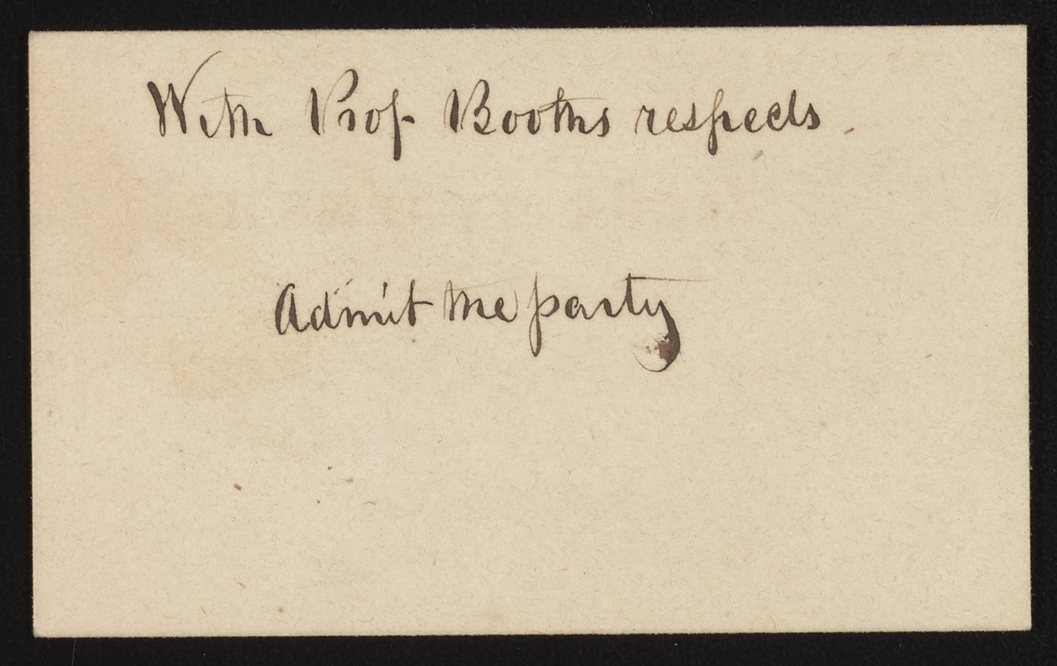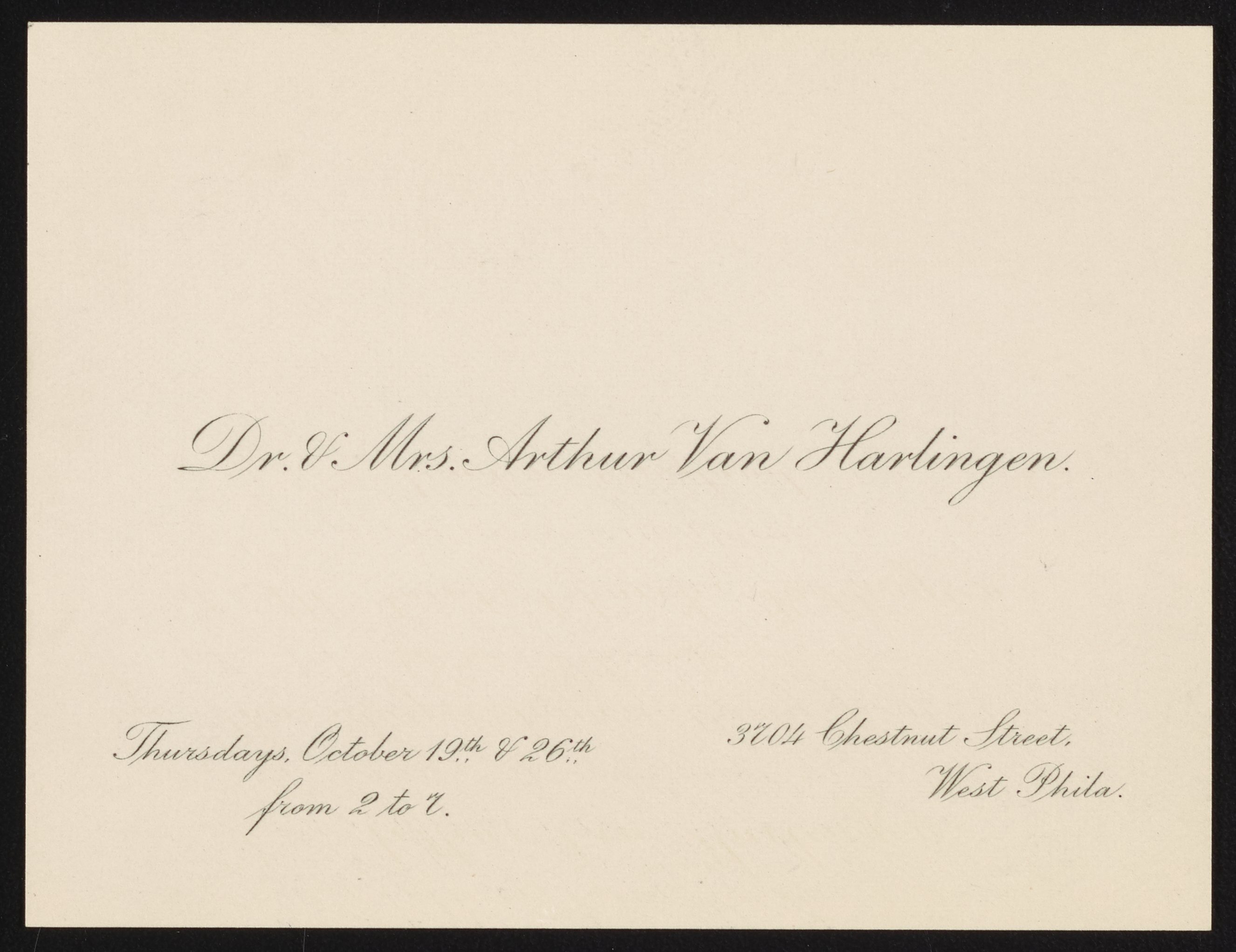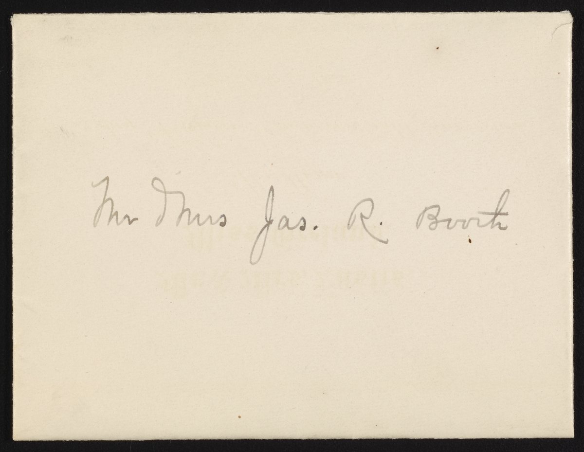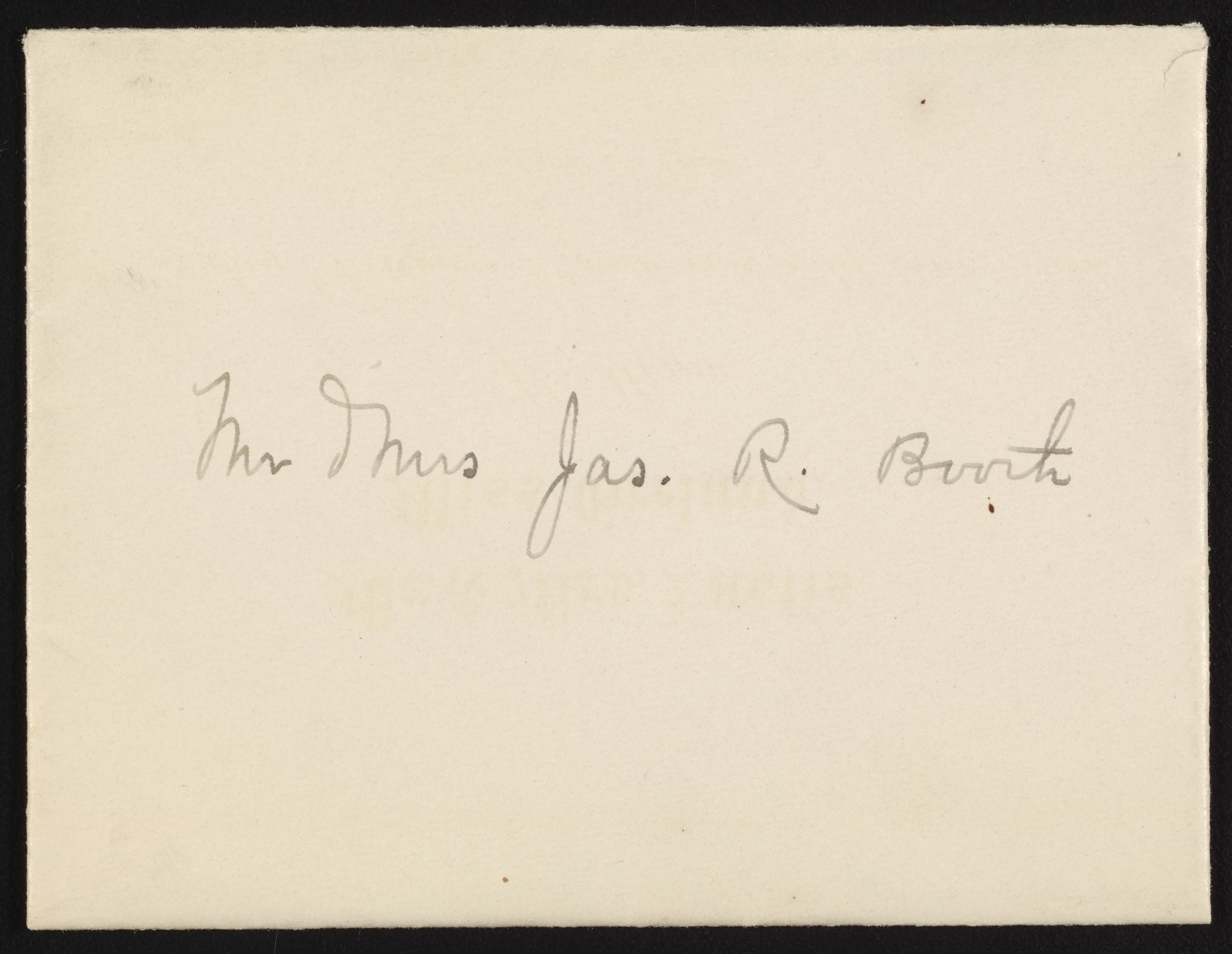 Small JPG1200 x 703px — 91.2 KBFull-sized JPG2812 x 1648px — 416 KBOriginal fileTIFF — 2812 x 1648px — 13.3 MBIncludes two tickets and an announcement for various lectures given by James Curtis Booth (1810-1888) at the University of Pennsylvania, an invitation to the wedding of Bessie and Arthur Van Harlingen, an advertisement for a publication by the Rensselaer Polytechnic Institute, and a calling card for a Mr. and Mrs. Eustis.