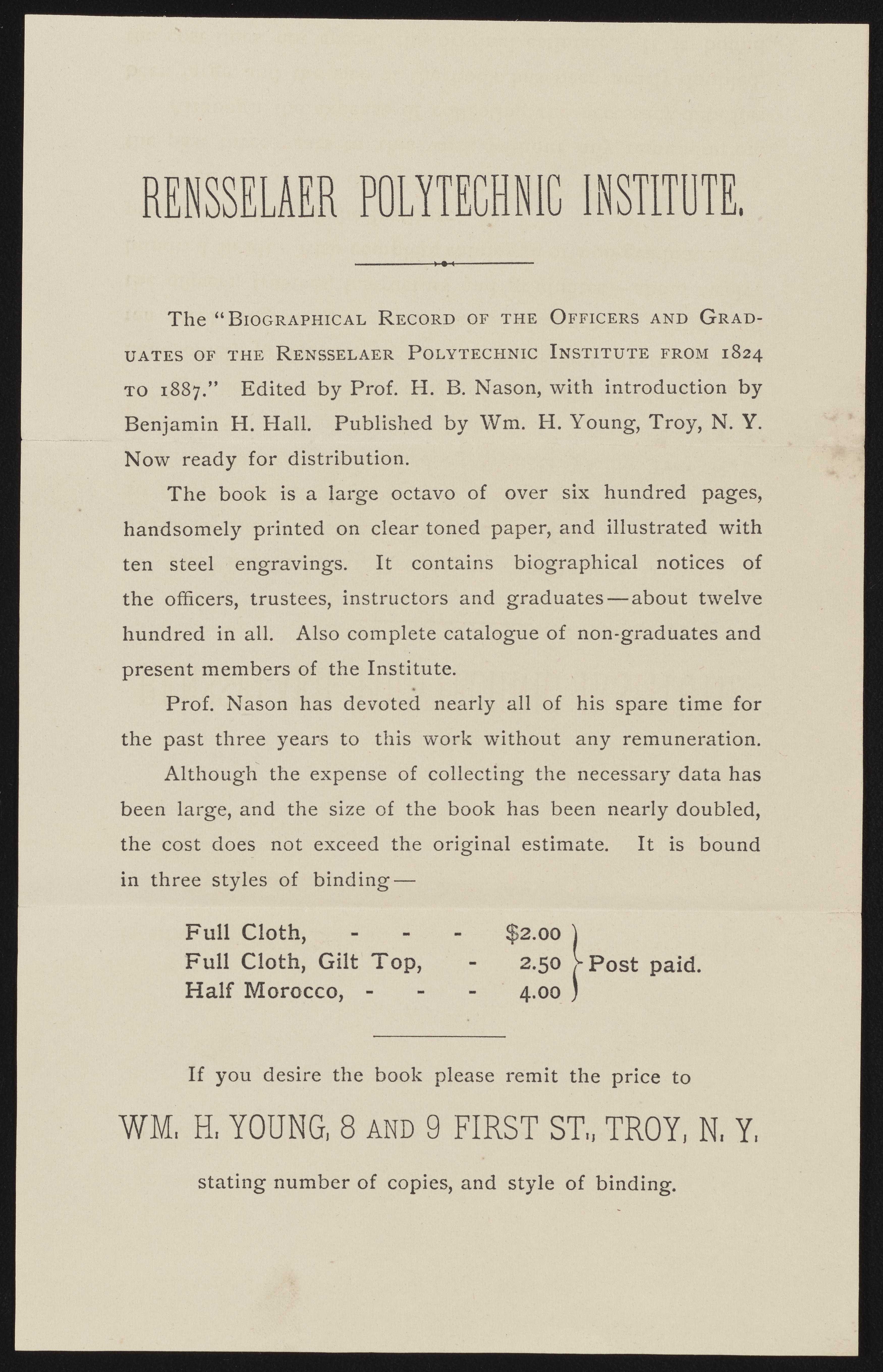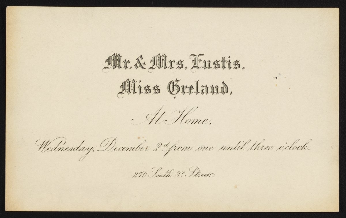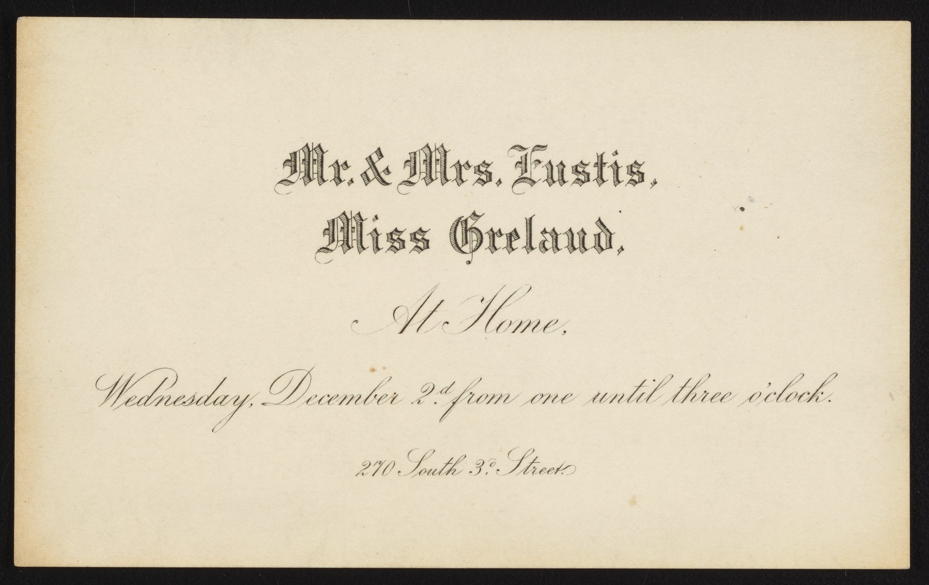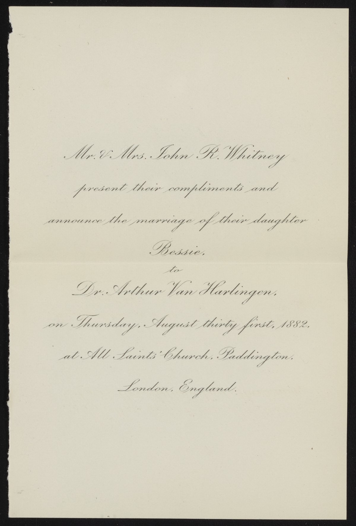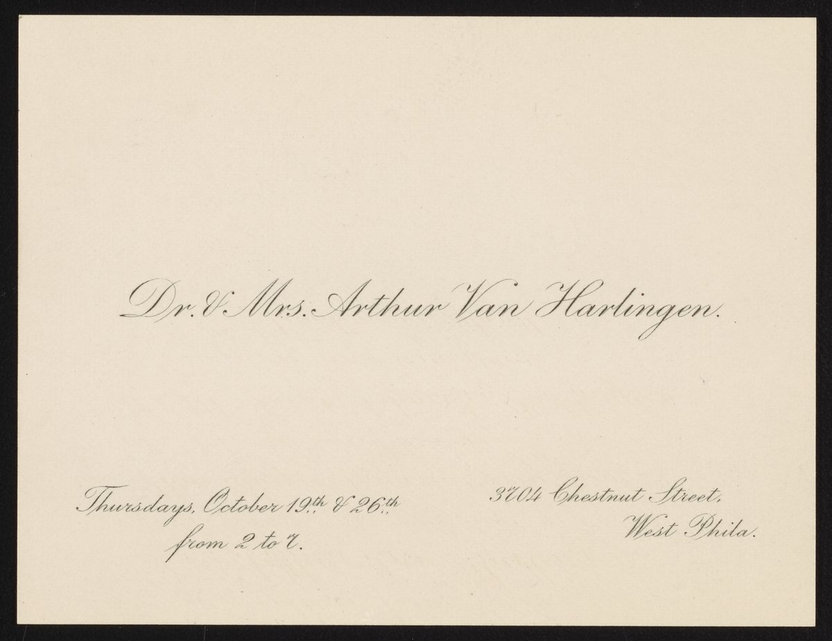 Small JPG1200 x 703px — 91.2 KBFull-sized JPG2812 x 1648px — 416 KBOriginal fileTIFF — 2812 x 1648px — 13.3 MBIncludes two tickets and an announcement for various lectures given by James Curtis Booth (1810-1888) at the University of Pennsylvania, an invitation to the wedding of Bessie and Arthur Van Harlingen, an advertisement for a publication by the Rensselaer Polytechnic Institute, and a calling card for a Mr. and Mrs. Eustis.