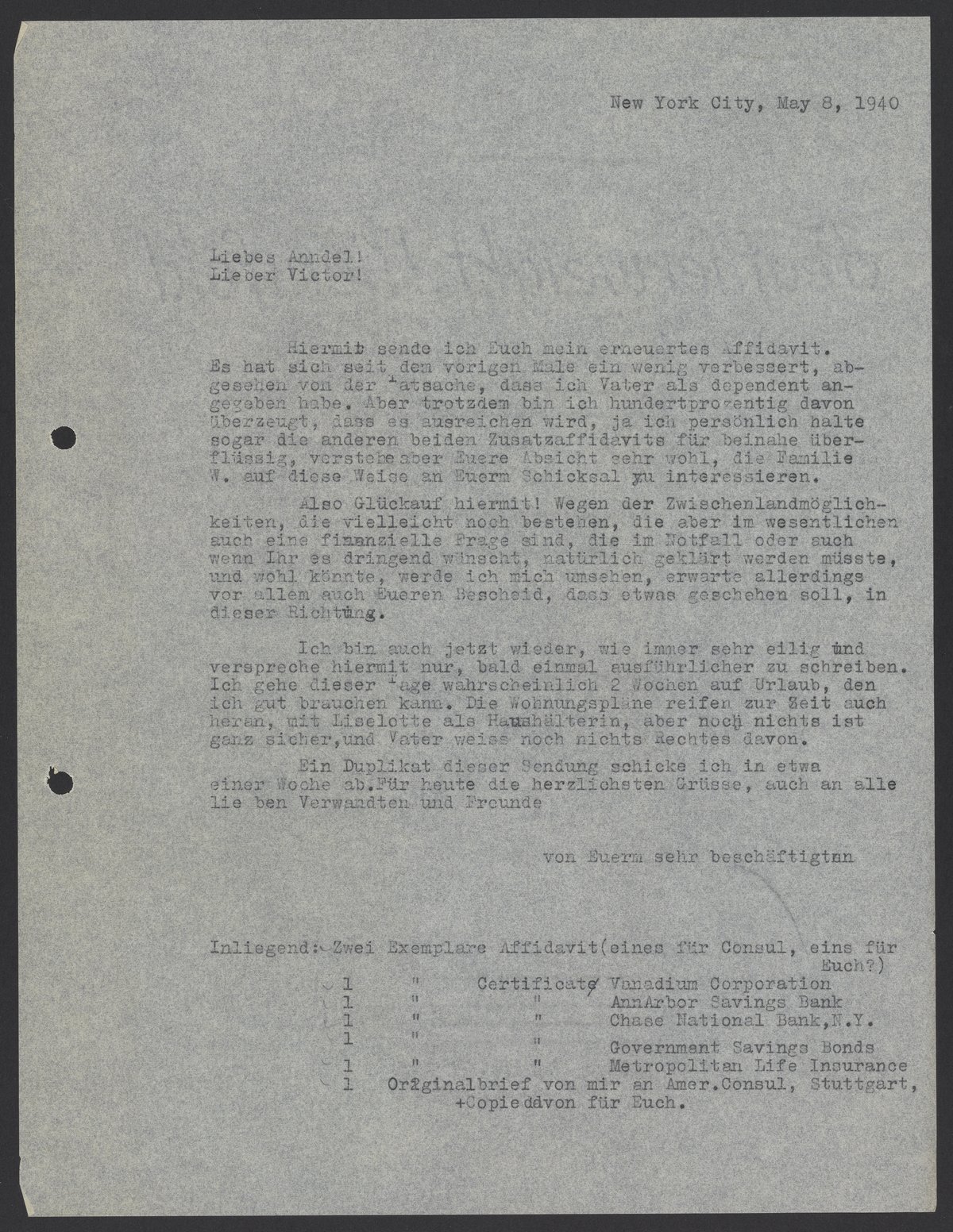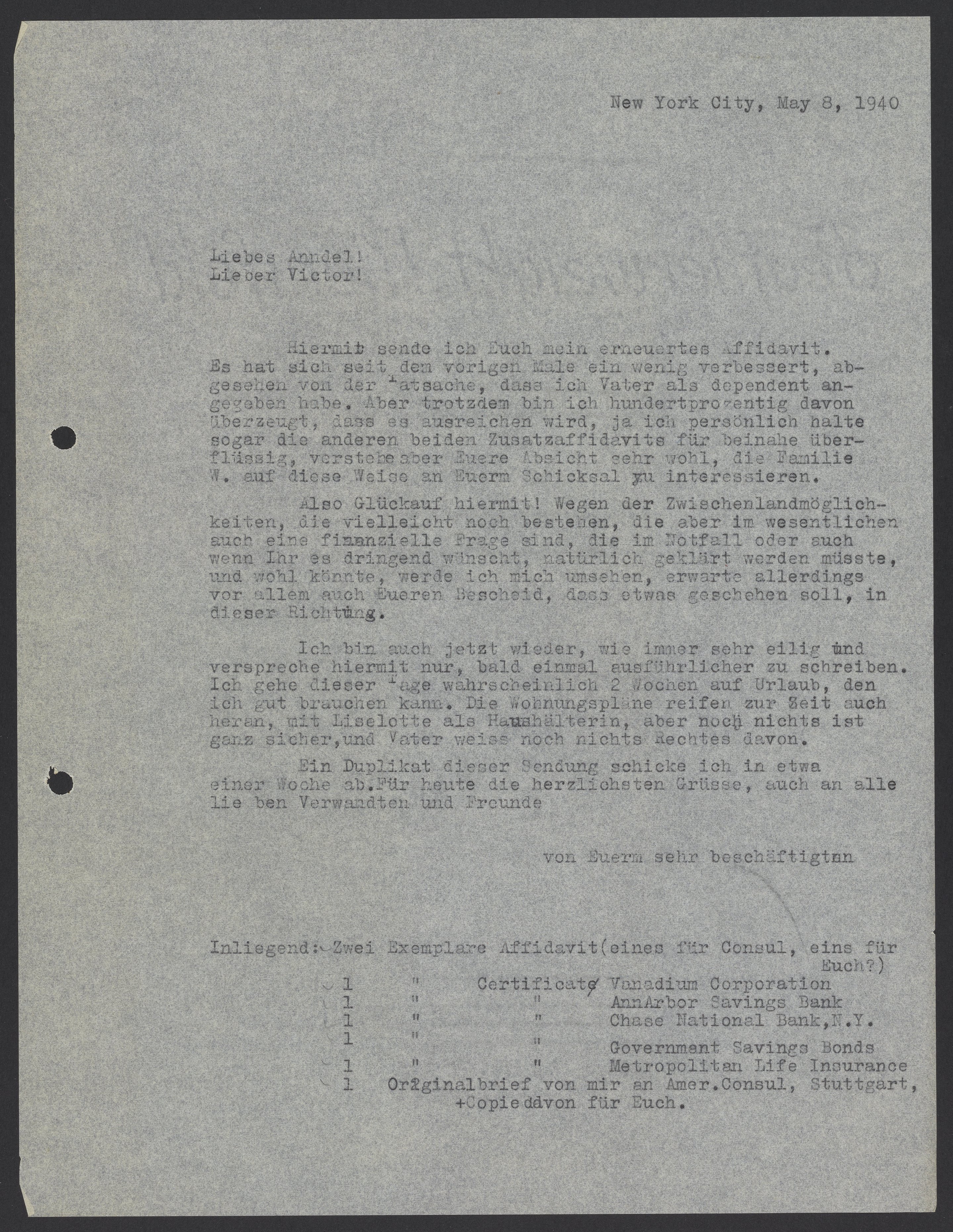 Hiermit sende ich Euch mein erneutes Affidavit. Es hat sich seit dem vorigen Male ein wenig verbessert, abgesehen von der Tatsache, dass ich Vater als dependent angegeben habe. Aber trotzdem bin ich hundertprozentig davon überzeugt, dass es ausreichen wird, ja ich persönlich halte sogar die anderen beiden Zusatzaffidavits für beinahe überflüssig, verstehe aber Euere Absicht sehr wohl, die Familie W. Auf diese Weise an Euerm Schicksal zu interessieren.